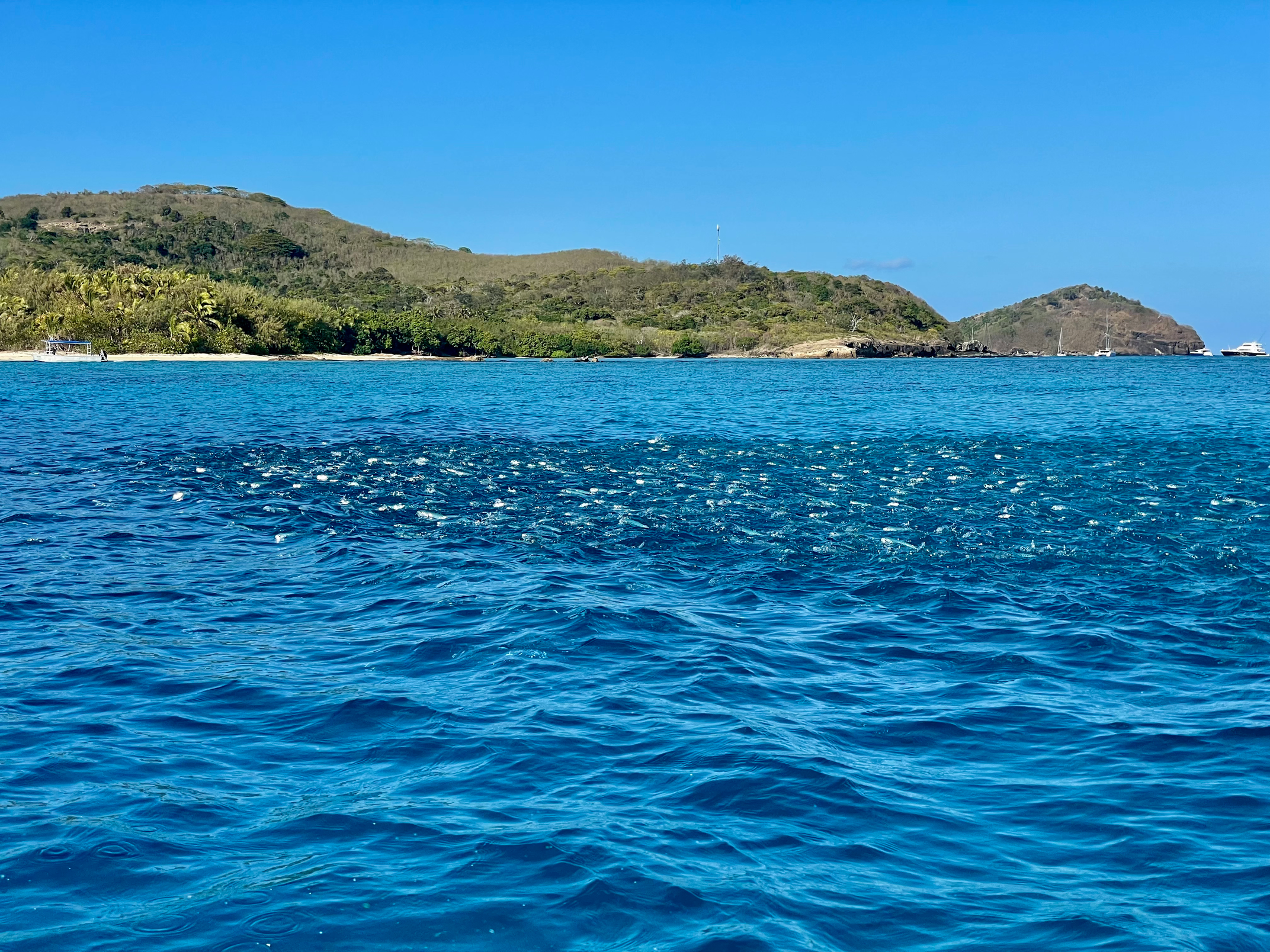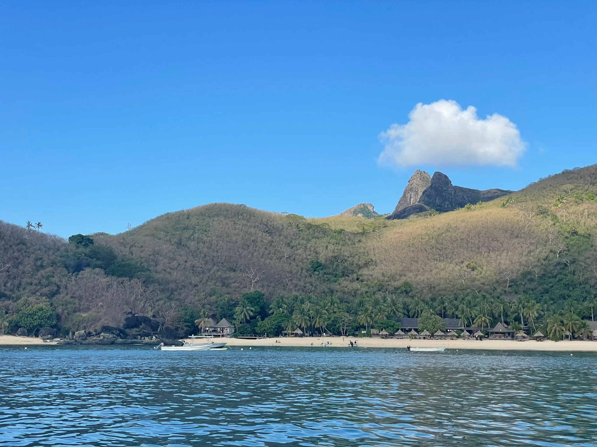 We woke up to find we were the only boat in the bay, the small cruise liner and fishing motor