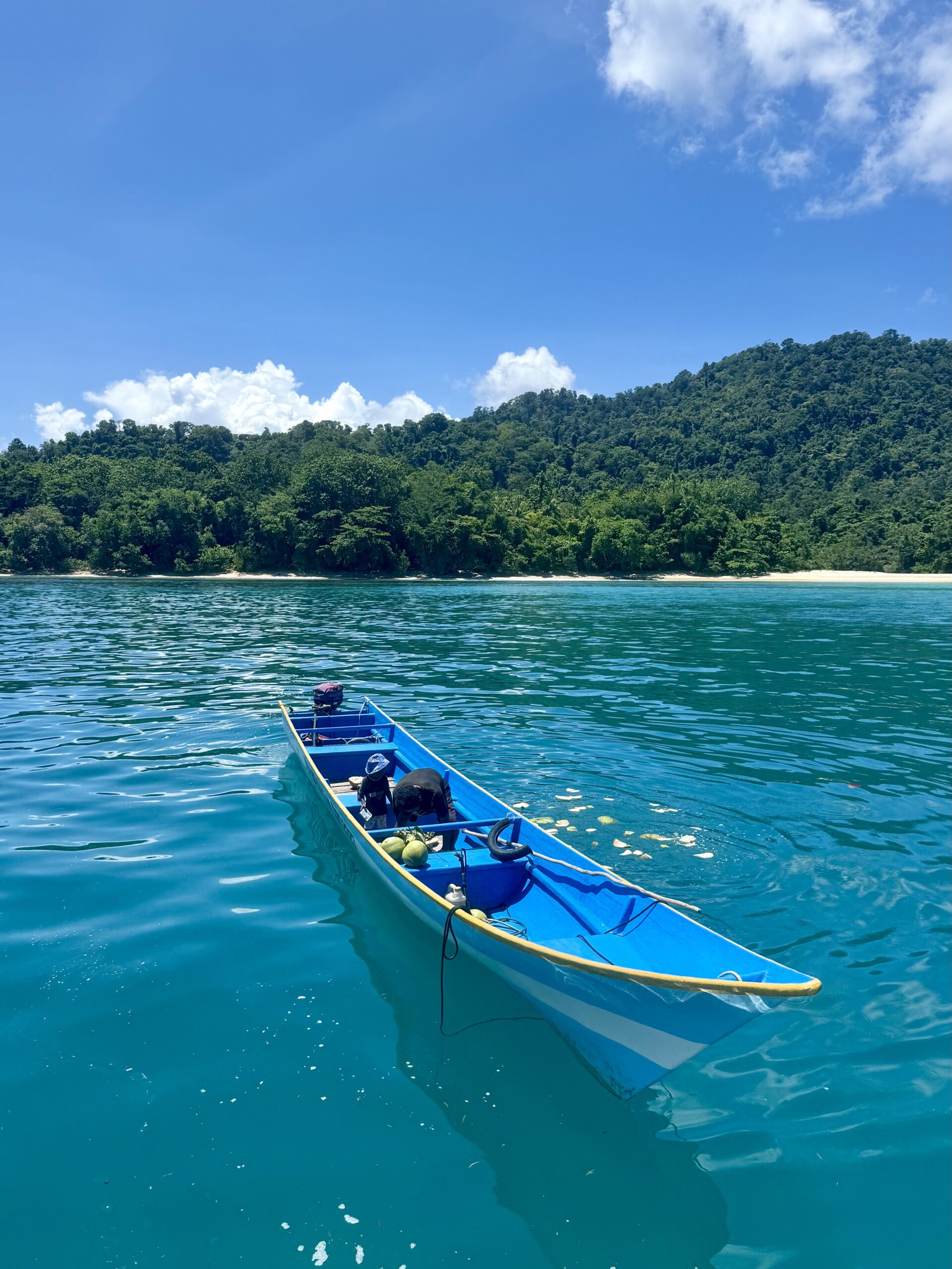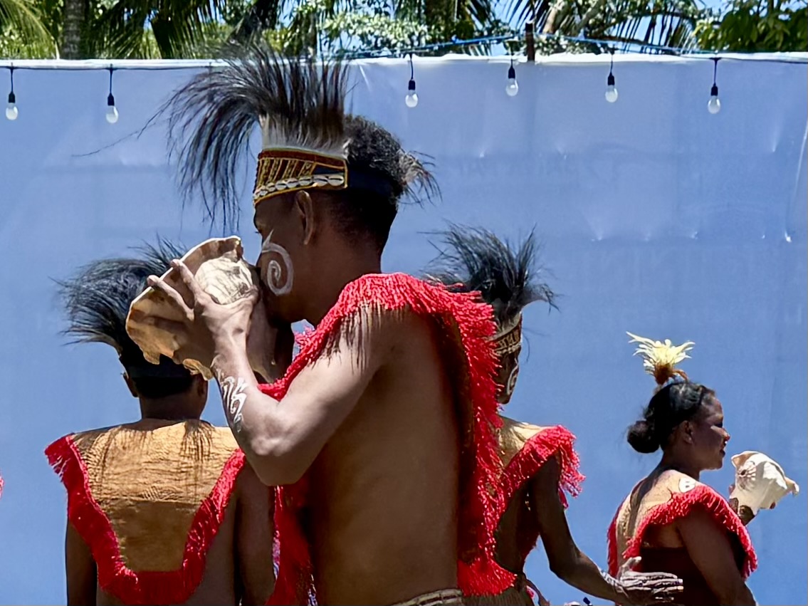We were woken to the sound of conch shells being blown, beating drums and singing. Looking out the cabin window