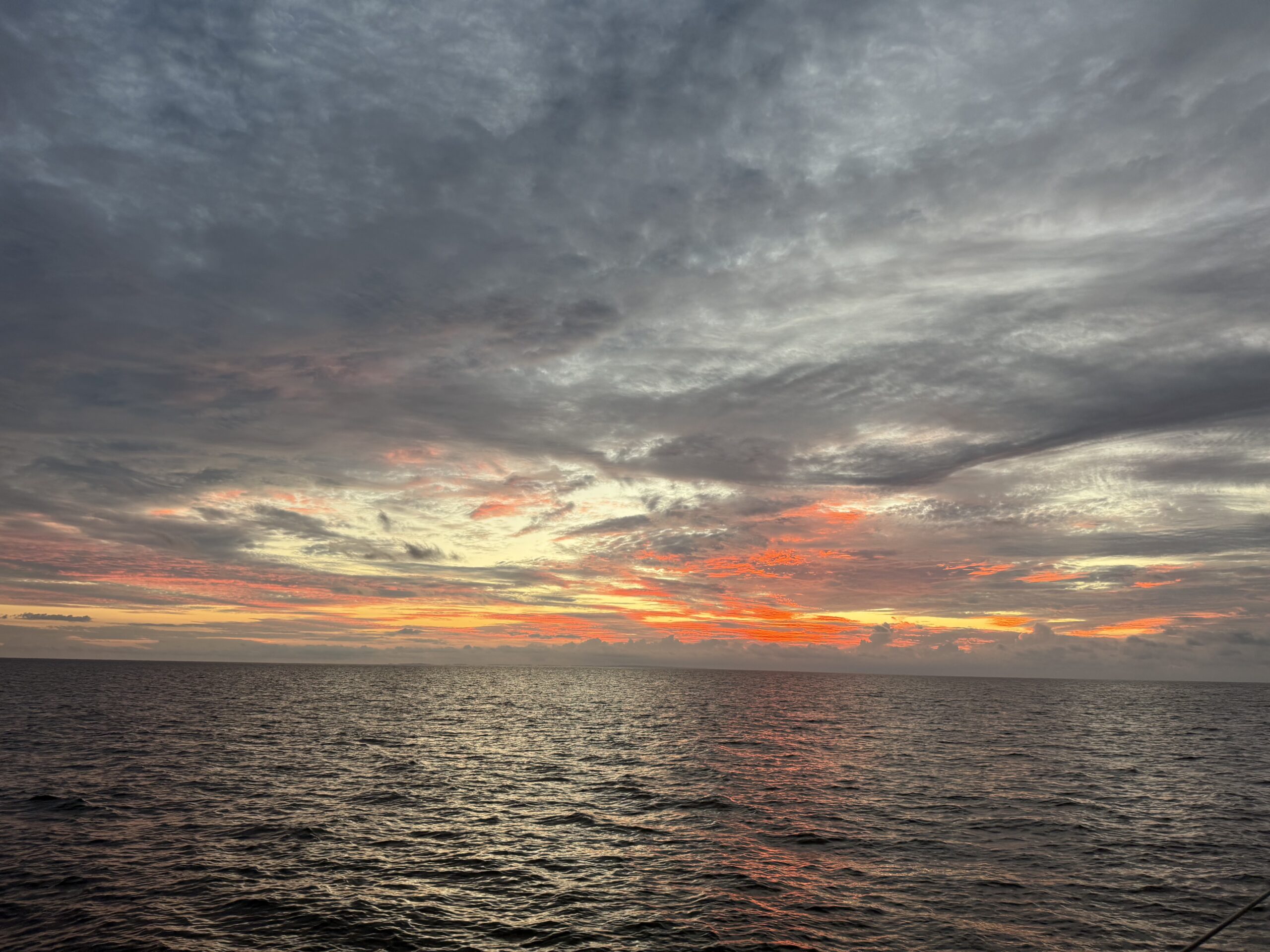 My morning shift included a great red sunrise, with dark clouds but no wind. We motored all last night and