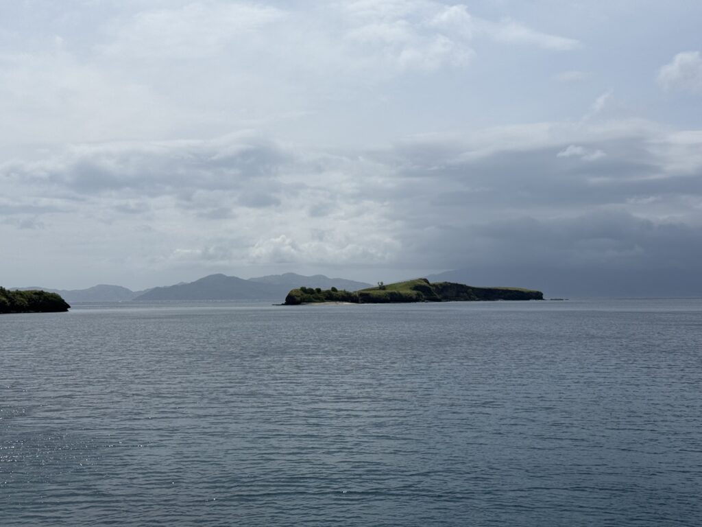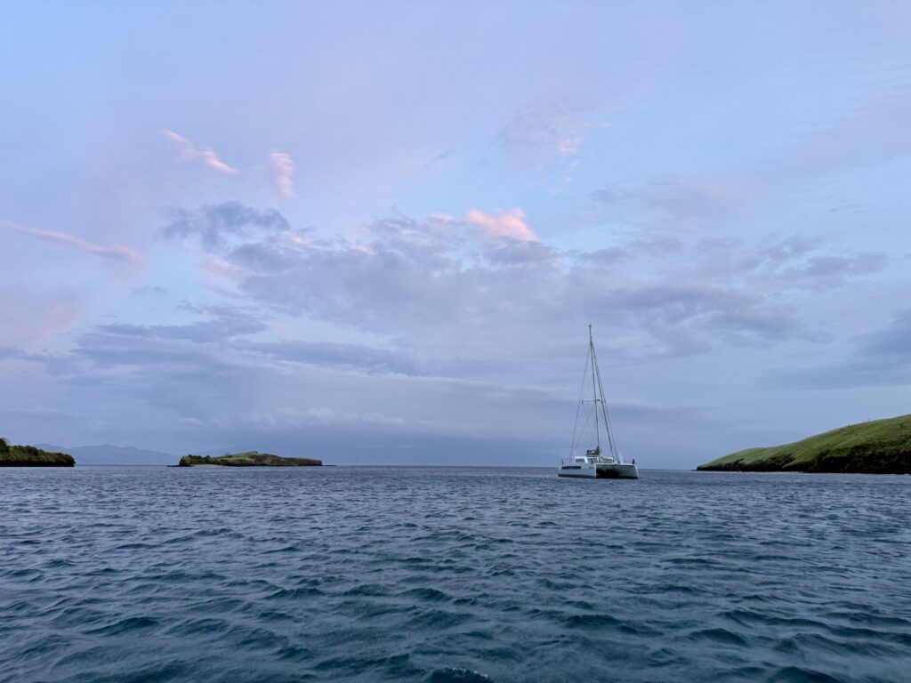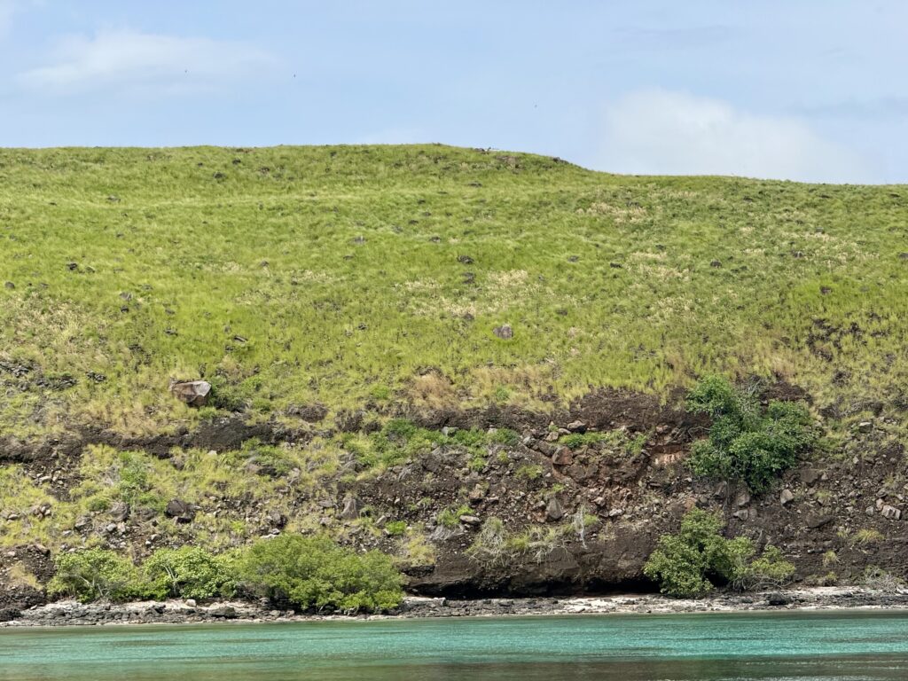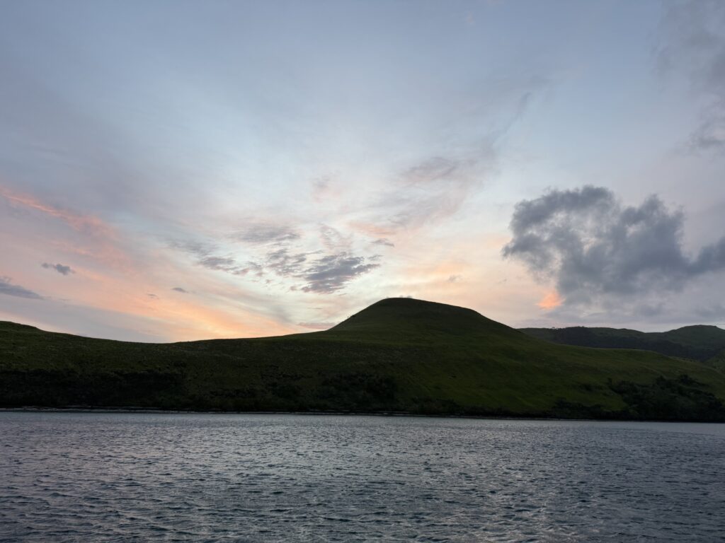 The day sped by without doing too much. Rowan went for a snorkel around the little island next door and said there was some good coral, but little fish life. Seb came around and dropped off some greens he had foraged which was very kind of him. He invited us to climb the hill with him this afternoon, I wasn’t too keen in this heat and absolutely no shade. Also when you look through the binoculars it is solid volcanic rubble, so not very nice for walking up or down. We had a local boat in the bay and saw a man walking along the skyline with long poles. We discovered later they were trapping birds in nets, which is so sad. The fish have been plundered and now the birdlife. The poor old sea eagle who is soaring about is going to struggle to compete for food.