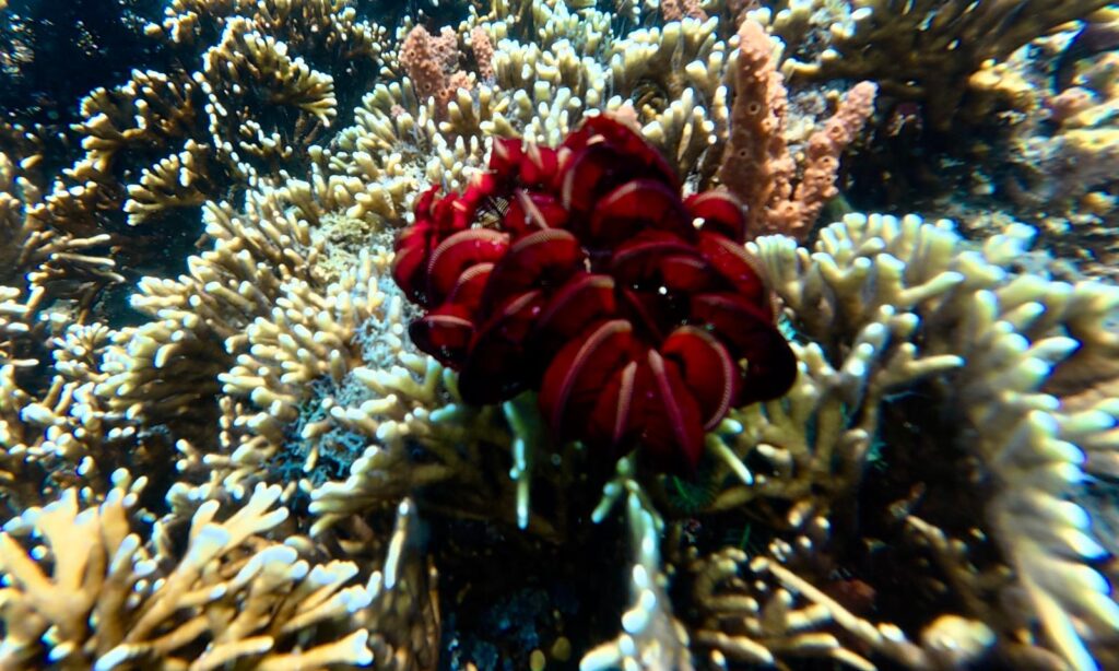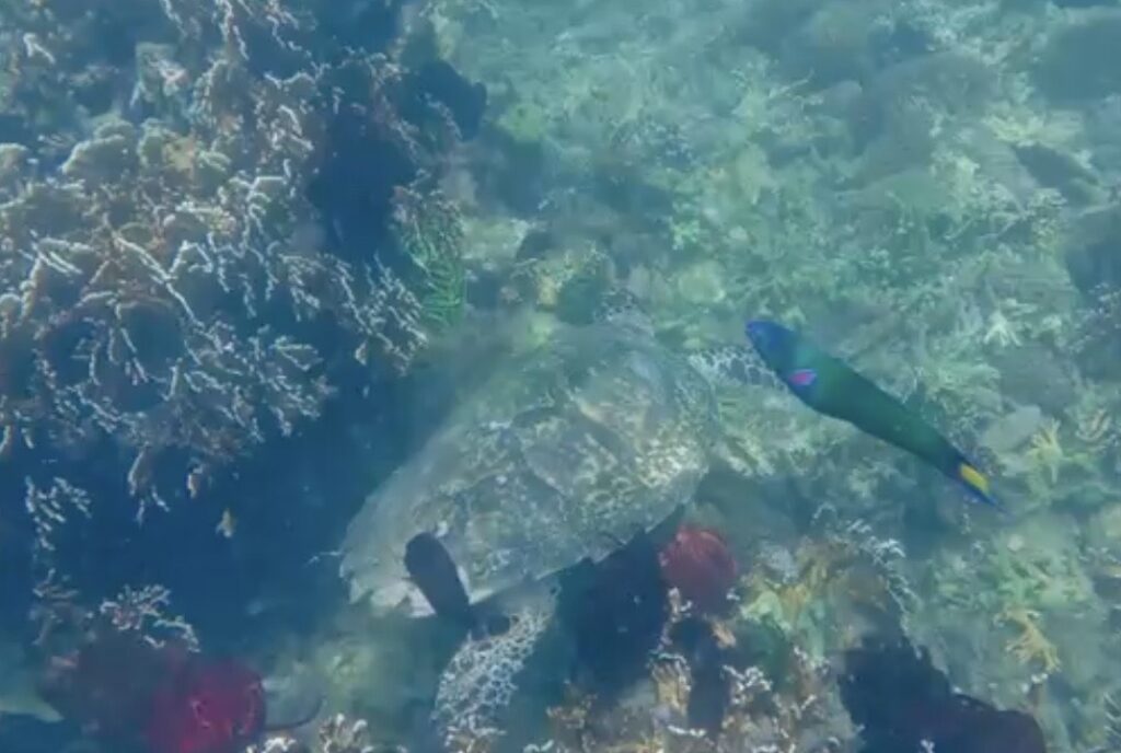 We had a snorkel on the way home at a different spot that had another abandoned resort on it. The coral was pretty good, the visibility was better, but only small fish and not many. The beach had lovely shells. There are a lot of pearl farms about, not obvious where they operate out of, but the sea is covered in their buoys. Even though we were feeling a little full after a big lunch we headed out for supper, we are pretty low on fresh vegetables. The Nautilus resort restaurant came highly recommended, even though it is mainly Italian food we had to try it, it turned out to be a very good meal, Rowan and I shared a delicious pizza and a greek salad! All very tasty.