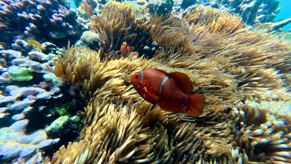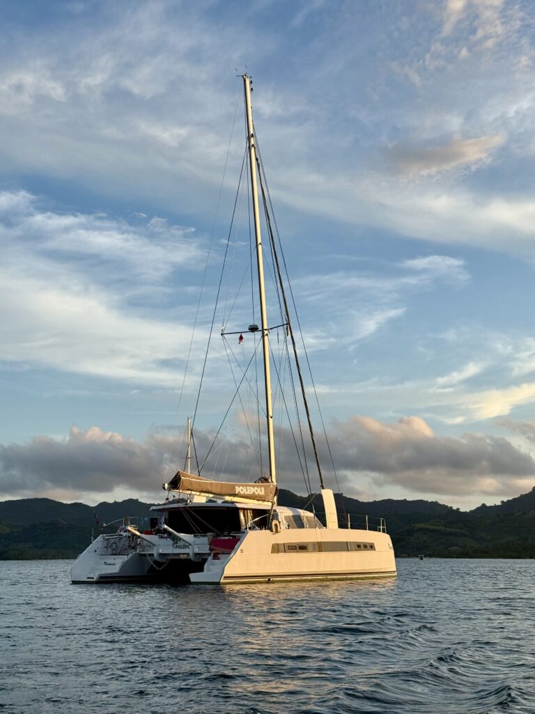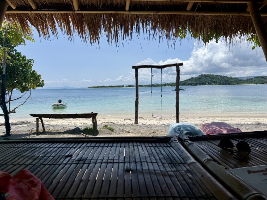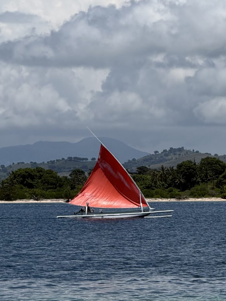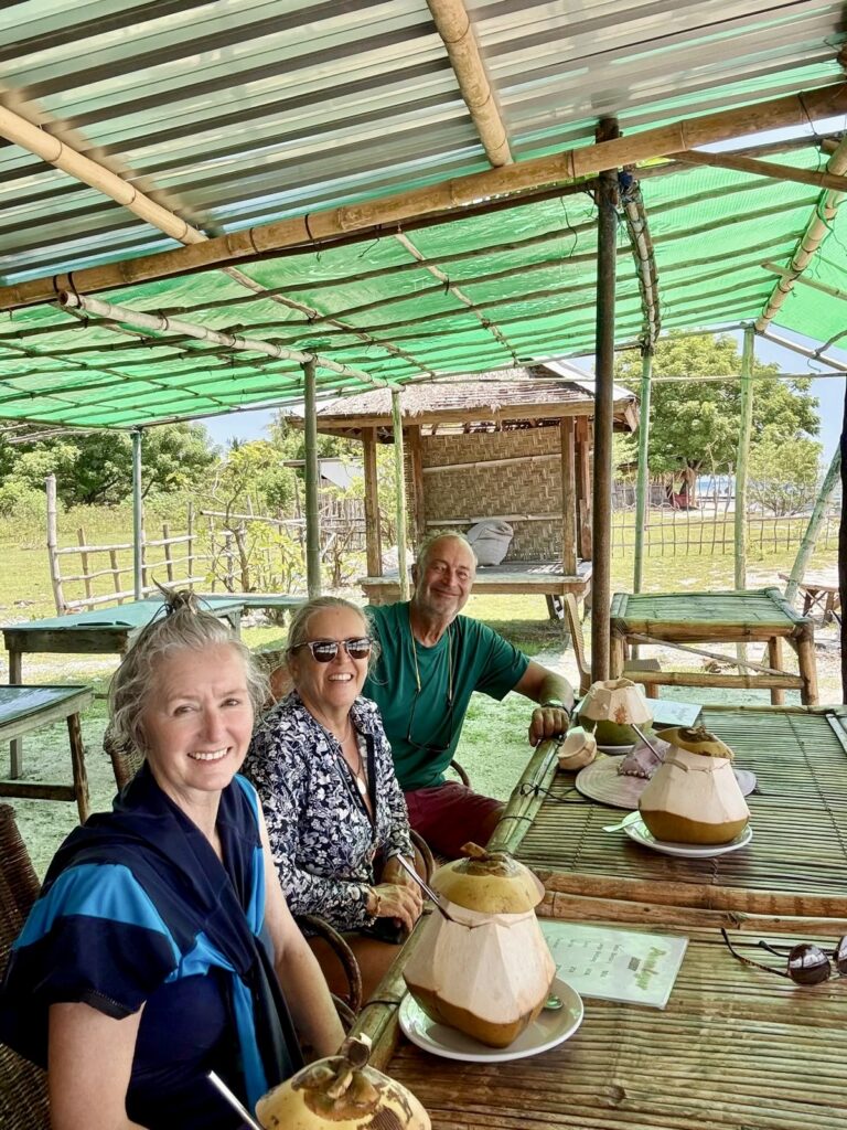 We went snorkelling as soon we had finished breakfast to catch the sunlight. We went quite far in the dinghy, sadly there was a lot of rubbish in the current at the first couple of spots we tried. We saw some dive boats at some little islands further afield and landed up having a reasonable snorkel, some fish and bits of reasonable coral. We stopped at an island with some local stalls selling refreshments, it was a big set up, there was nobody there but must cater for peak season crowds. We sat down and each had a delicious coconut to drink, while we were relaxing on their bean bags in the shade the smell of cooking spices and coconut caught us, it didn’t take long for us to decide to stay for lunch. We had delicious vegetable curries all served with rice, tempe, tofu and spring rolls. It was a very good meal which we all enjoyed.