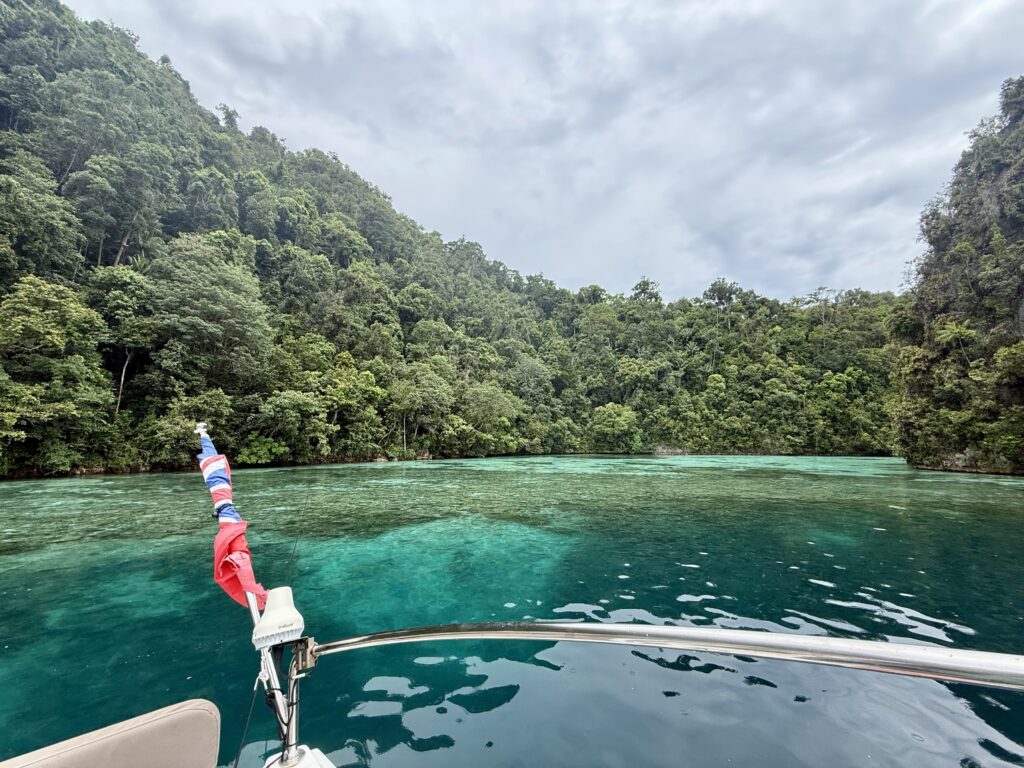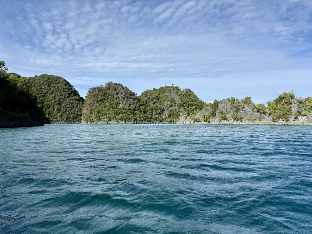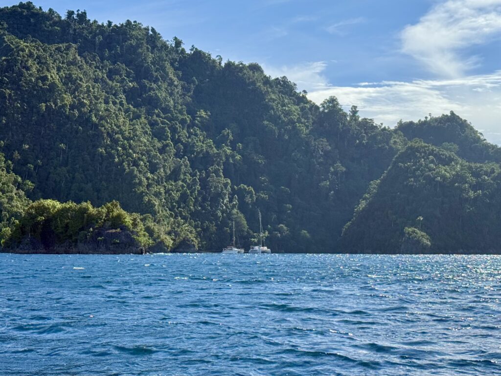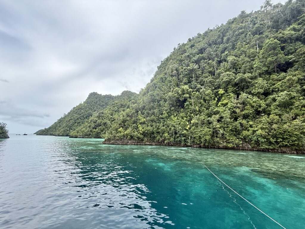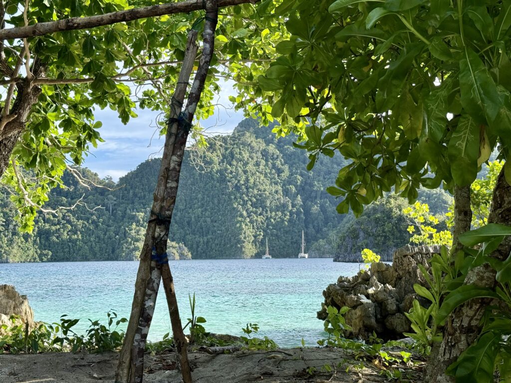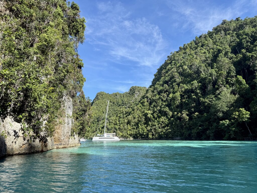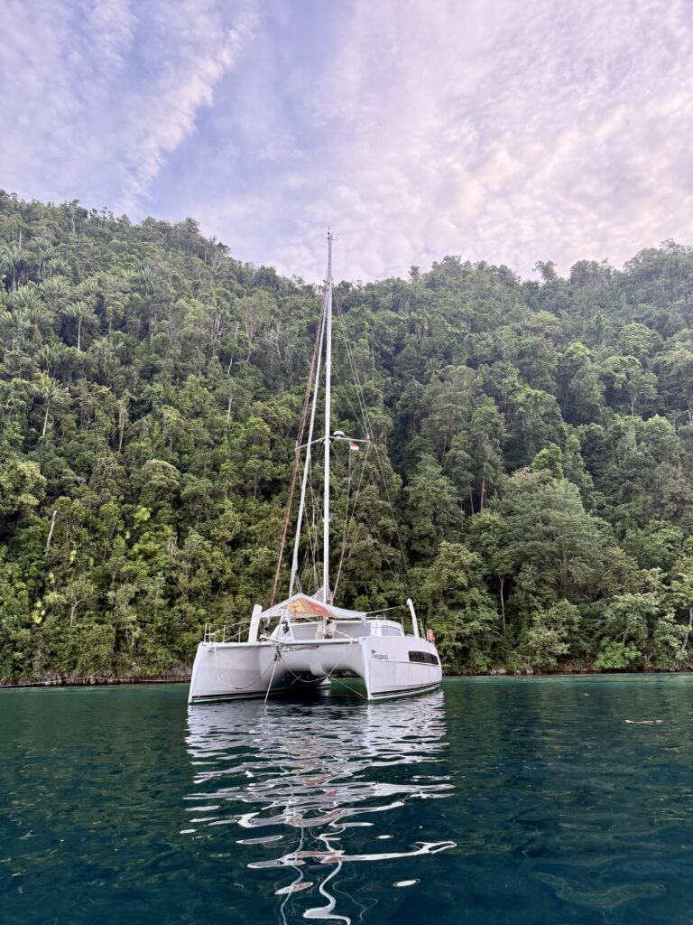 We decided we did not want to stay here for the next two days waiting for our provisions, it was perfectly alright but nothing special, so we headed about 10 miles south to Waybatan island which has loads of good snorkelling spots. Rowan had got in contact with an Australian guy anchored there who said he would help us with stern ropes in the little anchorage where they were. It was a motor across even though there was good wind, it was from the wrong direction. It was a pretty tricky anchorage, we had to get in between two islands which had reef on either side. Just space for us to turn around next to Rob’s catamaran. Then we reversed in after dropping the anchor. Thank goodness it was so well protected from the wind outside, as it was very tight. Rob got our stern lines tied on no problem, we invited him and his wife Pip over for tea and cookies. They are from Western Australia, they’ve lived in their old Catamaran for 5 years and have just sailed it up to explore Indonesia having retired from his job as a tug driver. No wonder he wasn’t daunted by the anchorage!