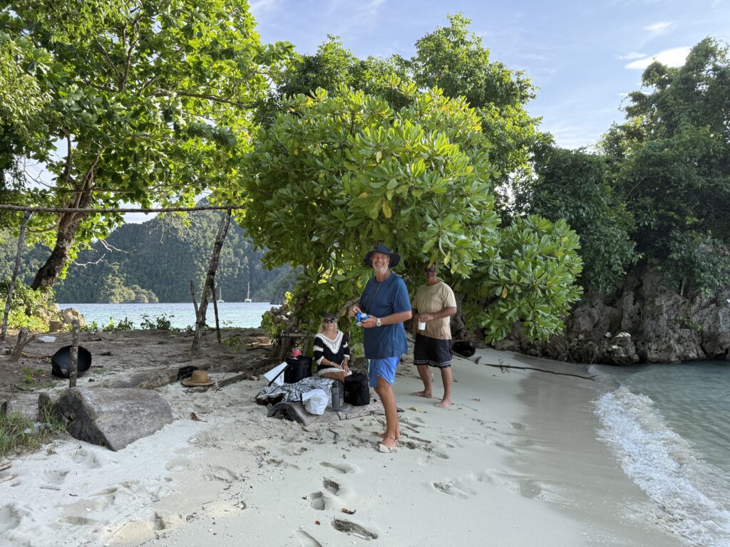 We went and had a good snorkel in the afternoon, it was pretty choppy with the wind, so the visibility was not the greatest, but there was great fish life and coral. Rob and Pip invited us to join them on their afternoon ritual of going to a little beach at 4pm for sundowner drinks. It was very pleasant even though they said this was the windiest day by far in the 7 days they have been here. The cyclone off Australia seems to be affecting the weather here. Turns out they brew all their own alcohol, they have a distiller on board, he makes whisky (with flavouring) and she makes Vodka. I guess it keeps the cost down! We had some calls to make so we were back on the boat by 6:30pm, just as well as rain arrived.