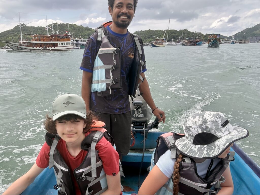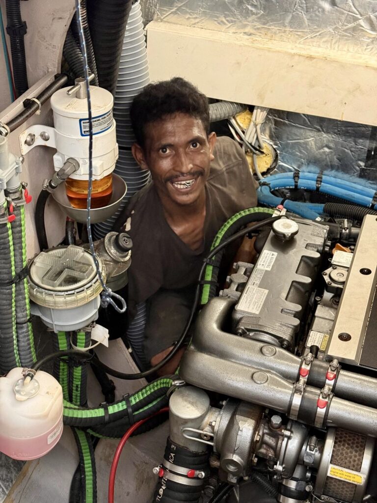 We decided that Dulcie and I should head into town with the kids, so that Rowan has room to concentrate and Jonny can recover in peace. We got a water taxi in as Rowan needed the dinghy to ferry the mechanic back and forth, and to get spares if needed. We had a late lunch at a very good burger restaurant, the kids needed something they could eat as the food they eat is pretty limited and Arthur is stick thin, the burgers went down very well and ice creams afterwards! We felt a bit guilty eating as we were right next to the mosque, the Imam was calling to prayer which meant a stream of Muslims going by who must all have been fasting for Ramadan. We met Rowan in town at around 5pm and he took us back with the mechanic who Rowan introduced as Dim, we subsequently learnt his name was Din! He was anything but dim, he managed to get the starter motor off and had gone back into town with Rowan to check it was working ok which it was. Poor Din was with us until after the sun set, at least we could give him a glass of water to break his fast. How he could survive all day in this heat with no liquids is baffling, especially in a hot engine locker in full sun. Incredible! He finally worked out the battery had some charge but not enough to start the engine. Tomorrow they will hopefully get a new battery in town.