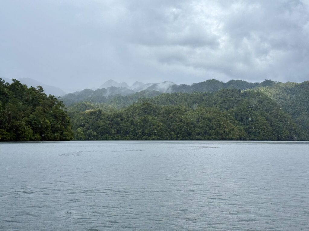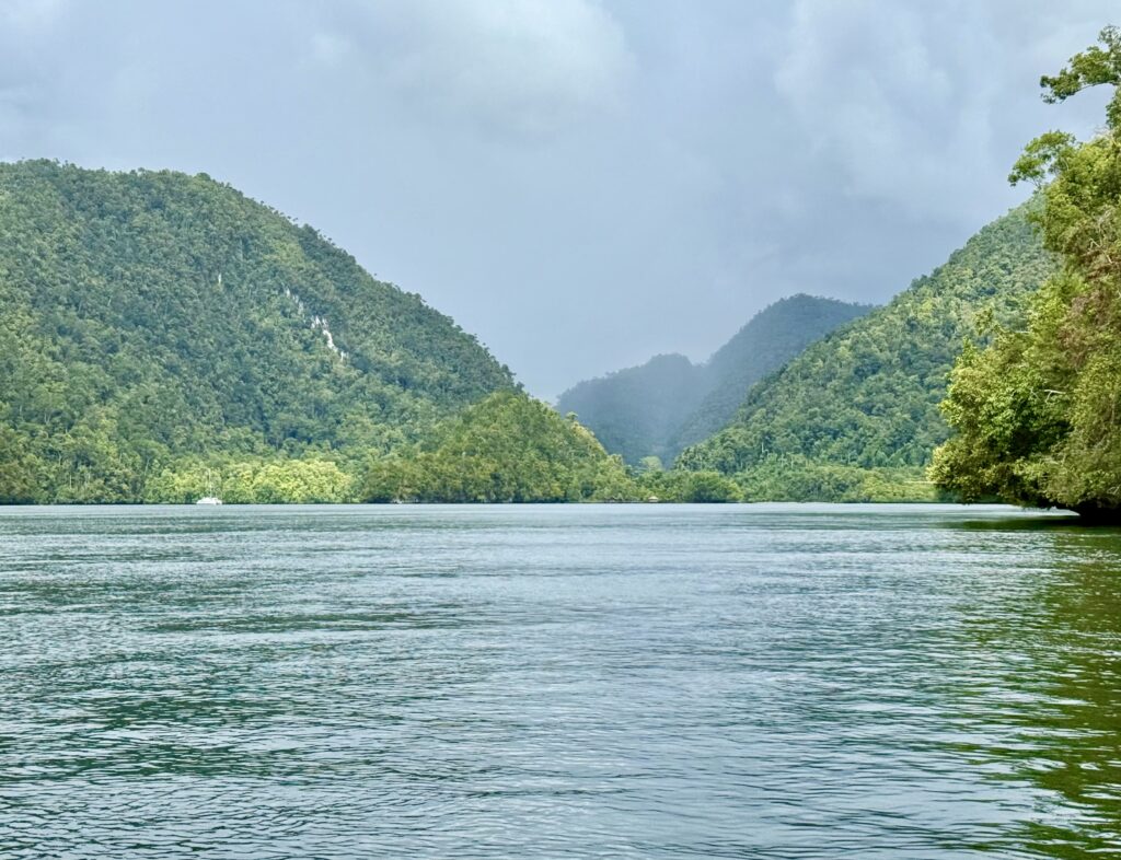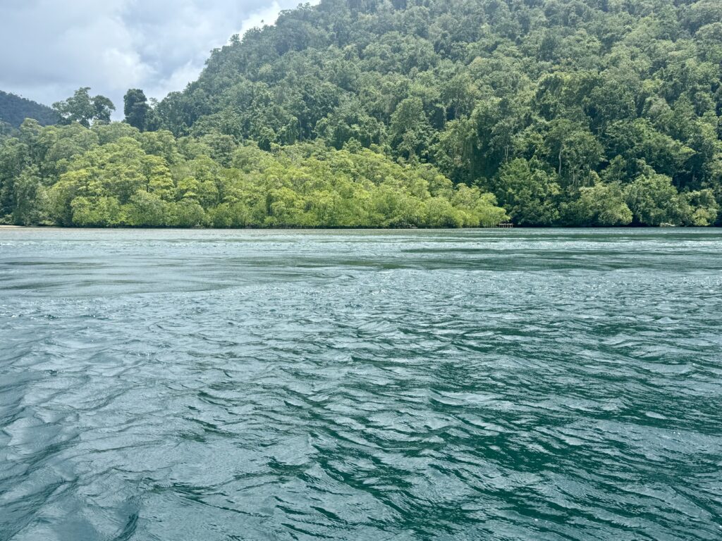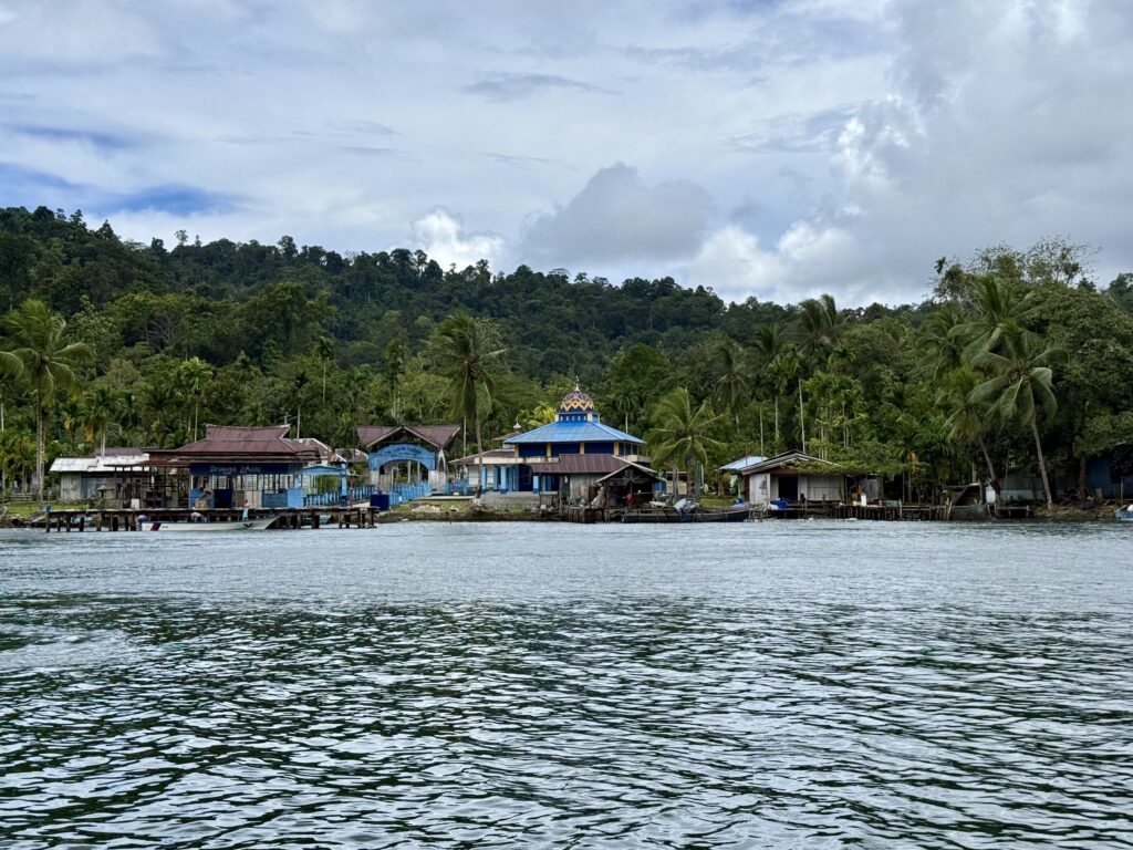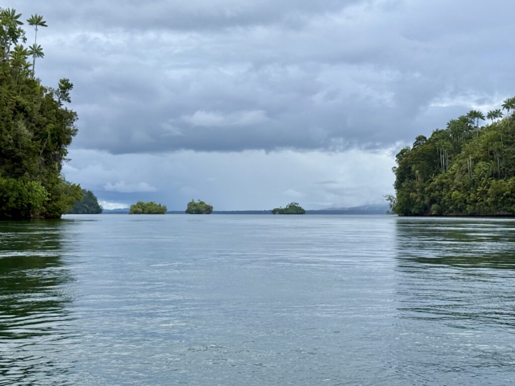 We got back into JeldiJeldi and decided to go and explore towards the big expanse of water, which I will call a lake from here on, that the river runs into. I am not sure if you can call this a river it is more like a big inland bay. We came to a point where we could take a little side river or go straight to the big lake, it looked like it might rain, so we took the left fork as we thought the lake would get choppy. It was a lovely cruise along the river, passing a Muslim village with a mosque, so different to the other village. It felt like it was getting more remote, and certainly we did not see a single boat, the other fork has quite a bit of boat traffic on it as there are 8 villages on the big lake. We went as far as we could to see the entrance to the lake and then turned around as the sky got darker. We came around the corner and saw Pole Pole just as the rain arrived, it was pretty good timing.
