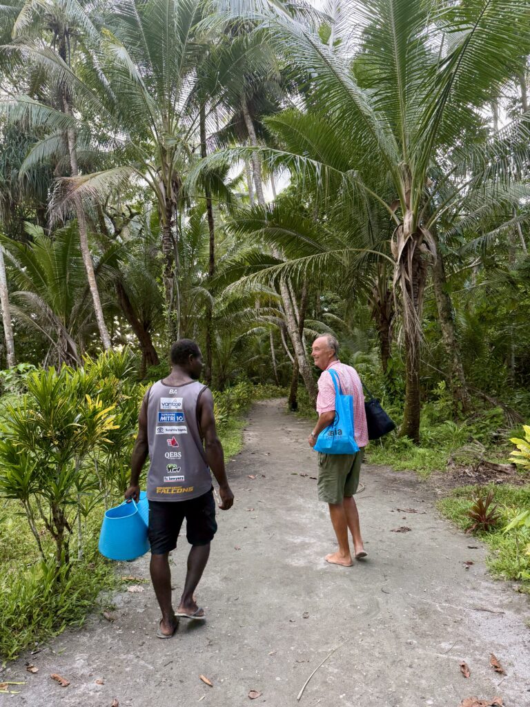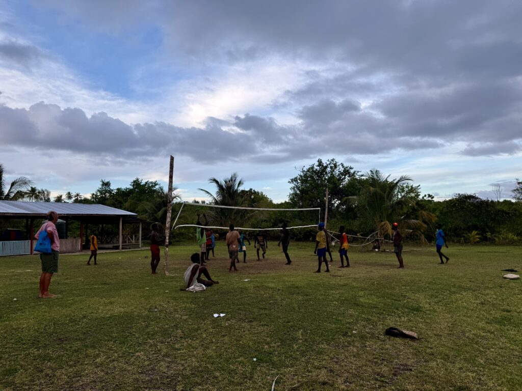 We had a good afternoon under our awning and the last of our laundry pile was done. It was great drying weather on this very hot day. Five o’clock John met us at the beach where we could leave the dinghy without having to navigate the reef to go around to the resort for dinner. The streets on the island are beautifully maintained and have colourful hedging either side, no cars here, just walking streets. We visited the school and handed over some books and loads of pens and pencils. The village has no state sponsored school, so Clem the resort owner has started a private school. We were so impressed with the new classrooms and accommodation for the teachers. It is a shame that Clem is away, he seems to be the real anchor of the village, and he is not a chief, there appears to be no chief on this island. There was a crowd playing volley ball on the school playing fields, so nice to see boys and girls of all ages playing. When the younger kids started playing Rowan joined in for a while ….. very sweaty work!