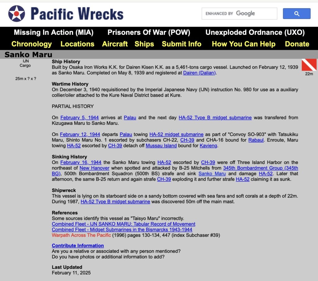 A little history ……When Japan invaded PNG in January 1941, they landed first at Kavieng on New Ireland Island and soon after at Rabaul on nearby New Britain Island. A relatively small, but very strategic, military base was established by the Japanese in Kavieng (that is why we were able to visit so many Japanese war relics from our anchorage near Nusa Resort). Enabling the Japanese to guard what was effectively the back-door of the overall invasion. So when the tide of war in the Pacific changed at the end of 1943, Kavieng became a key target as the allied forces counter-attacked. Major air raids were carried out on Kavieng by squadrons of B-52 Mitchell bombers on the 11th February, 1944. And over the next few days the base, together with its fleet of sea-planes, was destroyed. Those air raids were followed up on the 16th February. When six squadrons of bombers went in search of a 14-ship Japanese convoy heading for the area. The Sanko Maru was one of three vessels from that convoy that were found in Three Island Harbour, on the north-western tip of New Hanover. The Sanko Maru was the first to be attacked by the B25’s with their 500lb bombs and was quickly sunk. The unidentified submarine was reported by the air crews. The Sanko Maru was apparently one of the Japanese ” Hell Ships”, requisitioned merchant ships used to transport prisoners of war under absolutely appalling conditions.