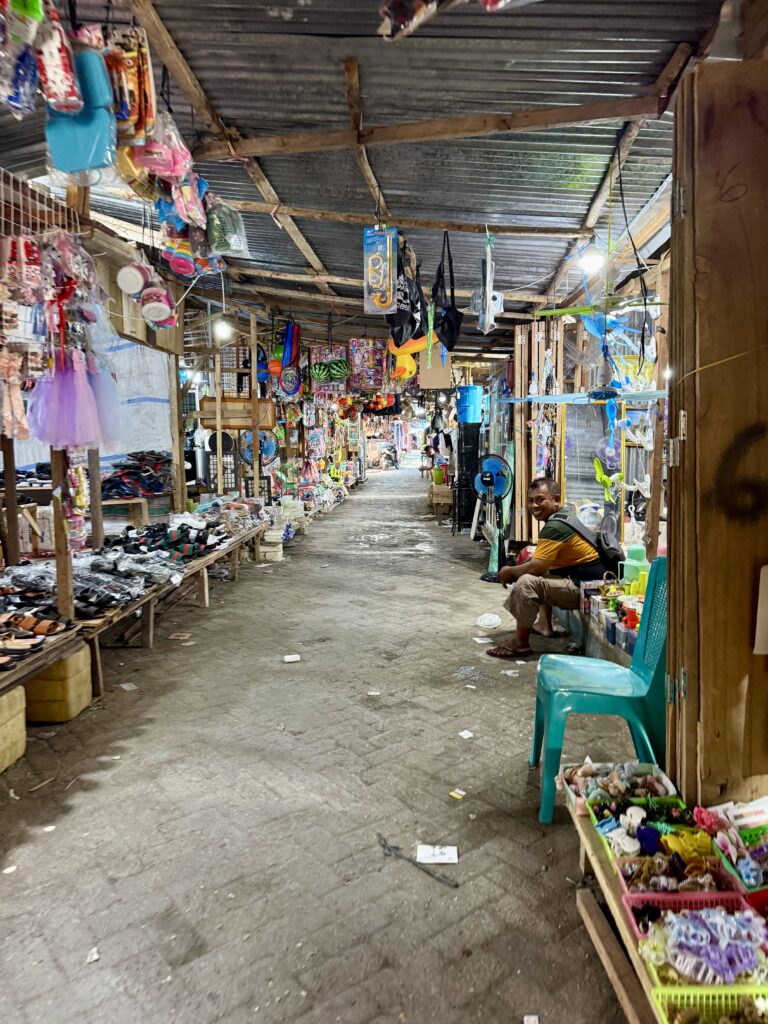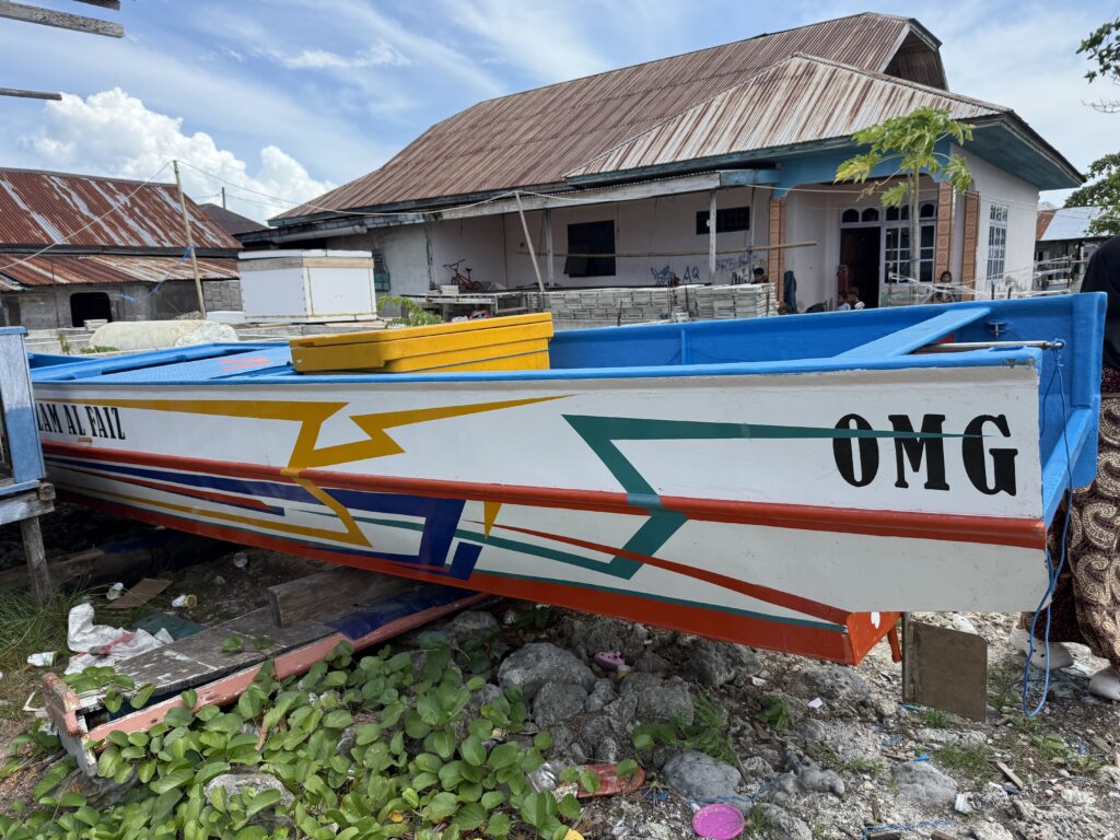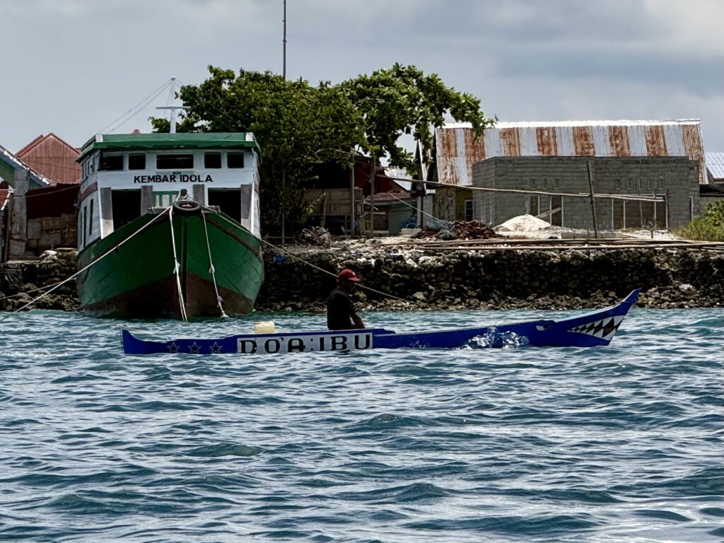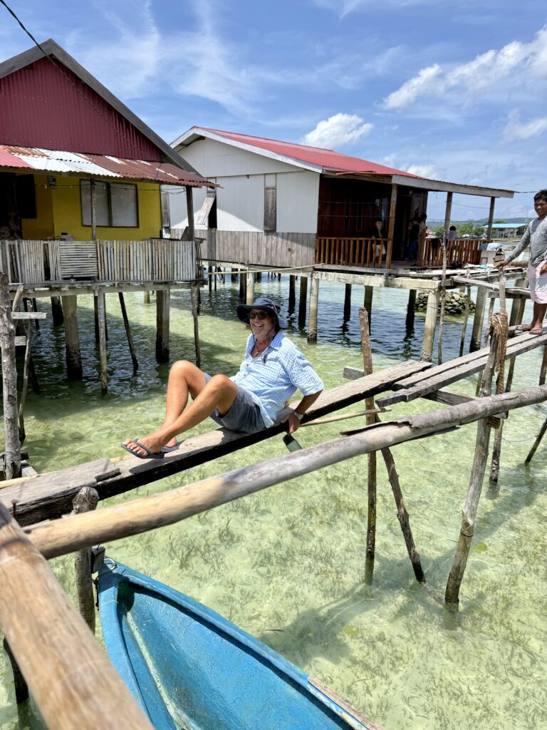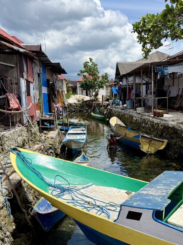 We returned to PolePole for a quick shower then he took us to the Bajo village on stilts over the water, where he lives. They are the Bajo tribe and always live over water and not on land, they have quite a few towns scattered around Sulawesi. Extraordinary that they all choose to live precariously on top of each other. We had arranged a tour with a lady called Ayu who was recommended to us, she met us at some rickety steps we had to get up to from Mr Albar’s boat to join her. She spoke excellent English and told us there were 10 thousand residents. They live in 5 neighbourhoods each with their own Mosque. Some walkways have been built up with coral and rubble which the scooters buzz up and down on, other walkways are very precarious planks of wood balancing on thin poles between the houses. Amazingly they seem to have their own rules here and kids can ride scooters, outside they have to be over 18 years old. Rowan led the way down one particularly rickety route and got such a wobble going on the thin poles the locals in the houses were shrieking with laughter and some worry, I think. He finally had to sit down and bum waddle his way back. Ayu says they love their community and nobody from the Bajo people would ever live on land. She took us to their market, which mainly had fish of every sort, one lady had loads of little puffer fish which was rather sad, plus we thought they were poisonous. The general produce market was a rambling street under cover with water all around. Some areas were full of trash and others were better kept. We went to a hall where we met her mum and sisters who were with a lot of ladies preparing party food. We were given some green crepes filled with sweet coconut, looked synthetic but tasted delicious. In two days time there is a big circumcision party for the 9 year old boys! She said the Bajo people love their music, and love to sing and dance, it would be a big celebration with the kids in traditional dress.. She invited us to join them, but sadly we have planned to move on tomorrow, time is running out as we need to be in the southern island Flores by mid Feb, two weeks time, and it is a good 4 days sailing away, we still have loads to see here in Wakatobi plus we need to go to the mainland to get more fuel. We had a wonderful couple of hours wandering around with Ayu, saw some boat builders, working on their wooden boats, all very interesting. Our guest loo is not working and Rowan has managed to get the motor off and found that it is seized, Mr Albar had taken it to some mechanic to see if it could be fixed. We went to the mechanic who turned out to be a stereo boombox fixer…….it had defeated him! We had loads of kids following us around, they kept saying this word, which finally when we asked Ayu what they were saying it was ‘tourists’! Very funny, everyone was so friendly and engaging, I don’t think they get many tourists passing through. After a very sweaty time Mr Albar took us back in his boat to PolePole.