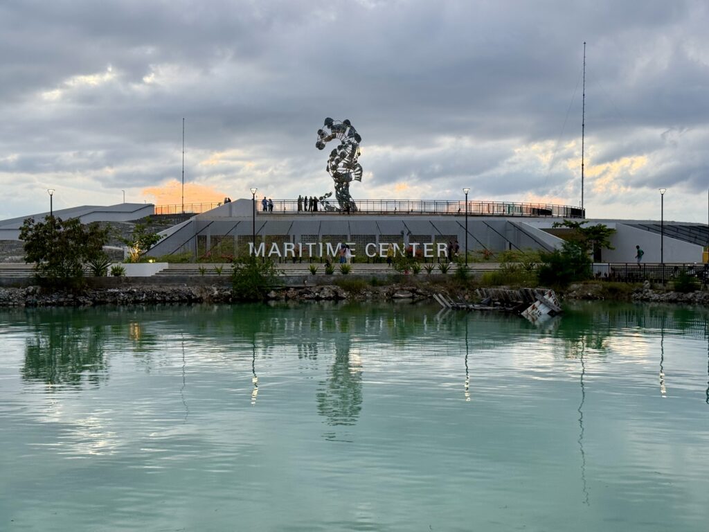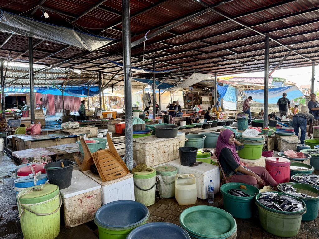 We could not rest as we needed to go to the market to stock up on fresh produce. The market only opens at 4pm and by 5pm when we arrived it was in full swing. We got loads of nice fruit including rambutans, and the usual veggies, plus the essential fresh eggs. Rowan is planning to do some Indonesian cooking, so we bought pawpaw flowers, chillies, fantastic lemon grass and all sorts of interesting goodies. We dashed back and put everything away before heading out for supper. We went down the road between us and the big modern construction which turned out to be the Maritime centre. So much infrastructure has been developed, the whole water front is built with the facilities for stall holders to serve food, including running water, lights and plenty of space to sit and eat. Quite something, but out of the 30/40 slots for stallholders about 6 were used, maybe it is different in peak season. Our restaurant was a very pleasant setting under some treed on a water way. It really is a coffee shop that serves food, sadly it was trying to be a bit too Western, the food was fine but nothing special. It felt like a long day we were happy to flop into bed.