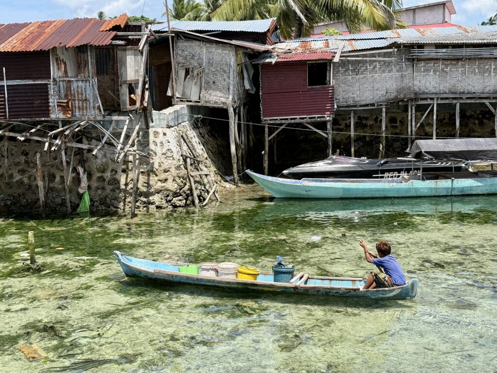 This little boy looked about 5 years old, paddling out with buckets full of shells and fish