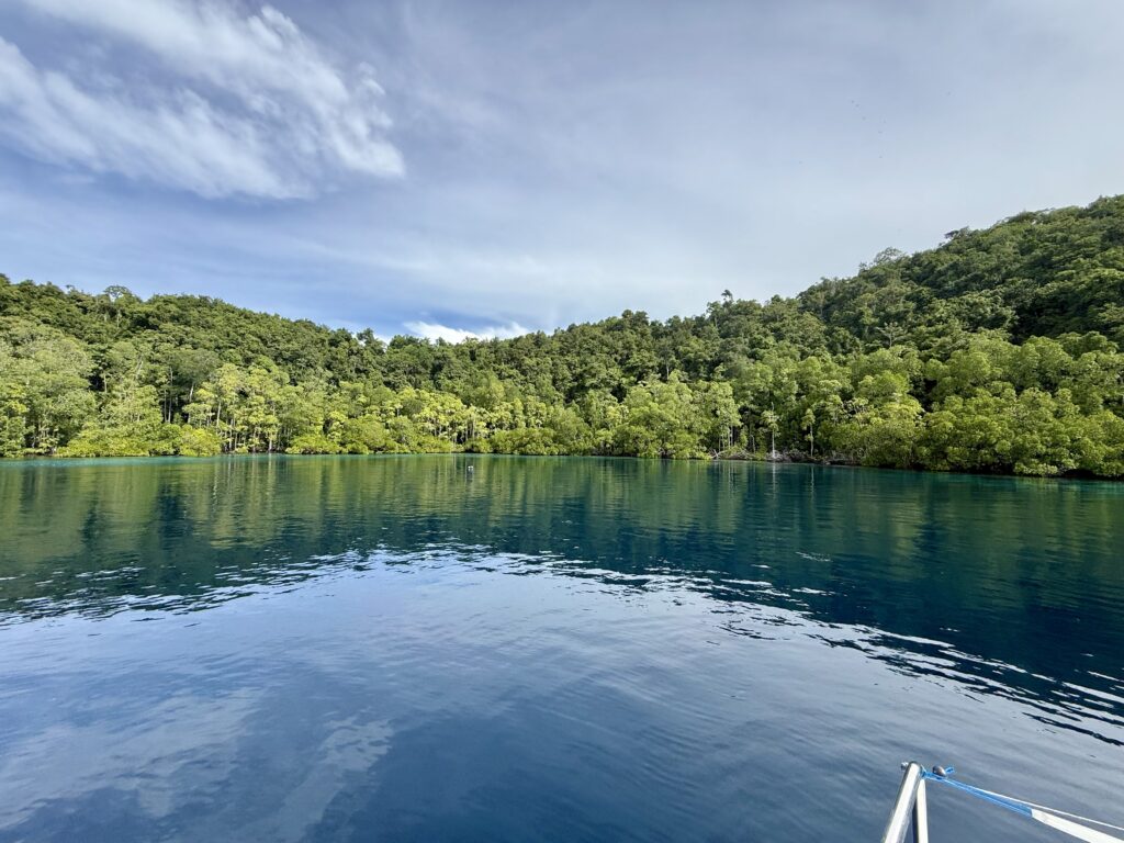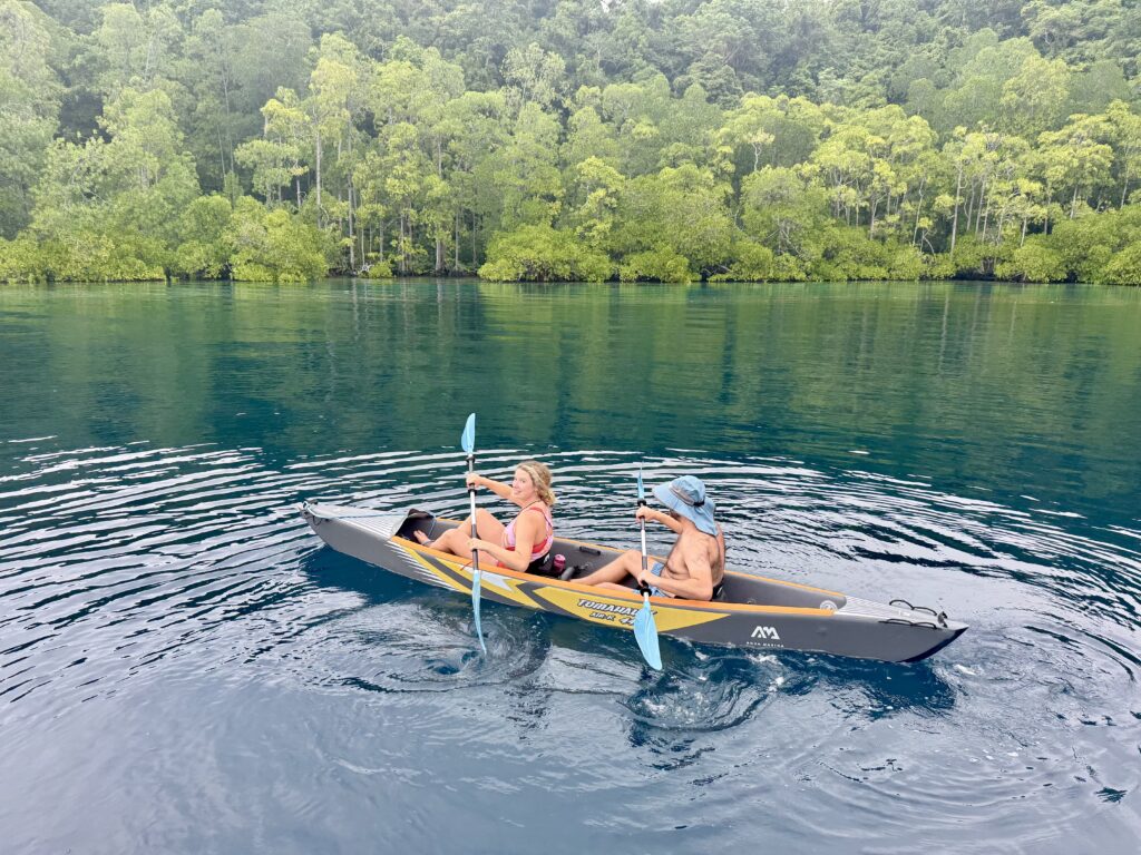 We left after breakfast for Yanggello island which was only a few miles away. We tried to anchor in the same place as last time but some park wardens chased us off there and sent us around the corner to a mooring ball. We could not use the ball as it was too close to the coral so we tied up front and back without the anchor out. Milly and Luke went out in the dinghy to tie us up, Milly’s sailing experience came to good use with her Bowline knot tying. I think it is a good idea what the locals are doing to preserve the area. The place was heaving compared to last time with loads of dive boats out and about, and a few Phinisi boats moored out at sea. We went for a snorkel shortly after anchoring sadly the current had brought in a load of rubbish into the channel, so we opted to go out to the sea side. There was not much rubbish out there but the visibility was pretty murky and with the mangroves all around the coast line we were on alert for crocs. A little scary for some but we told everyone to keep close to the dinghy. We did see a decent size Black Tip Reef Shark! The coral was great and plenty of fish although not many big fish.