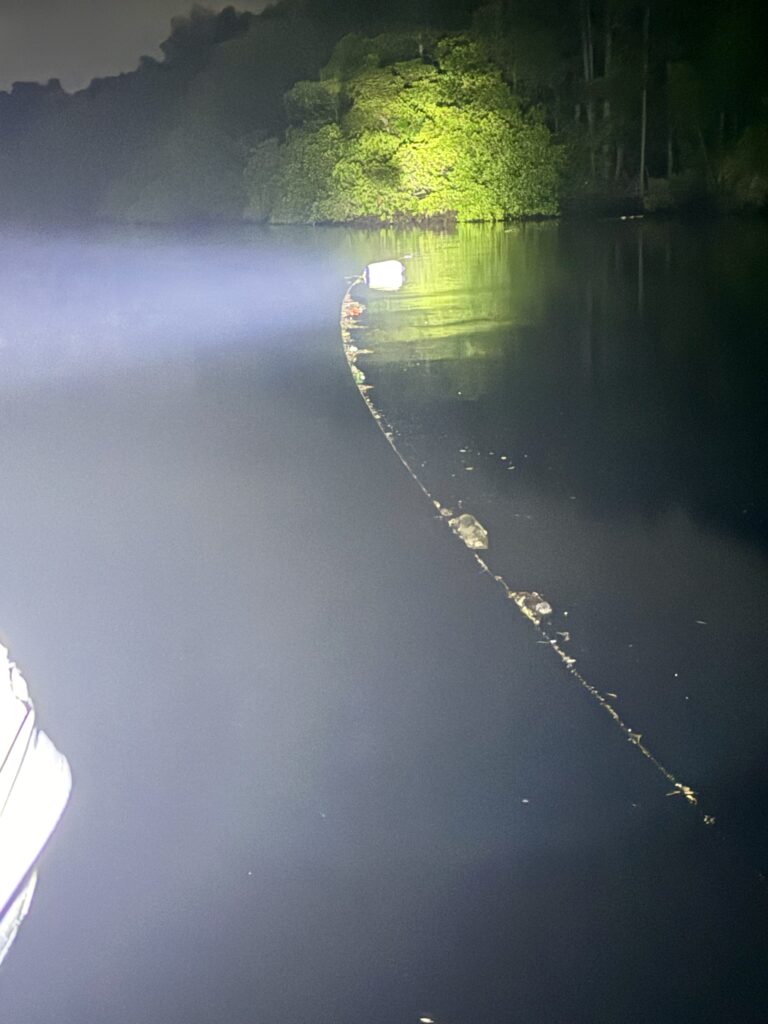 I took this photo late at night of our floating line that is tying us to the trees, as it acted as a catch for all the rubbish. So sad in this remote pristine area