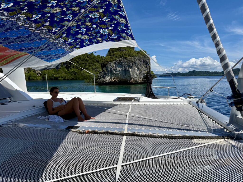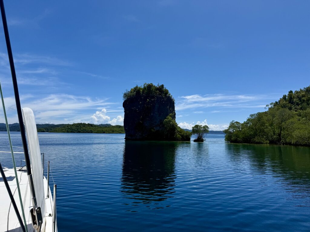 It was about 12 miles to our next destination, a wiggle through some reefs that took some alert navigation. Rowan had found an anchorage about 5 miles from the mooring ball we have booked from tomorrow. We asked if we could go today but they responded to say we could not because they are doing maintenance on the mooring ball. This was rather alarming as she said we could only get the ball from 11am, Luke, Milly and Dani land at 6:30am and should be with us around 10am. The boat that is bringing them is meeting us at the Kri mooring ball.