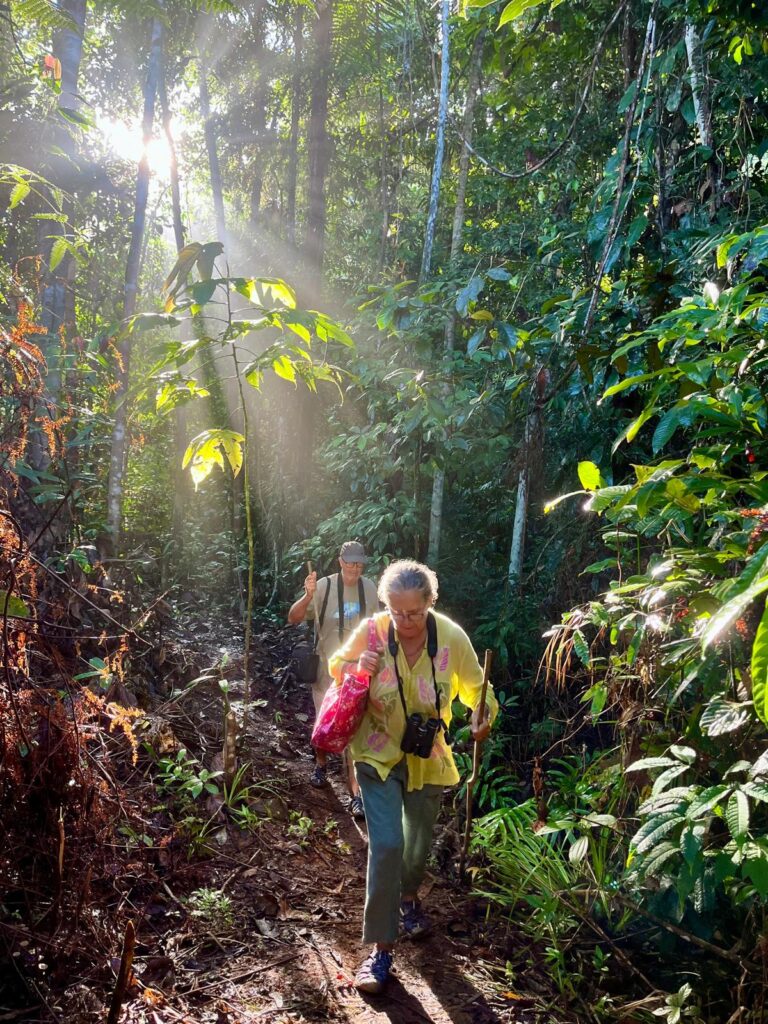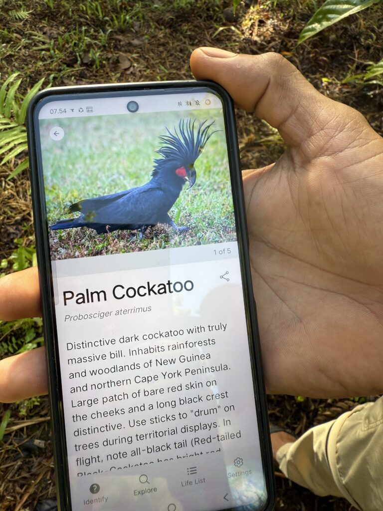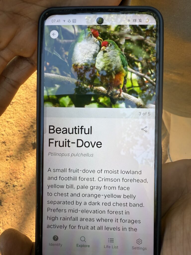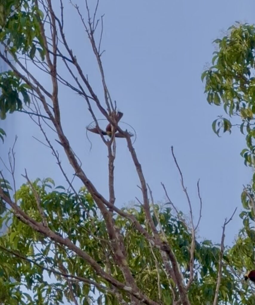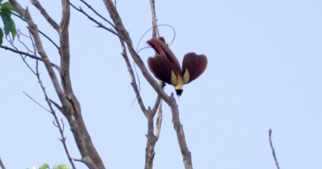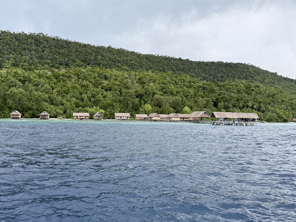 We were up at 4:30am and in the Car with Marlin our bird guide by 5am. It was about a twenty minute drive followed by a very sweaty, muddy steep climb into the jungle for a couple of kilometres. It started in pitch dark which was pretty hard going and finally the morning sunlight came through. We had a wonderful time listening to a Papuan Frogmouth on our way up to the hide, sadly we never saw it but he responded beautifully to our guides call. We had not realised we were coming to a hide and obviously it has to be booked as it only 8 slots, 4 people on two different levels. Rowan and I were on the top level with two Chinese photographers with enormous cameras. As the light increased the Red Birds of Paradise appeared and did their amazing courting ritual, conveniently mostly on a dead tree so they were easy to spot. So incredible that every morning they appear and do the same routine. It started with the males doing their dances, often one at a time, after about an hour two ladies appeared and there was a riot of action as the men showed off and the lucky men were chosen! It is best to have a look at the video which you will have to log onto the website to view, as the still shots do not do justice to the display. The control of the two long skinny tail feathers that finally flop over when he is completely upside down is extraordinary. It was an amazing thing to watch, only marred by the clicking of the Chinese cameras next to us. We also had swarms of mozzies, luckily we had covered ourselves in repellent. After about an hour and a half we made our way down to the owner’s little house near the road where we were given a hot drink and Pisang Goreng (bananas in batter ) that were delicious. In the garden of this birdwatching house we saw the spectacular Palm Cockatoo. Sitting in a bush nearby was a Beautiful Fruit-Dove, which lived up to its name, it was truly beautiful, very plump and colourful. It was a very successful trip we will do another tour with Marlin when we are back in town, to see the Wilson’s Bird of Paradise that does its courtship dance on the ground in the late afternoon. Marlin identified the birdsong we have been so enjoying as a Raja Amat Pitohui.