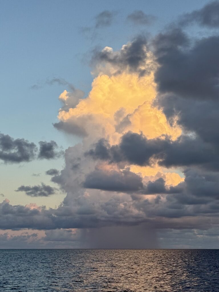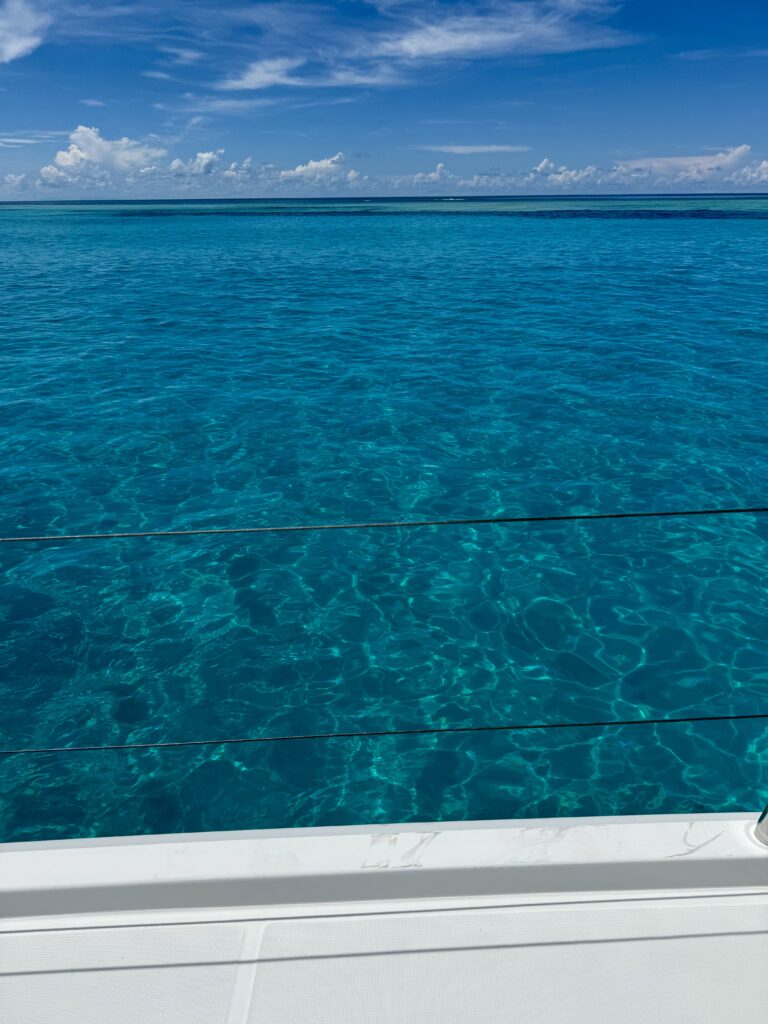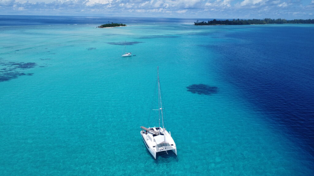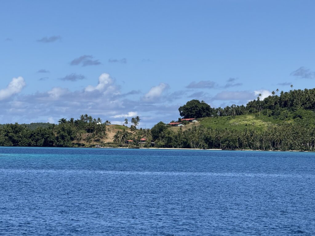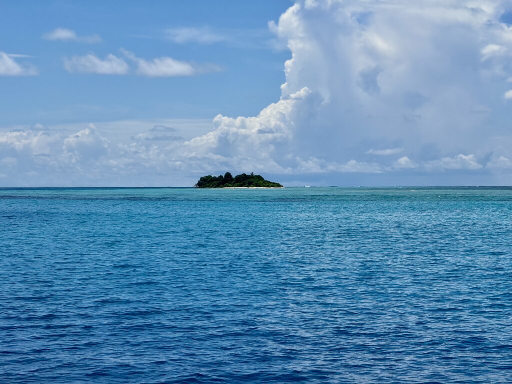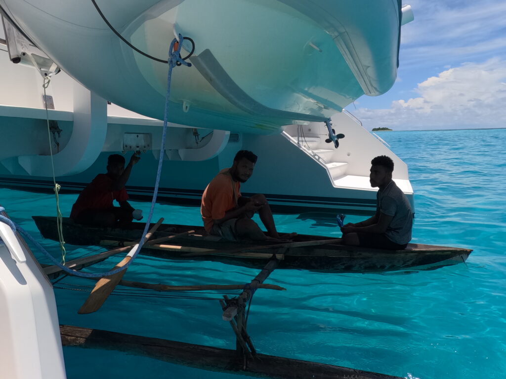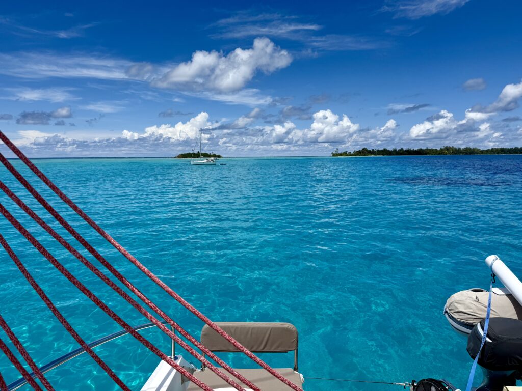We were out of bed at 6am to look for mantas, this is our last chance as we move out to the rim of the atoll to join Claudette in the turquoise water. Its a bit too noisy here as the banana boats charge through the pass between the main village and their homes on the little islands. I did not want to get in the water unless the mantas arrived, I have a blocked ear again, and really don’t want to get an infection, even though I’m fully loaded with antibiotic drops this time. The current was quite strong so Rowan would whizz through the pass with the dinghy. He saw great schools of fish creating wonderful fish murmurations. Just as he was about to pack it in a solitary manta sauntered underneath him, and quickly disappeared not to be seen again. At least his long swim was not in vain.