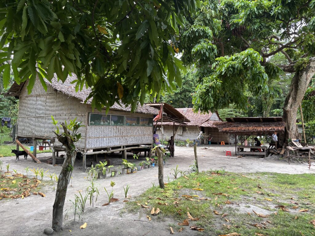 We took a walk into the island which has a little village and a craft market. Once you leave the resort you are straight back into jungle. We found the little market, which clearly doesn’t see a lot of custom, but once we arrived a number of ladies started putting out their wares. It really is incredibly cheap and I feel obliged to buy a little something from each stall, as I can’t think they do much trade in a week. There were loads of necklaces made out of the kina shell discs, sadly they all had pendants made from turtle shell, which I couldn’t bring myself to buy. But I did find one or two pieces without turtle shell. Some with shark vertebrae!