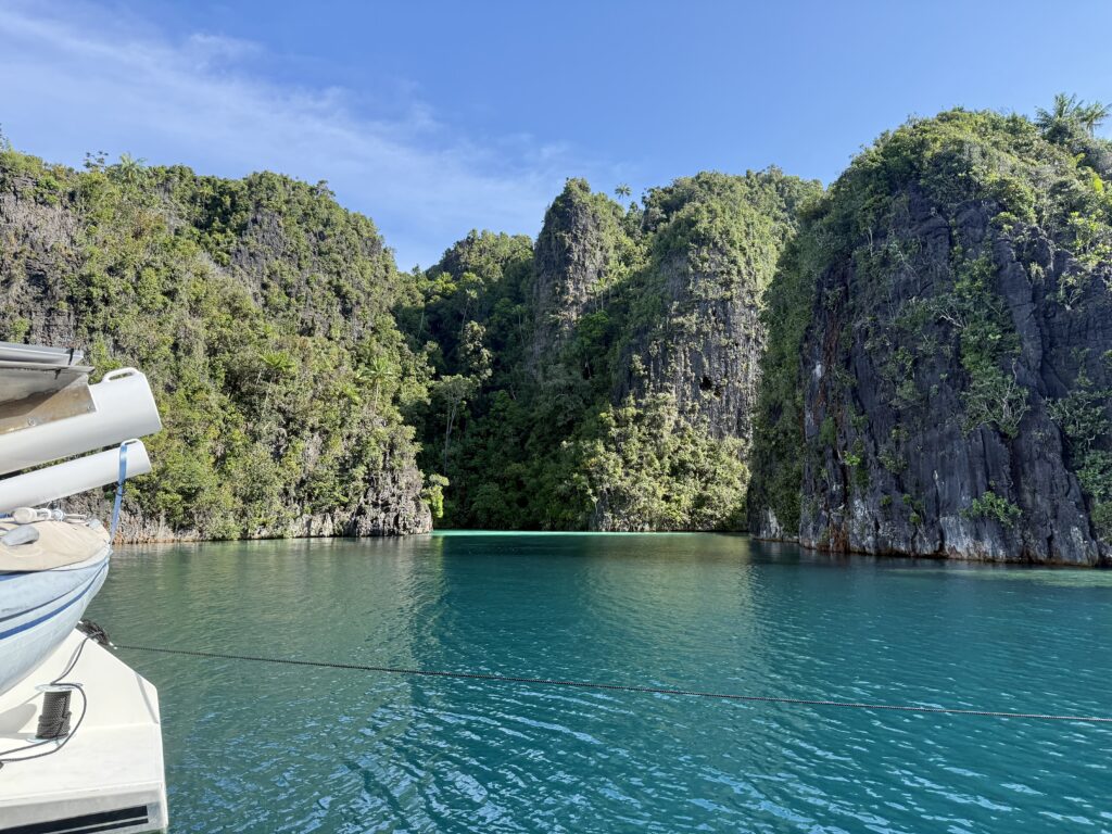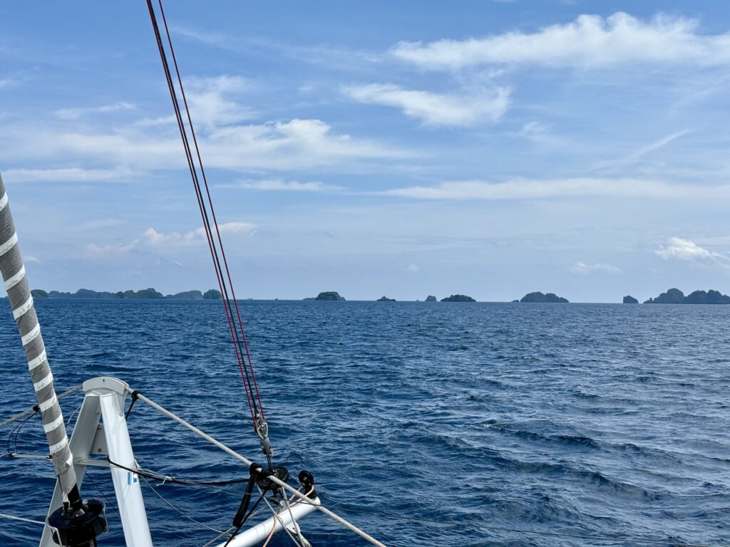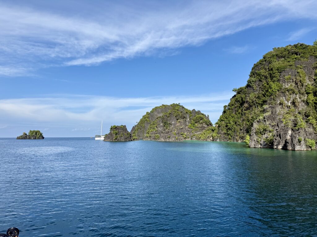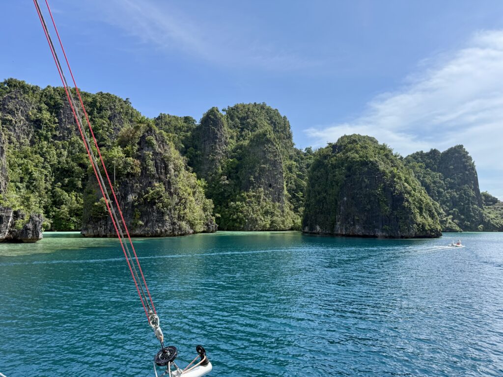 We set off soon after we woke up as we know it is a difficult anchorage and something we are going to have to learn to do in Misool. The water is deep you have to drop the anchor and then put out a couple of stern lines that you have to wrap around sharp limestone rocks. Rowan had read up all about it so we are well prepared, he had bought thick hose piping to thread the ropes through for our 100m floating lines. The hosepipe is so that the rope does not get cut by the sharp limestone. Another Australian boat was there with their kids, and told us one of the only three spots was available for us. We finally saw the skyline of the islands we were heading for around lunch time. Our friends on the boat Jiyu that we met in Vanuatu were there to meet us for the night, thankfully they offered to come and help us. It was pretty nerve racking reversing into the deep gorge with coral all around. Xavier got both stern lines secured on rocks and returned to the boat for us to tie on. After getting scarily close to the coral on one side we had to pick up the anchor to reset it further away, this meant slackening our stern lines. All quite a palaver that I was very pleased to be finished with. We needed a good rest after that, especially as it is boiling hot. We were dripping buckets of sweat.