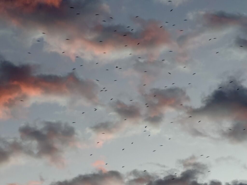 Huge flocks of Frigate birds as the sun set