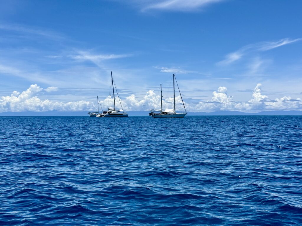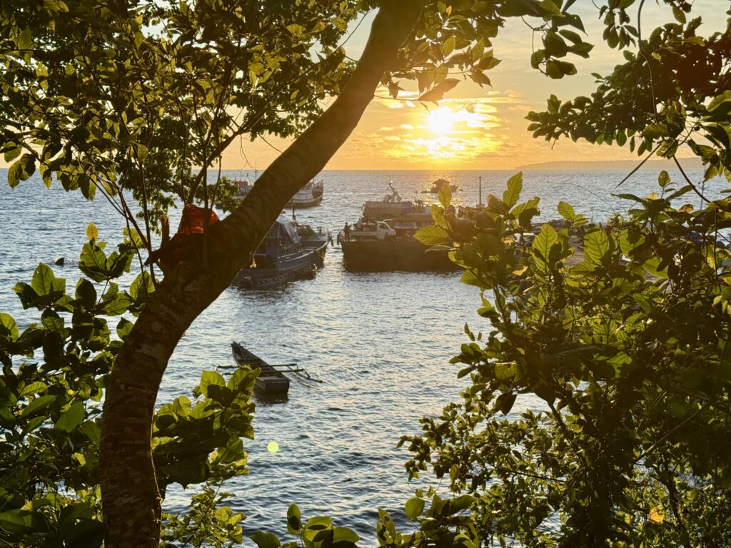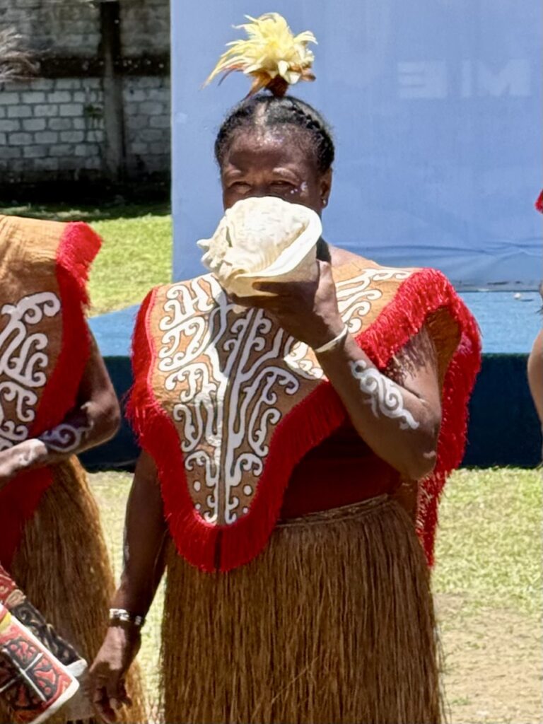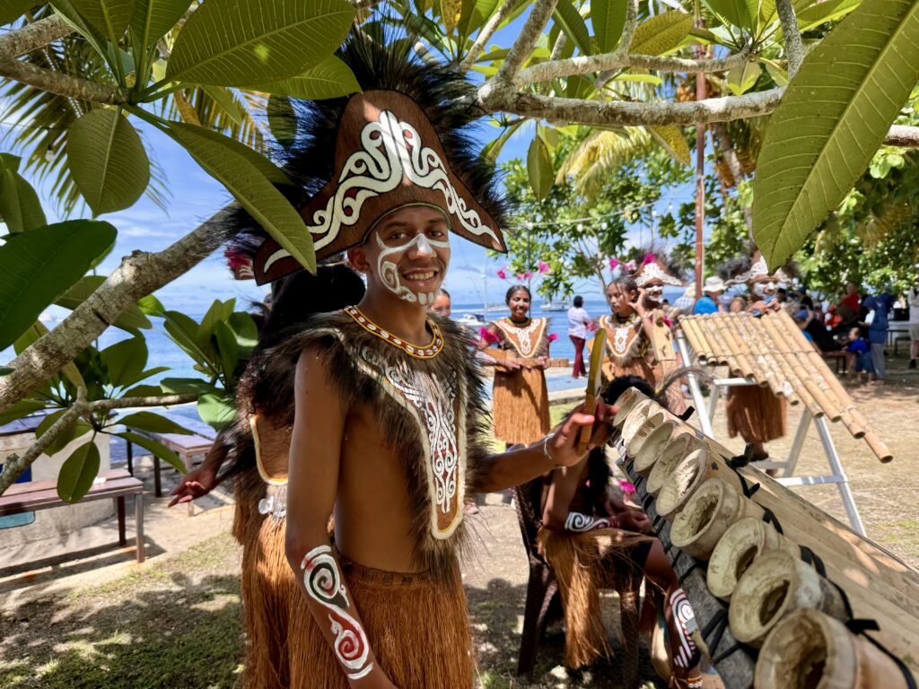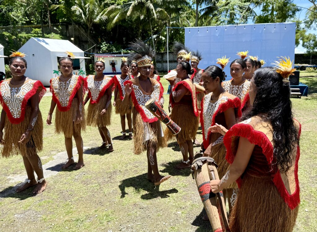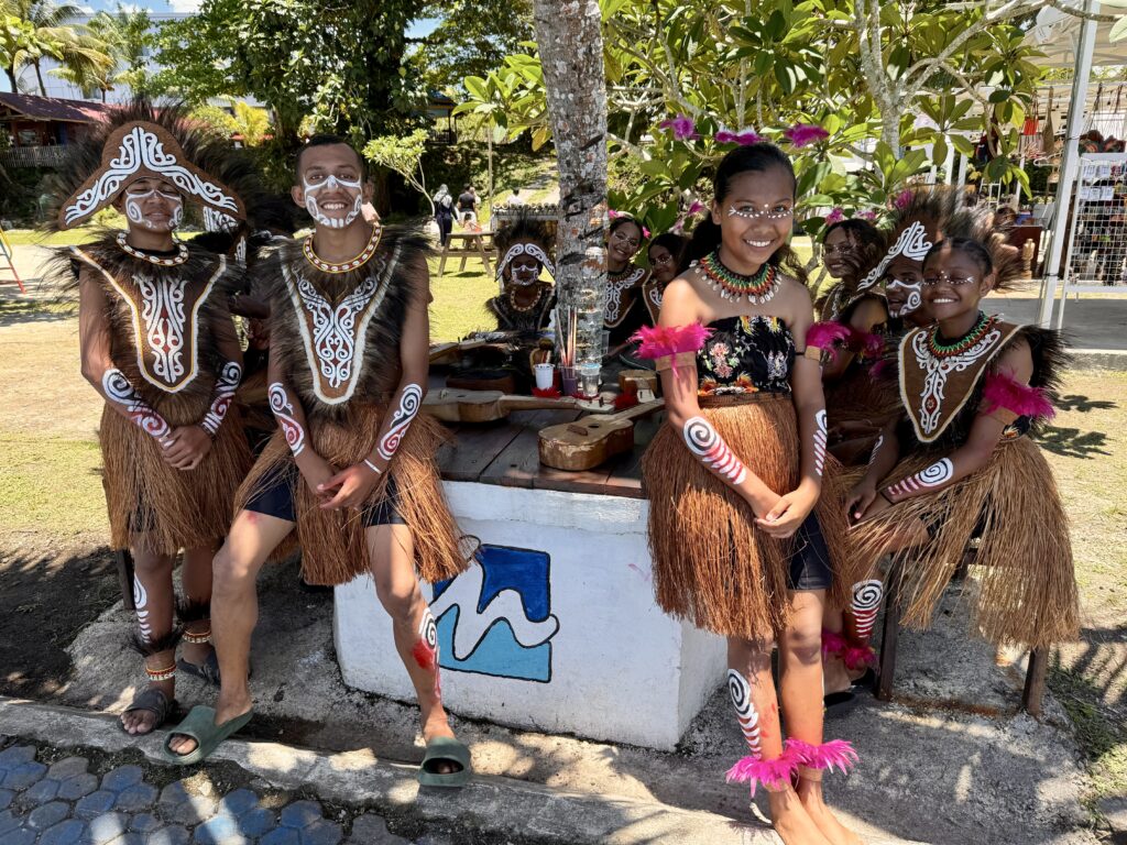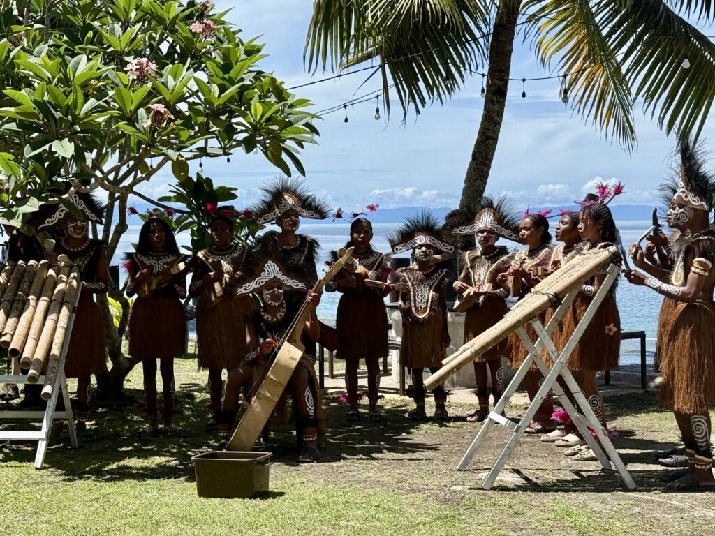 We were woken to the sound of conch shells being blown, beating drums and singing. Looking out the cabin window we spied the cause, a small cruise ship had arrived and they were being welcomed ashore. Ahmed had told us to come in at 10am to join the celebrations which is what we did. Until then we sat up front on the trampoline catching a nice little breeze under the awning listening to their lovely singing. Profasea and Arka have not dropped their dinghies into the water, always much harder on the monohulls, so we have become the taxi service picking up everyone before heading to shore. The singing/dancing troupe were all beautifully dressed up in traditional clothes and seemed to be loving every minute of it. it turns out it is a smallish Australian cruise ship, Ahmed and Julia organise to take them to the Japanese WW2 sites, and obviously some craft stalls are erected to try and sell their goods. The cruise liner departed by midday, only ashore for a few hours, but great business for Ahmed and Julia. They get the cruise liners about 4 times a year. There was not a lot of particularly good craft, rudimentary carvings compared to the Solomon’s and cheap jewellery tat. The only thing I liked were the headdresses, which are made with Cassowary feathers, which are an internationally protected bird, Lonely Planet Indonesia says that you could be in real trouble taking these into foreign countries, so I resisted the temptation! The feathers are a very indifferent black feather, but they are a real feature here, you see them on the taxi aerials, boat flag poles and headdresses. We saw Renee and Don the S African couple, who are so cheerful and exuberant about everything.