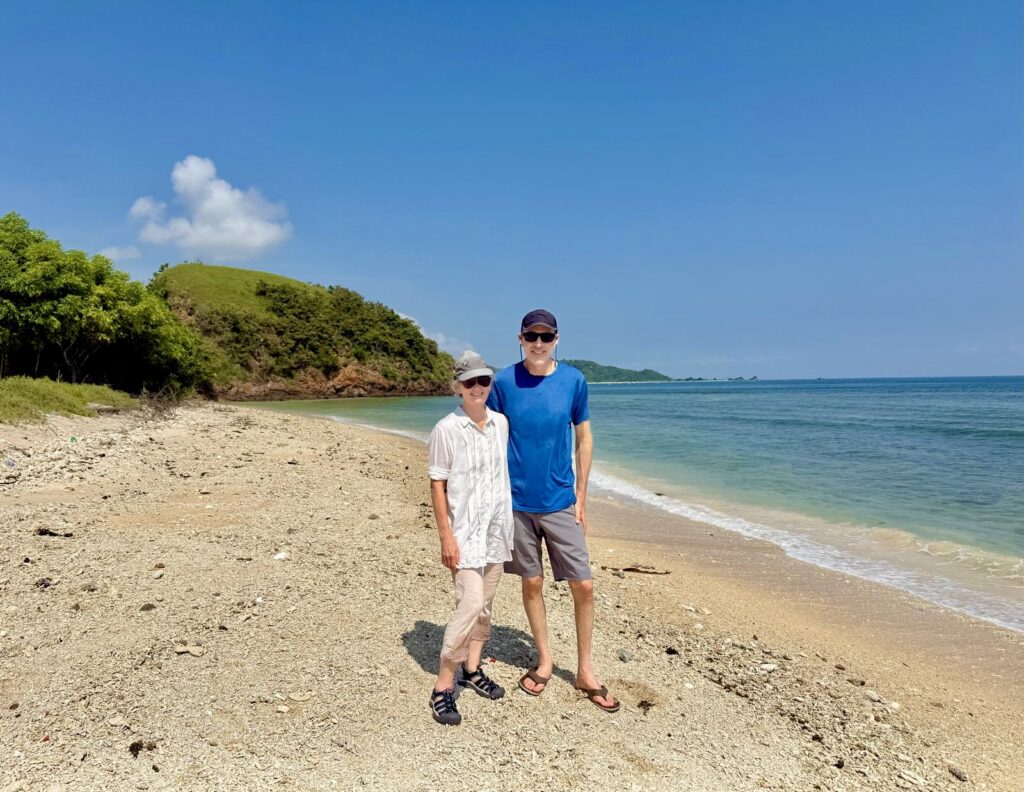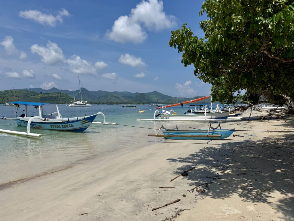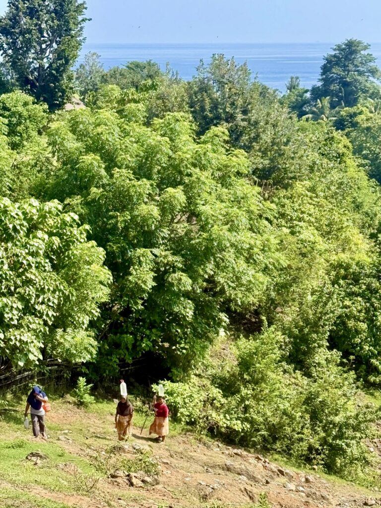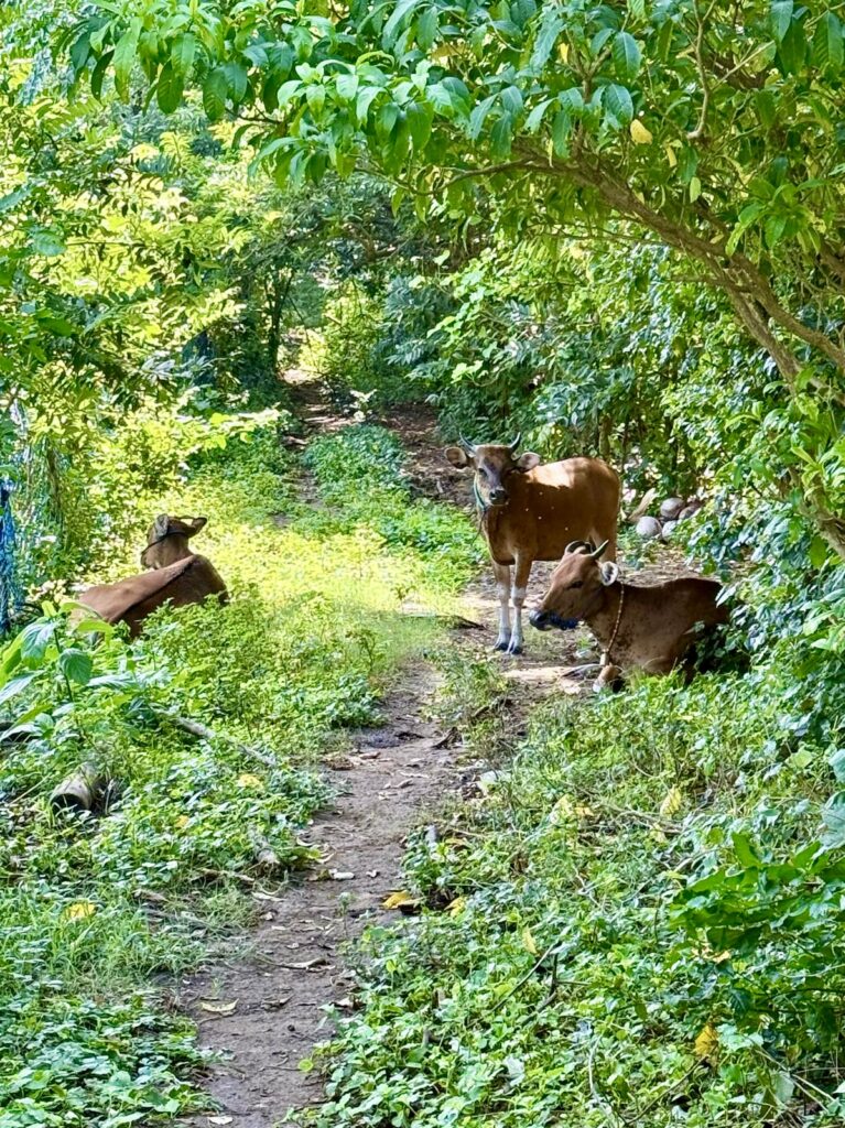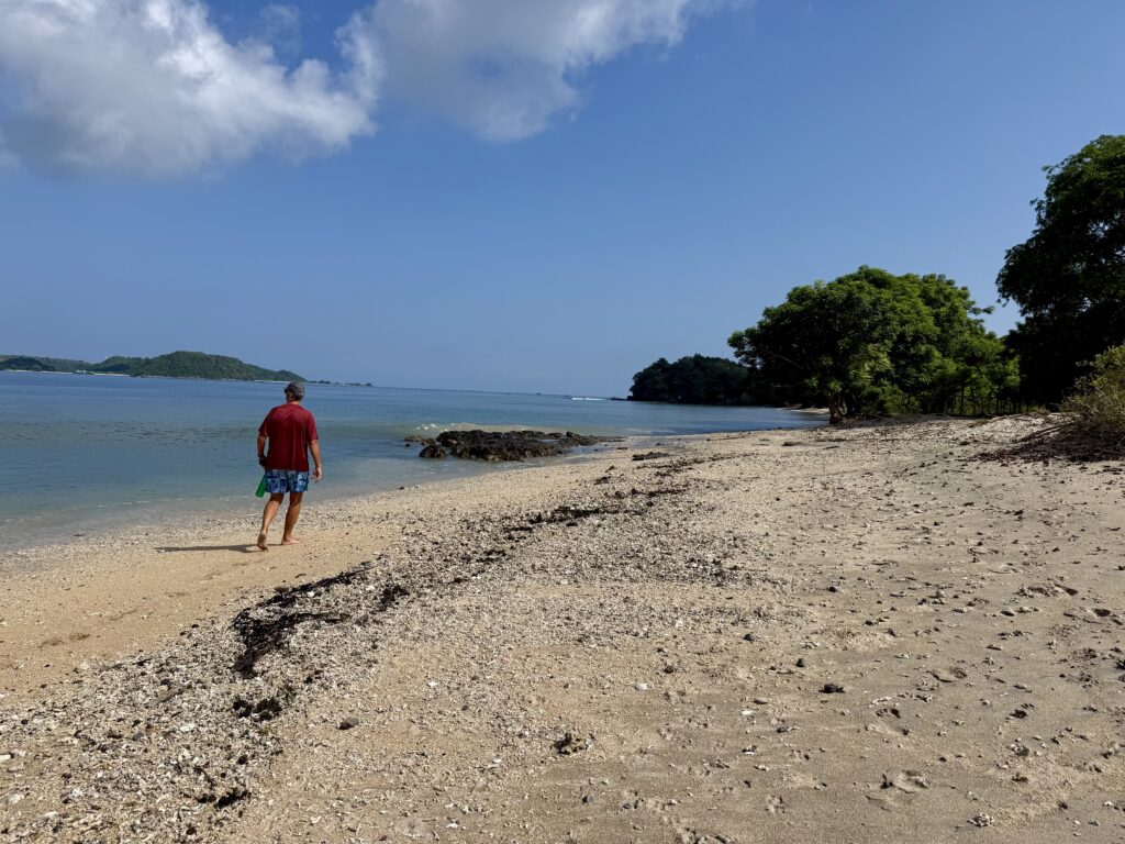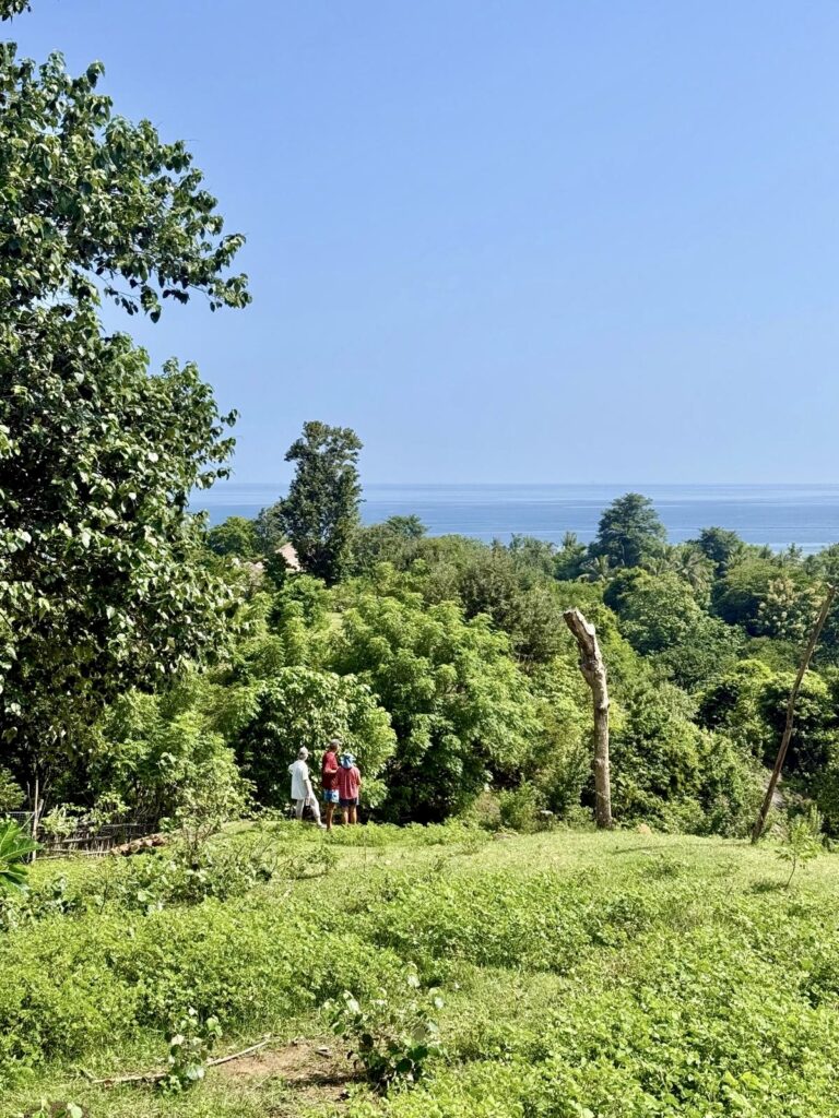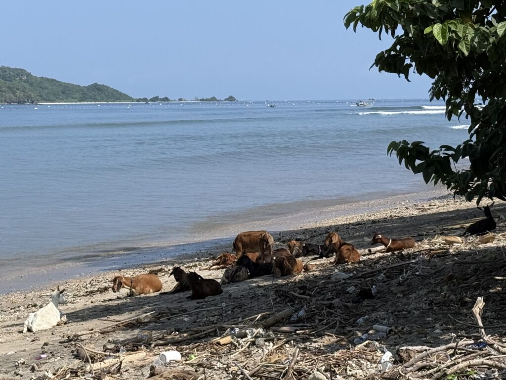 We had seen a sign that said we could walk around the island on the beach between mid and low tide. A quick breakfast and we were off on our walk to beat the midday heat. We started well passing the few resorts in front of us, they all look really nice and laid back. We had not gone that far when we realised we were not going to make it around a headland in front of us, the tide was way beyond mid tide. We found a path up the hill, there was a good view from the top but not an obvious path down the other side. We met 3 ladies carrying water coming up the hill the other way, amazingly balancing it on their heads up such a climb. They told us we could go down. We passed quite a lot of livestock, goats and water buffalo which have a very impressive white circle around their bottoms. They must be a certain type of water buffalo with that marking and some are brown, they have straight sharp horns so actually look more like a buck. Our rough path took us to the back of another resort, it was a bit of a scramble getting through fences and a very overgrown path, we landed up coming out behind the resorts very messy noisy generator. There were a surprising amount of people at the resort, it looked slightly neglected. We pressed on along the beach and managed to get the rest of the way around without too much difficulty, a couple of places requited wading and avoiding rocks, it was a good walk.