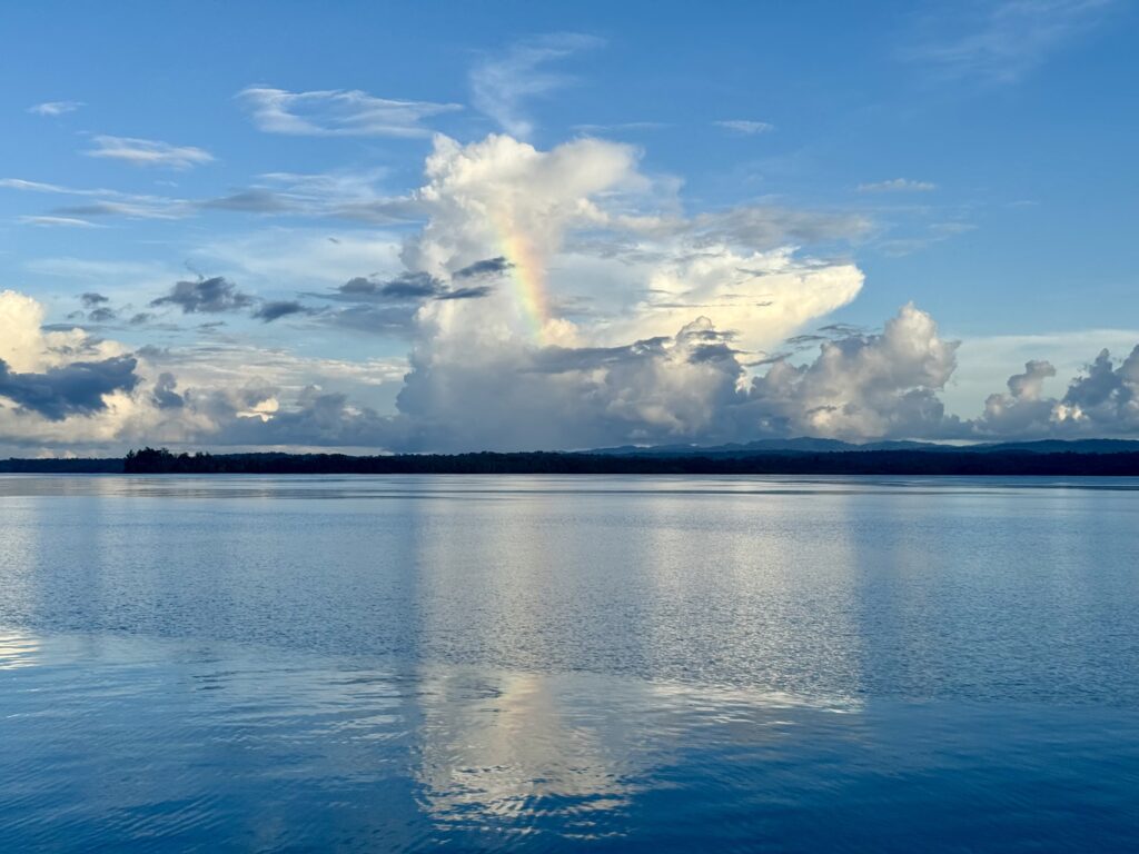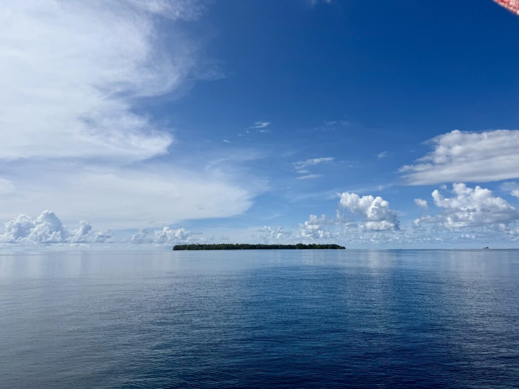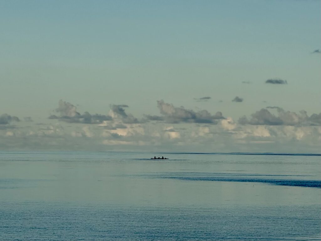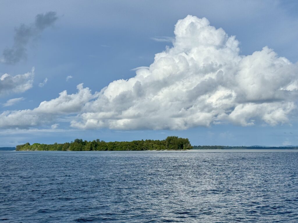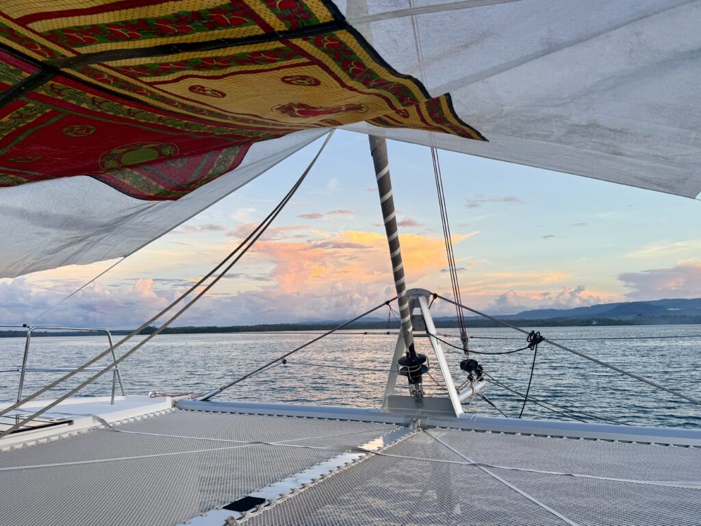 We set off soon after we woke up, about 7am, there was not a breath of wind, but we decided to head off anyway. We were waved off by the grandpa, and made our way through the reefs out to sea. The wind never got above 7 knots the entire way so we motored the whole way, in bright sunshine. It was incredibly hot, which spurred me on to fix our awning which we have not had up in a couple of years, too windy in French Polynesia. The straps have completely disintegrated in the sun. Luckily I had bought enough webbing to do a couple of repairs, at that stage I thought only a couple of straps had broken. I’ve discovered all 6 have perished, so I cut my webbing in 6 and have made elasticated extensions. It took me the whole 6 hour journey to nearly finish it.