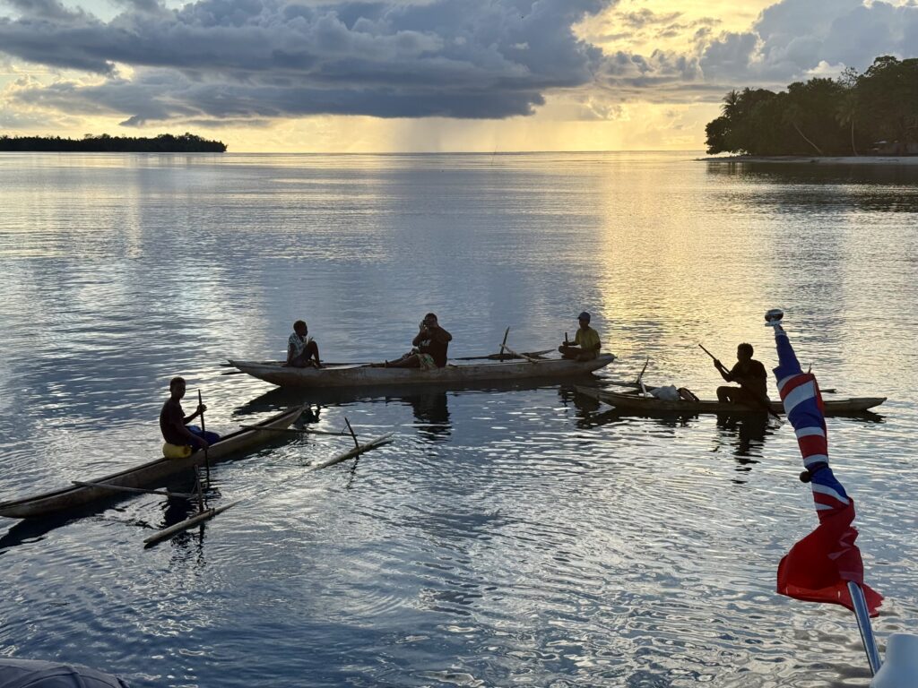We arrived at Dunung island at around 2pm and anchored off their very pretty palm lined beach. Rowan had been in touch with the guest house here called Clem’s Place. Clem is a local who has become well known as he has had a couple of famous guests on dive boats visit him. Clem is away but he has put Rowan in touch with his nephew at the guest house. We had not been anchored long when we were surrounded by canoes. First canoe came with coconuts which is hugely appreciated. Rowan has perfected opening them with his panga and we have a huge glass of the juice every day. So good with a big chunk of ice in this heat, plus it is full of trace elements, as good as rehydration salts apparently. It was not long before we had endless canoes paddling around us, so curious, I guess we are one of the bigger sailing boats that has been by the last couple of years. We traded with kids and teenagers, and have enough limes to go with all our pawpaws and my gin and tonics to last a long time! Rowan emptied the one bag of limes and found about eight big leopard cowrie shells in it. The guys had already gone before we realised, we don’t like to take any shells from them.