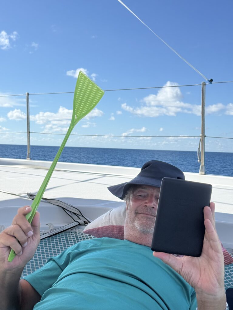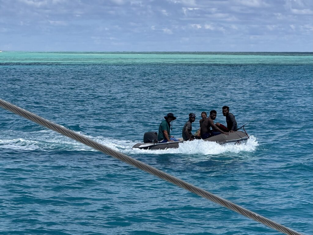 Silum was here yesterday using wifi, Rowan asked them if they wanted to earn some money cleaning the bottom of PolePole, they jumped at it. Two lads and Silum were here at 10am to scrub the boat beneath the water. They did an excellent job, we may even go a little faster now. Rowan asked Silum if he could show us a good place to snorkel, they all three volunteered and had their speargun ready too. I opted out of it as my ear is not quite right and I don’t want to risk it, plus it was potentially going to be a long time in the boiling sun with no protection. Claudette joined them, and the 5 went miles away. The guys got some fish with their spear gun. It turns out that Rowan’s brand new spear gun he bought in France, in Nov 2021, and has never been used was absolutely useless. Well that is Rowan’s claim anyway! It sounded like the snorkelling was pretty much like we had seen.