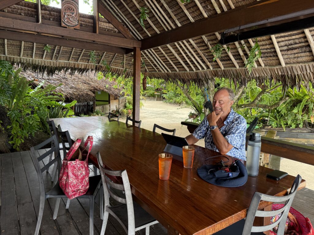 We had a reasonable night in our lovely airy room, the fact that it had three fans in it confirmed it gets hot in there. It really is a special place, the loos are all compost loos, which is interesting, there is a bucket of sawdust next to the loo and you chuck a couple of coconut scoopfulls in, instead of flushing. It looked like a long drop but had no smell whatsoever. There were little grains of something falling onto our bed, I had swept the bed clear before getting in last night and during the night discovered we were covered in them again. So small they were falling through the mosquito netting above us. it was a bit disconcerting wondering what it was. We had a huge squall during the night, thankfully no lightning, but of course Rowan was concerned about the boat. At least the two lads were on it. Rowan was up at 7am to get the boys home, they were fast asleep when he got there, he walked around the boat before they woke up! Not sure what good they would be if somebody did board the boat but guess they were a deterrent. Rowan said they were delightful 16 year olds, very respectful.
