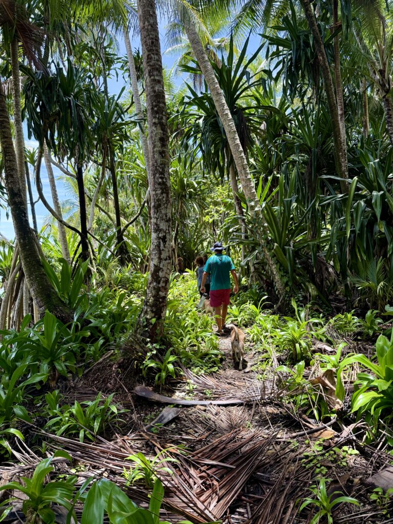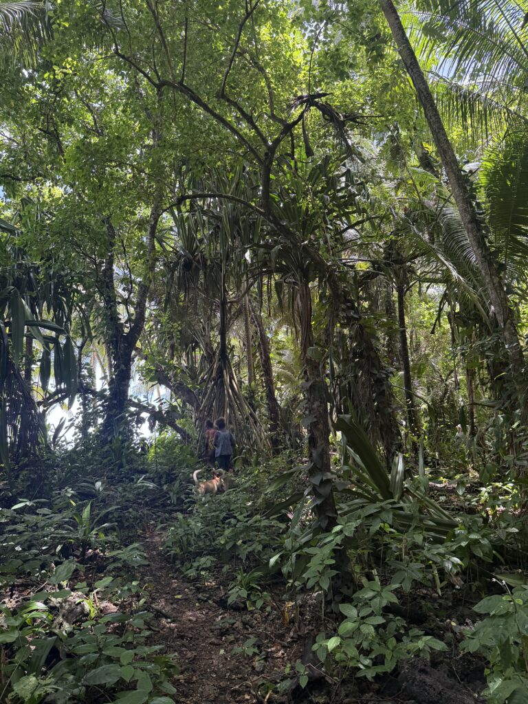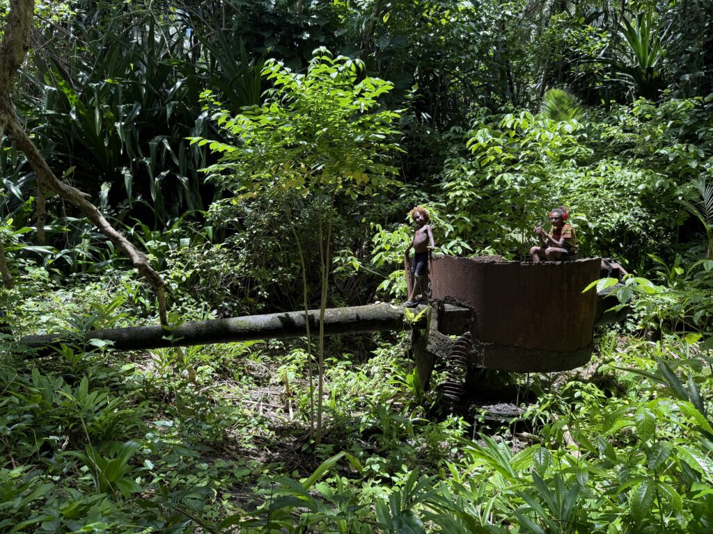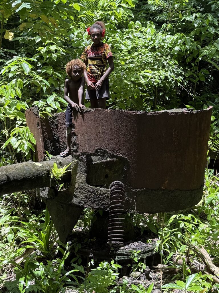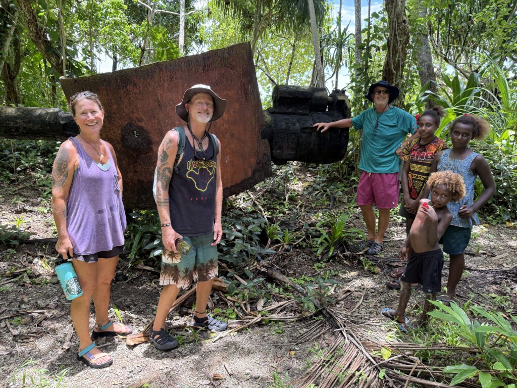 We planned to do a walk around the island next door, we had been told there were a couple of Japanese guns from WW2 to see and a blow hole. Jen and Kary came with us, we dinghied over and the resort dogs swam over to join us, not that far only about 100m, they clearly know when someone is going walking. They had been a pain walking around the village yesterday as they are obviously top ranking dogs, being the only fat dogs we have seen. They got all the emaciated village dogs barking and terrified as they strutted their stuff next to us. Definitely racist dogs! We paid an entrance fee at the house we went ashore at, 10Kina each. He pointed in the direction we should go. We followed the path around and when we found a lady hanging out her laundry we asked her if we were going the right way. We had missed a turning, sweetly she escorted us through various homesteads back onto the track. Then she shouted out to her kids who were playing out in some shallow water to come and take us to the sites. Two very engaging girls and their younger brother. It was a good 40 minute walk through thick vegetation on the Western side of the island, a lovely walk mainly in the shade. We first came across a Japanese bunker, they showed us a hole into a cave, they told us it led to the next gun about 50m away. Quite astonishing the guns were in reasonable condition, abandoned here in the jungle for all these years. There is no signage for these relics, even google maps doesn’t have them marked. There was a second gun another 50m along. We carried on walking until we got to the very top of the island, the girls then got us scrambling up over a coral bank, sharp as anything but not quite as treacherous as at Chief Linus’s island walk. Once on top we had a view of a couple of blow holes. I think the tide was not quite right as they were not that impressive. Anyhow it was a great view out. The kids were very chuffed with some lollipops I produced.
