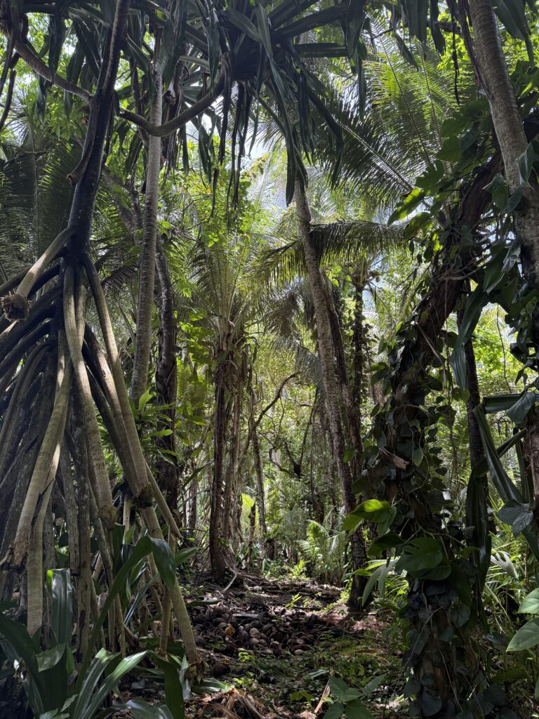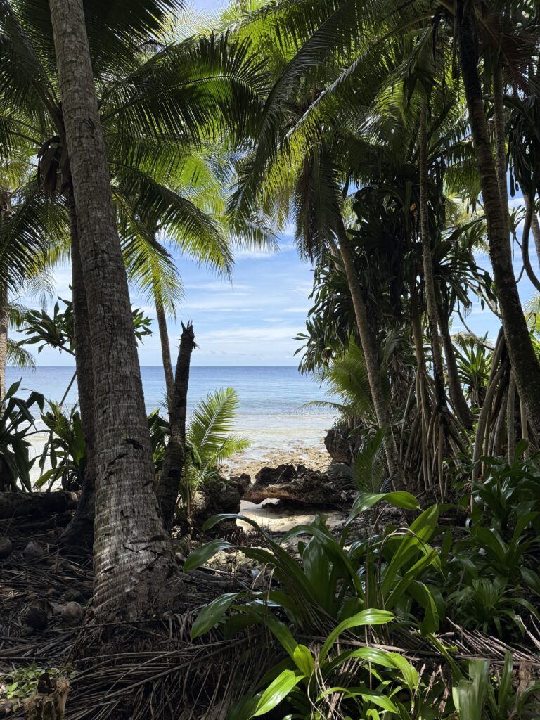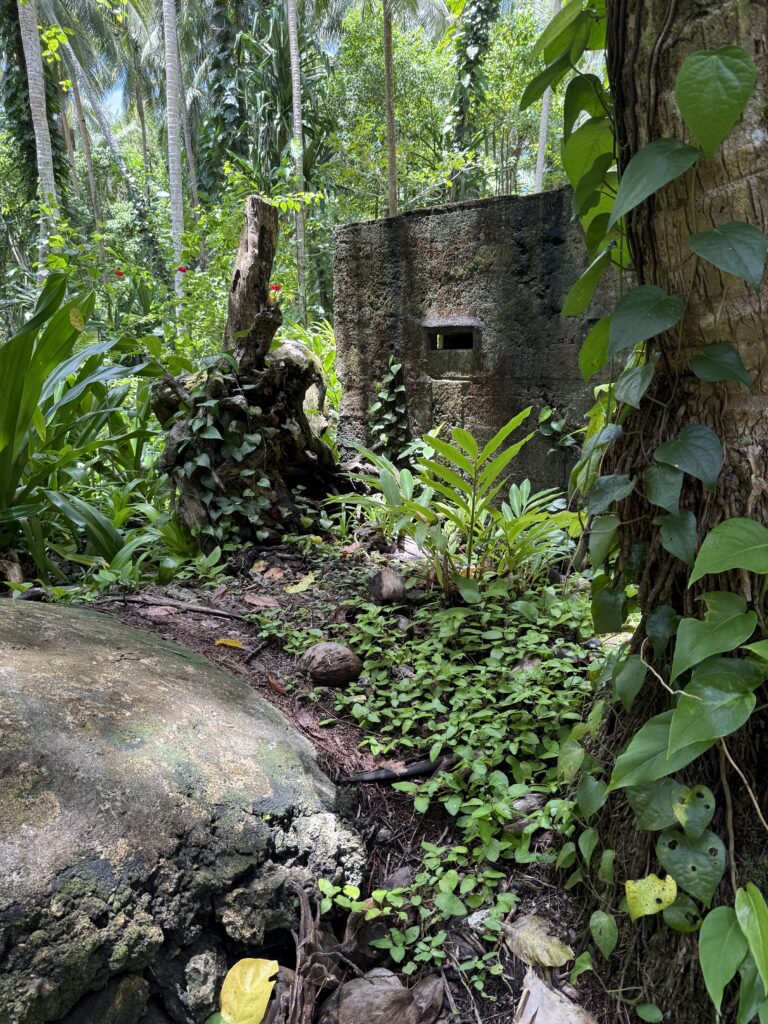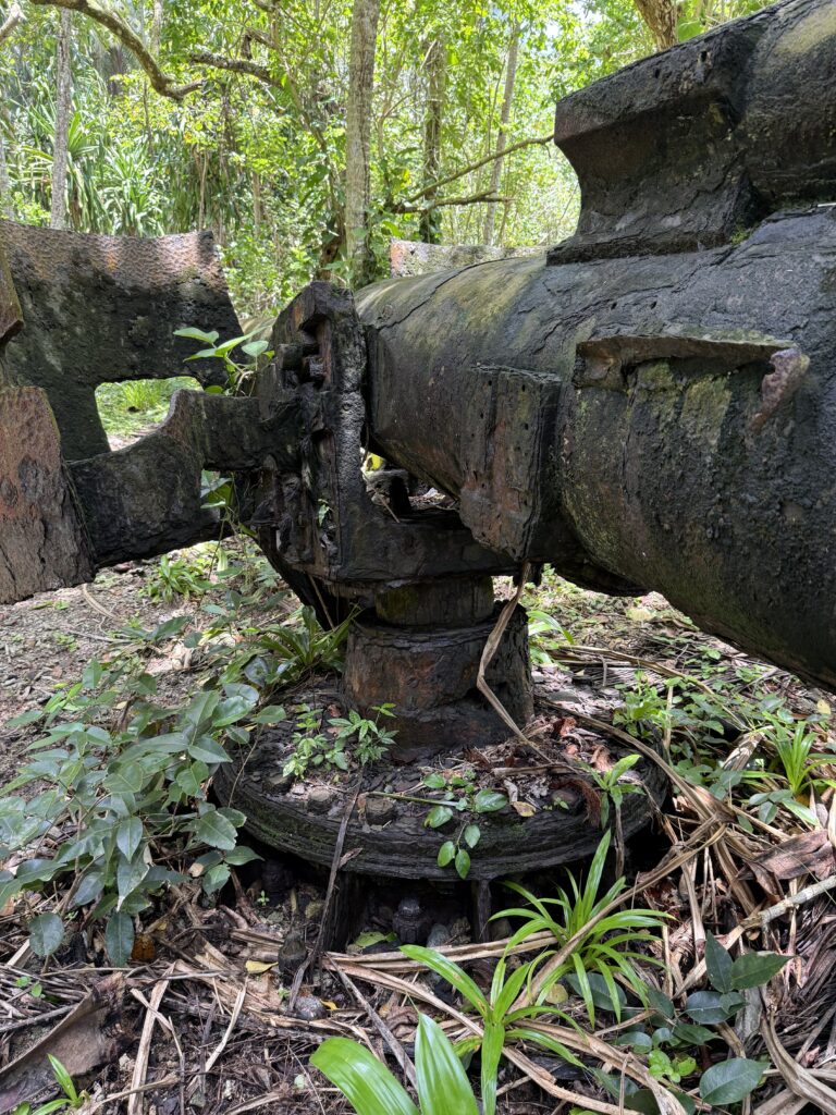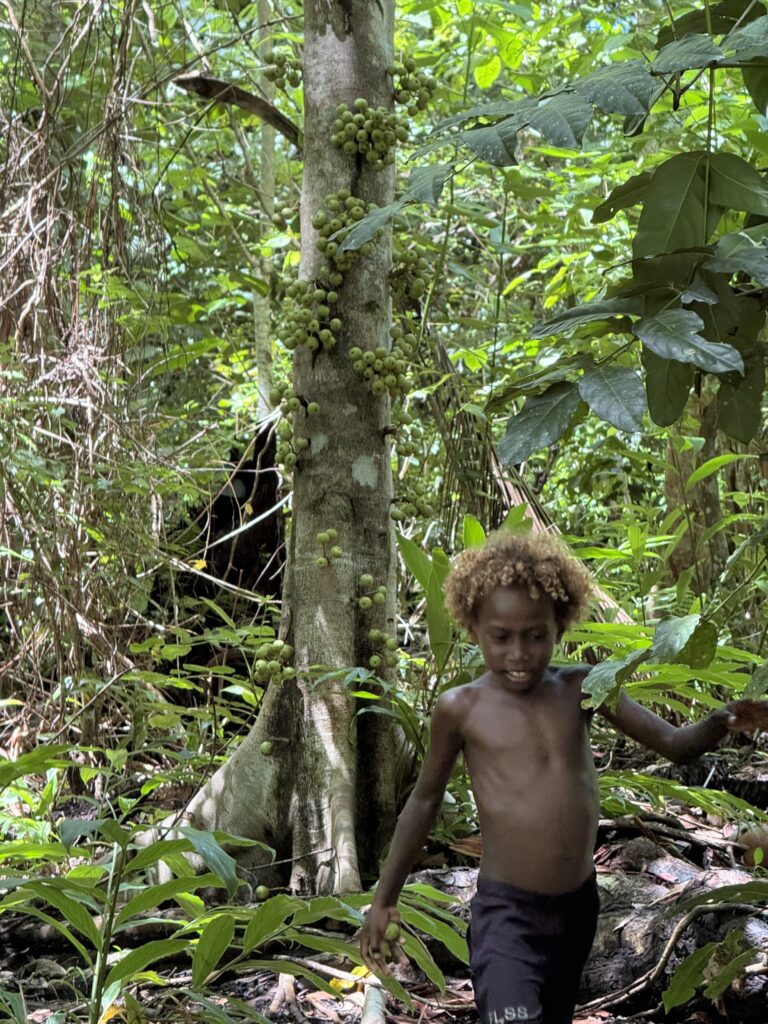 We planned to do a walk around the island next door, we had been told there were a couple of Japanese guns from WW2 to see and a blow hole. Jen and Kary came with us, we dinghied over and the resort dogs swam over to join us, not that far only about 100m, they clearly know when someone is going walking. They had been a pain walking around the village yesterday as they are obviously top ranking dogs, being the only fat dogs we have seen. They got all the emaciated village dogs barking and terrified as they strutted their stuff next to us. Definitely racist dogs! We paid an entrance fee at the house we went ashore at, 10Kina each. He pointed in the direction we should go. We followed the path around and when we found a lady hanging out her laundry we asked her if we were going the right way. We had missed a turning, sweetly she escorted us through various homesteads back onto the track. Then she shouted out to her kids who were playing out in some shallow water to come and take us to the sites. Two very engaging girls and their younger brother. It was a good 40 minute walk through thick vegetation on the Western side of the island, a lovely walk mainly in the shade. We first came across a Japanese bunker, they showed us a hole into a cave, they told us it led to the next gun about 50m away. Quite astonishing the guns were in reasonable condition, abandoned here in the jungle for all these years. There is no signage for these relics, even google maps doesn’t have them marked. There was a second gun another 50m along. We carried on walking until we got to the very top of the island, the girls then got us scrambling up over a coral bank, sharp as anything but not quite as treacherous as at Chief Linus’s island walk. Once on top we had a view of a couple of blow holes. I think the tide was not quite right as they were not that impressive. Anyhow it was a great view out. The kids were very chuffed with some lollipops I produced.