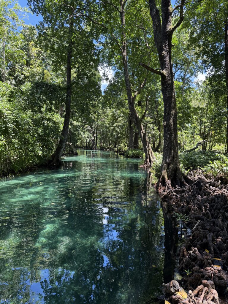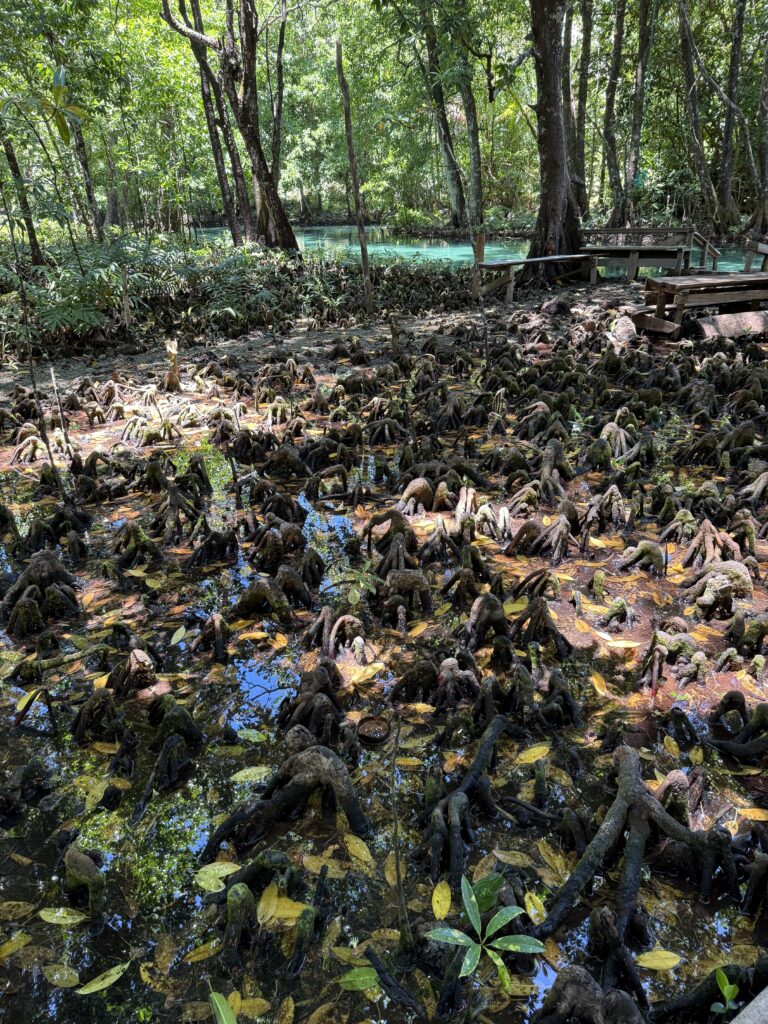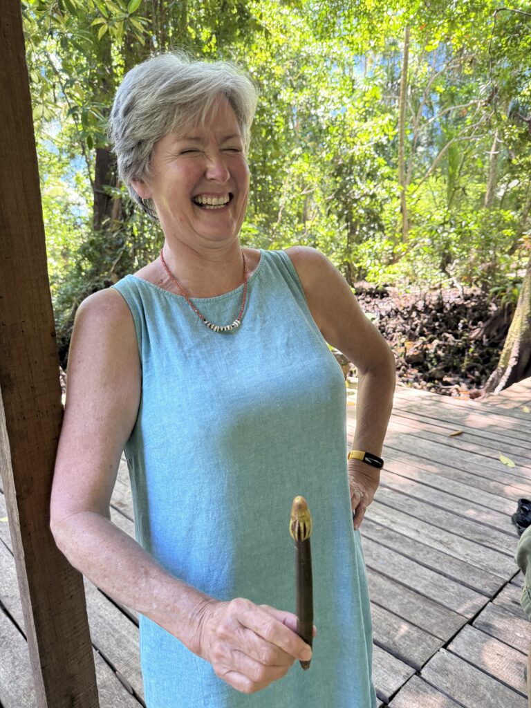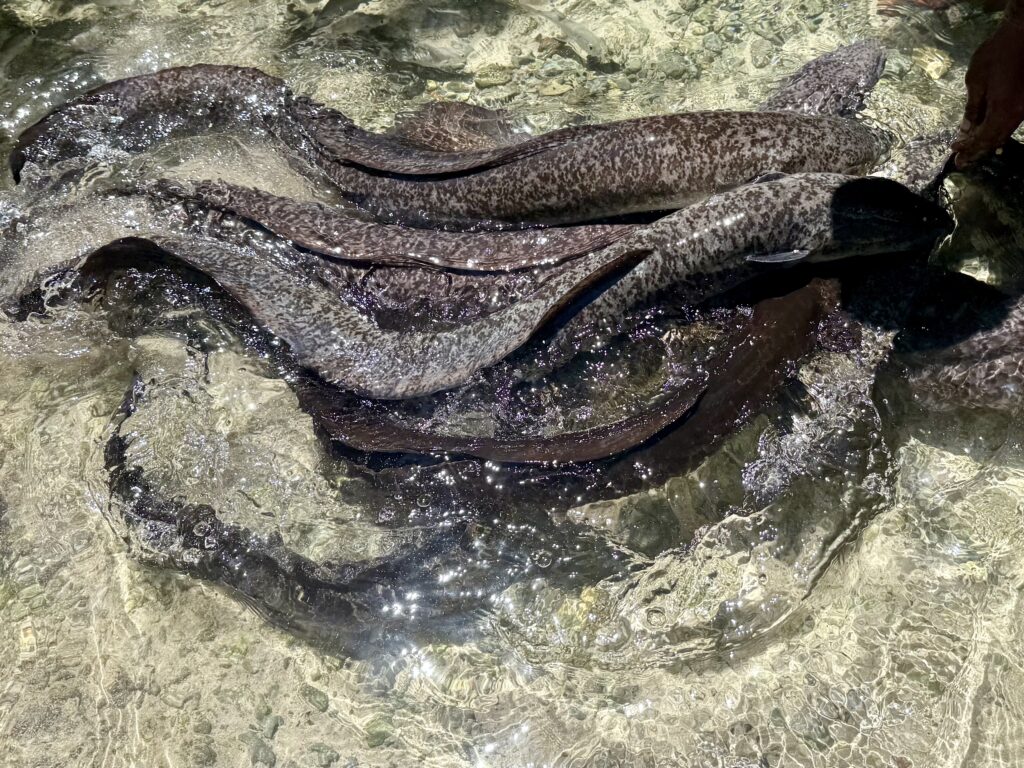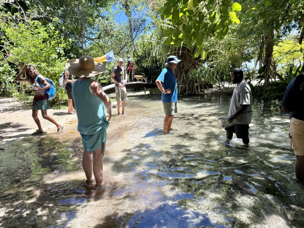 Jen on Profasea had organised a trip around a few sites on New Ireland. With Gran, Judith, and Profasea crew there were 7 of us on the tour, we had a very nice air conditioned minibus to take us around. We travelled for nearly two hours south down the coastal road of New Ireland. Lovely to see such neat villages with well kept garden and verges, it reminded me of Samoa. There were also miles and miles of Palm oil plantations, these palms get covered in epiphytes which is quite interesting. There is a big pulping station somewhere near Kavieng where they press the fruit (date like) into oil to ship. Our first destination was to an eel sanctuary, in a place called Laraibina. We had been told to bring some tinned fish to feed the eels. We arrived at this very clear fresh stream, the owner tipped a couple of tins of fish in the water and within seconds we had huge eels swarming around us. They were like the dogs, they liked to brush up against our legs, particularly Rowan’s! The photos will do it more justice.