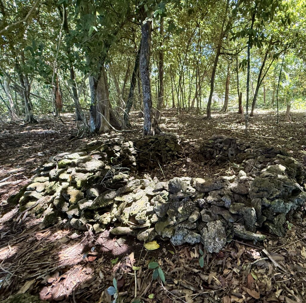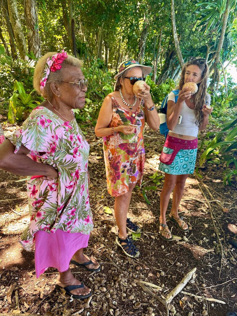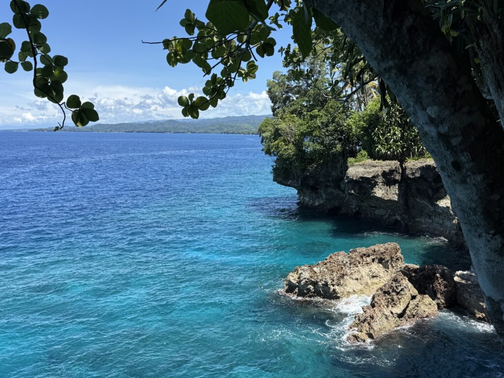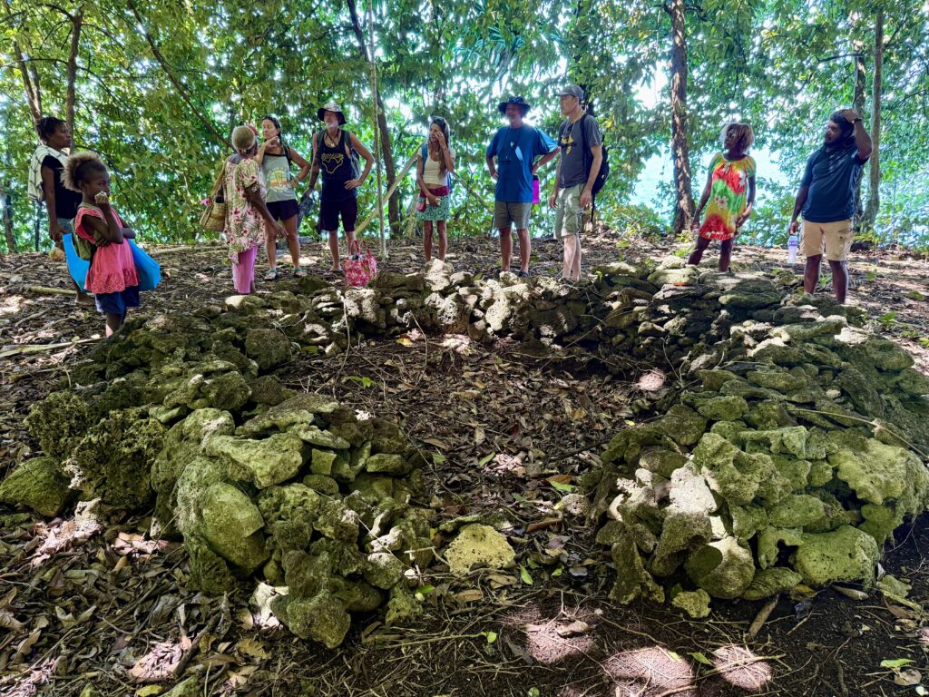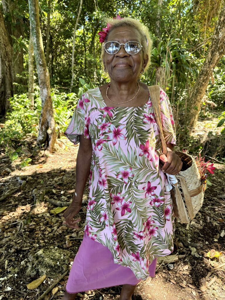 Another few miles down the coast to Furial Look Out, a spot the Japaneses used as a coast watch during WW2. We were greeted by a lovely old lady who owned the land. She was beautifully dressed with matching frangipanis in her hair and bag. Her english was very good, she said she went to university to be a bookkeeper for the mines. She obviously had a good job and has retired back to her family land. We walked through a freshly mown path to get to the coral cliff looking down onto the sea, it was amazing colour water with blow holes puffing through the eroded coral banks. They had cut some delicious coconuts, which was a very welcome and refreshing drink for us. Then she took us to this circular coral wall. She said the centre was all filled in now, but it had steps into a cave that led down to the sea. The Japs would arrive in their submarines, the troops would get up to the land through the cave to set up their look out from the top of these coral cliffs. All sounded very credible to me, Rowan was not so sure!