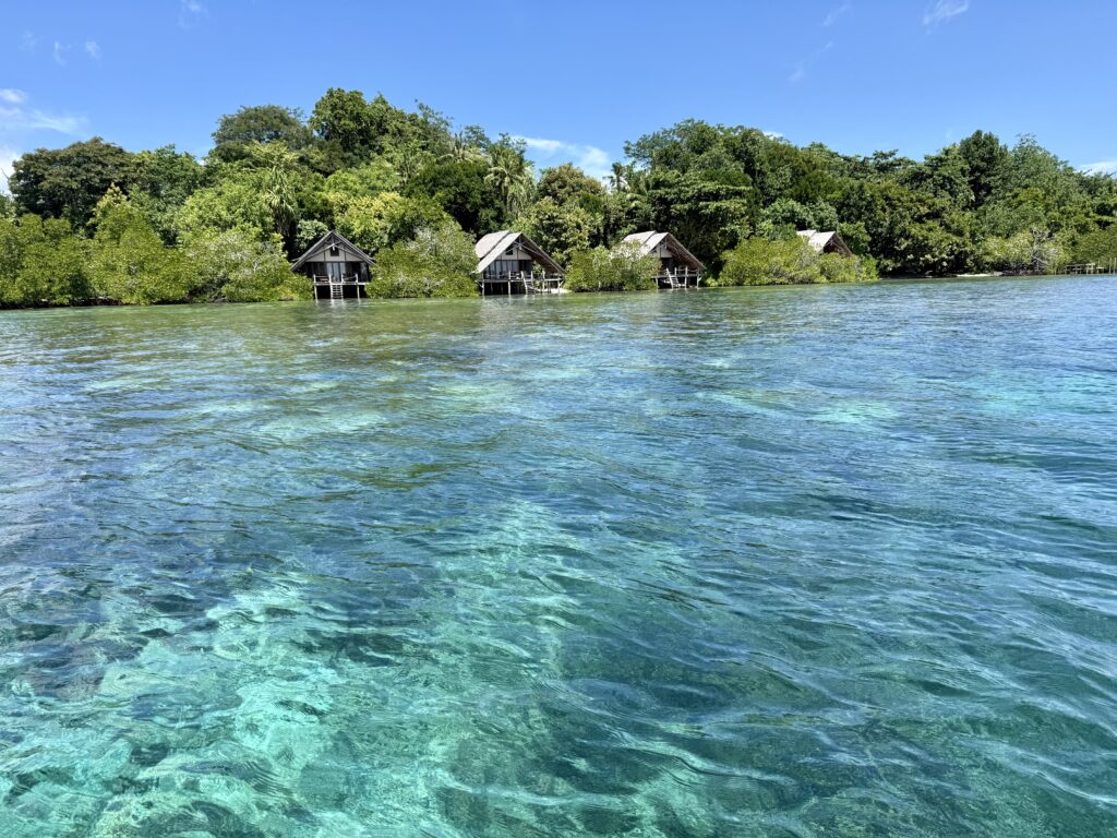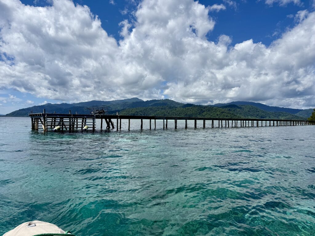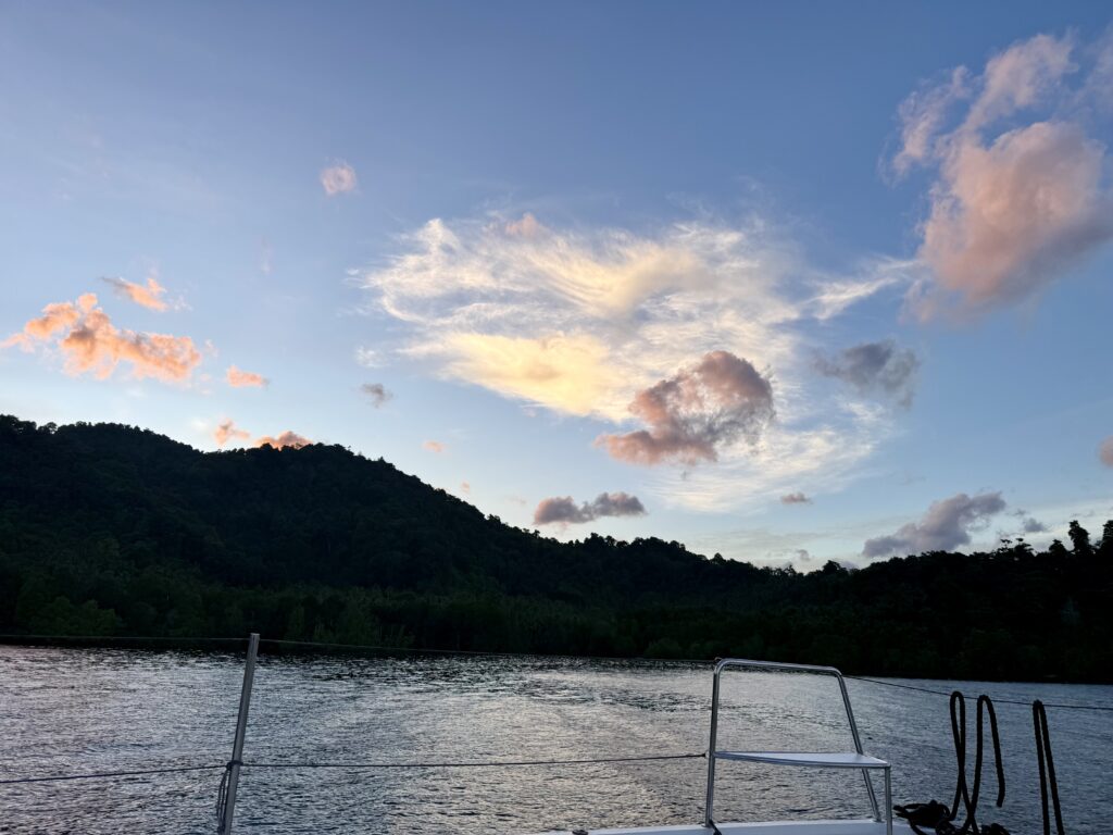 We were glad to have had a comfy night as the boat has been bounced around by the current, we have been hitting the waves side on. It is a very picturesque bay with lots of bird life, but the brown beaches and murky water with loads of mangroves make it look like croc heaven. We decided to stay put today and wait for less wind. We went over in the dinghy to the little island which has two resorts on it, they both look very nice, but not welcoming to outsiders, I don’t think too many yachts come this way anyway. It was a very rough bit of sea to cross to the island as the water gets forced through here creating biggish waves. It was a necessary bouncy crossing, as the snorkel sites are all around the little island, which is obviously why the resorts are here. We got in at the edge of the reef and the current rushed us along at speed. The coral and fish life were really good, just terribly sad that all the rubbish channels through here too. The worst rubbish we have swum in sadly. The visibility was not the greatest, but there were some interesting coral formations and plenty of fish. We were just getting to the end of the channel when I spotted a sea snake. Unusually it was dangling down from the surface of the water. You usually see them sliding through the coral. Rowan hadn’t seen it, and then it turned and came swimming towards us, I was scrambling all over Rowan to get out, as family know I’m not that keen on snakes! It went under the dinghy and I was out the water in a flash. I have my step ladder to get into the dinghy but you have to get your flippers off first! It was all a bit of a panic for me. Once it went under the dinghy Rowan could not see it any more so he just continued snorkelling for a little while. I’ve googled these Banded Sea Kraits ….. ‘While the venom of banded sea kraits ranks among the most toxic in the world, they are so docile and non-aggressive that humans are rarely bitten’, I’m taking some solace from this!