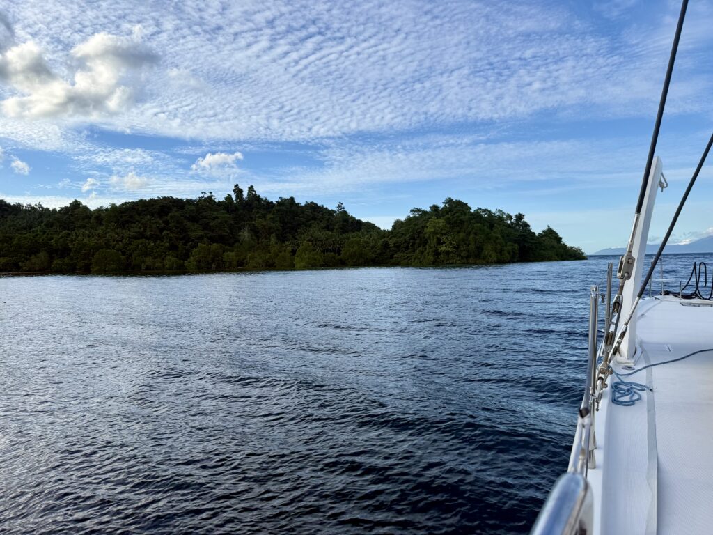 Rowan got back in the dinghy and we went a little further around the island to the jetty in front of the smarter resort and snorkelled from there. The coral was lovely, not quite so many fish, but the visibility was better. Rowan saw a shark when we first got in but I never saw it, he said it got a fright and sped off! We snorkelled to the end of the reef before getting out and circumnavigating the little island. It was pretty bouncy crossing back to PolePole, always pleased to see the pretty dodgy mooring line holding her still. We had a relaxing afternoon, and were amazed at the constant stream of long boats passing us by. They all have what sound like lawn mower engines that put put along. We can’t believe they are all fishing. There are many more villages and towns around the coast here, so assume they are going between towns. A few come into the bay, but we can’t communicate, they speak no English, so different from coming up through Vanuatu, Solomon’s and PNG. The boats are not laden with goods to trade like we saw in Solomon’s and PNG.