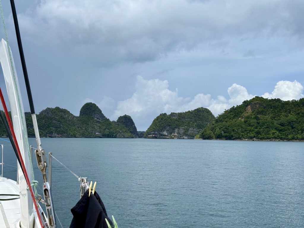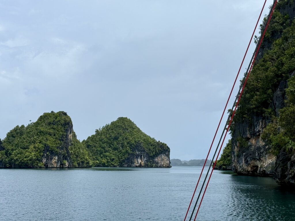 We managed to use our winch to wind the spare anchor up, it had got well and truly buried is some thick gloopy grey clay. It took us a while to manhandle the anchor back on board, with all the slippery clay spreading quickly all over the front of the boat. We then used a whole tank of water cleaning everything, washing the anchor with its chain and rope so that we can store it away again, crossing fingers we don’t have to use it again too soon. This meant we could get the old anchor and chain back on the windlass (anchor winch), so that we could use it immediately when we got into the anchorage. We headed straight back to our lovely anchorage under the cliffs with the roosting hornbills. Lioness (Rob and Pip) were in the anchorage too, we were so glad they had anchored the opposite side, so we could go back to our exact same spot. We will have a couple of nights here and head to Sorong on Saturday, overnighting somewhere en route, to be in the marina in Sorong on Monday. We have loads of things to get sorted as well as a big provision shop. Everyone we know who has been there says it is pretty uncomfortable in the marina, they have no water or electricity, and you have to use your dinghy to get to land. We have booked ourselves into a hotel for the few nights until Clinton (Rowan’s brother) arrives on the 26th.