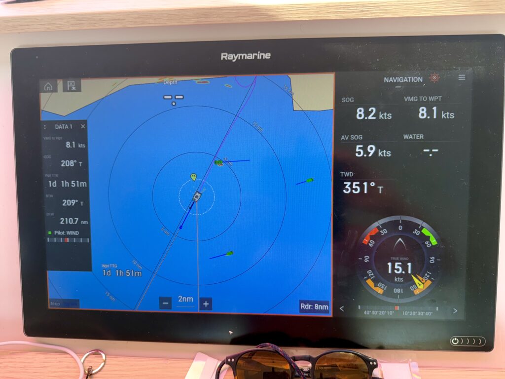 Doing 8 knots in 15 knots of wind , and the radar screen showing plenty of tankers about