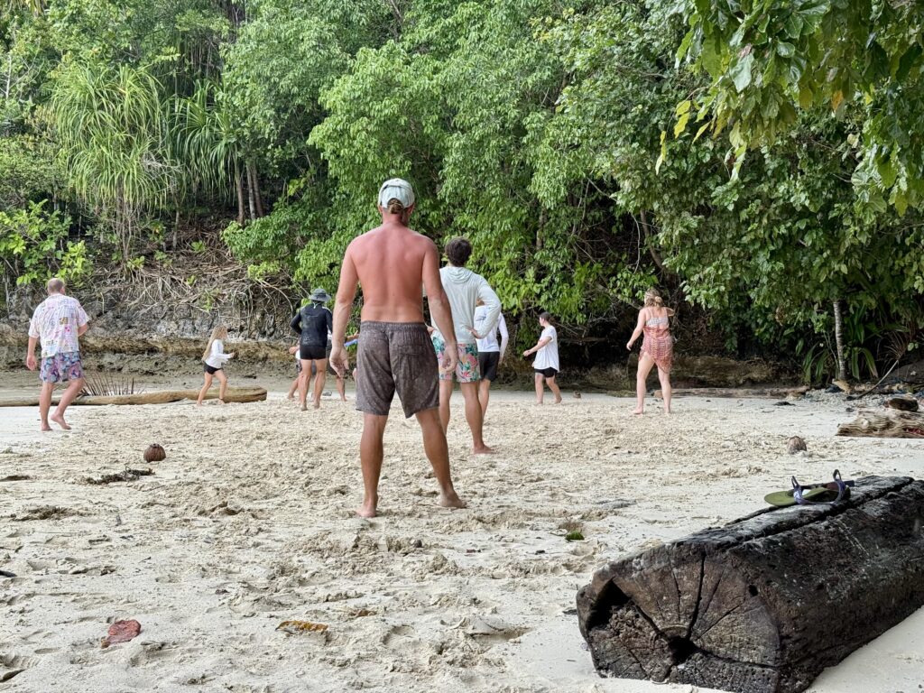 We headed to the resort for lunch, passing the other yachts along the way. We had a very good Indonesian lunch with the other residents, we were slightly nervous they might give us a Western Christmas meal. It was great to eat out and not cook in this heat, or tidy up! We were invited to join the 3 yachts anchored together for an afternoon of beach games and drinks. We went back to the boat after lunch to get our swimming togs, it was soo hot. Most of the time we were on the beach it drizzled with rain which was perfect for keeping us a little cooler. Milly and the boys all joined in on the frisbee throwing and beach volley ball, I was happier talking and drinking with the women! It was an interesting collection of boats and nationalities, Danish, Czech and Australian. The Danish and Czech boats had children on board, all home schooled, the Danish boat’s one daughter was 20, but does not want to give up sailing with them.