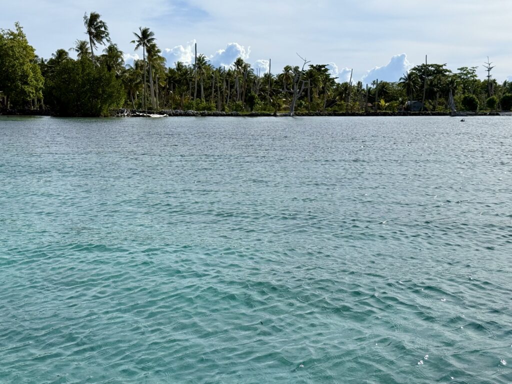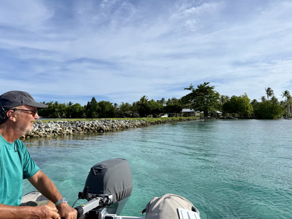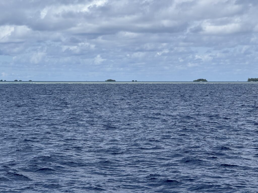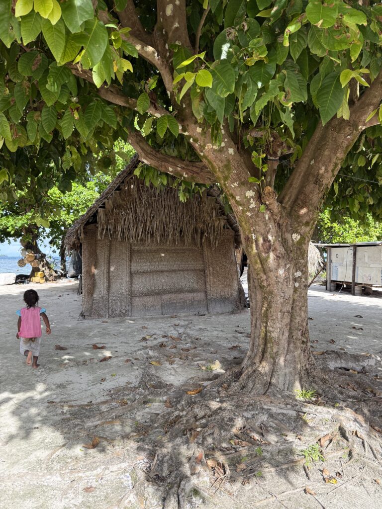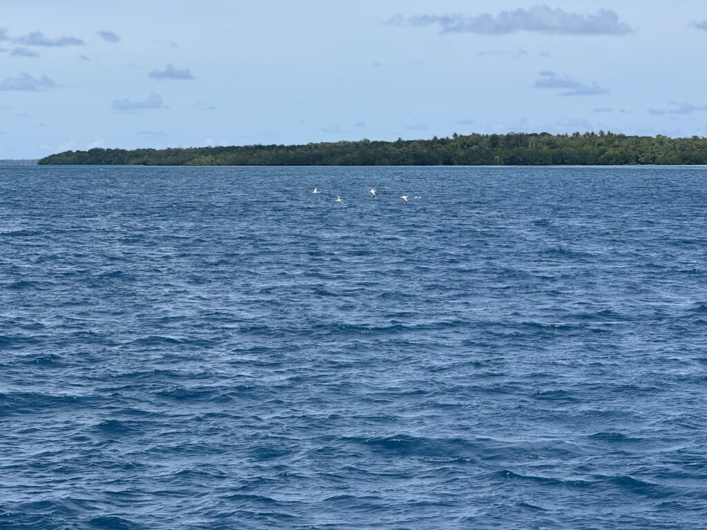 Rowan had managed to put 12:00pm on the alarm, so it was nearly 1am before we woke up. Exiting the pass in the dark is quite a mission but we had our track to follow that we came in on, we followed that faithfully. The only thing against us was wether we would still make slack tide, thankfully it went like clockwork and although there was turbulent water in the pass it was fine. Once out we got out into open waters we got Pinkz our Asymmetric spinnaker up. Thankfully in the dark it all went well and we were cruising along in low teen winds. We had a wonderful display of a couple of dramatic shooting stars. The sea had flattened out, and it was a really comfy sail the whole way to Nuguria Island, which is also an atoll, sadly it’s sinking into the sea with climate change. Rowan had discovered a tiny sandbank in the middle of the sea, not charted, which he has now marked on the charts to be avoided. When we got within a couple of miles we saw a huge fishing vessel near it, we discovered later in the village that it is shipwrecked there.