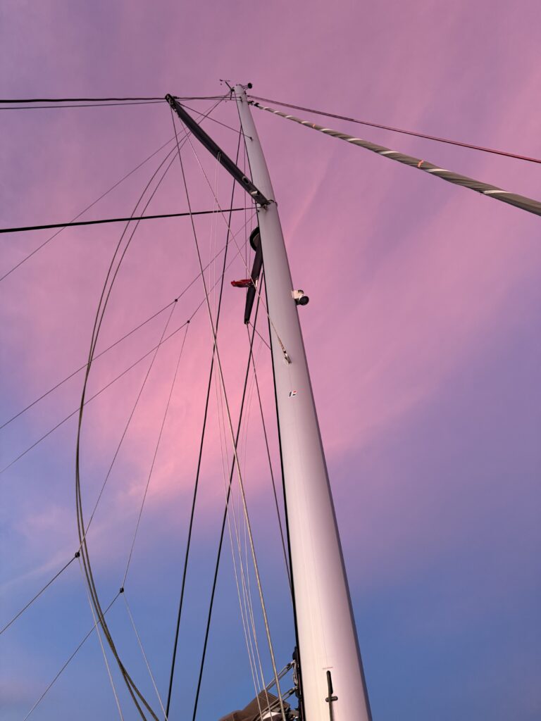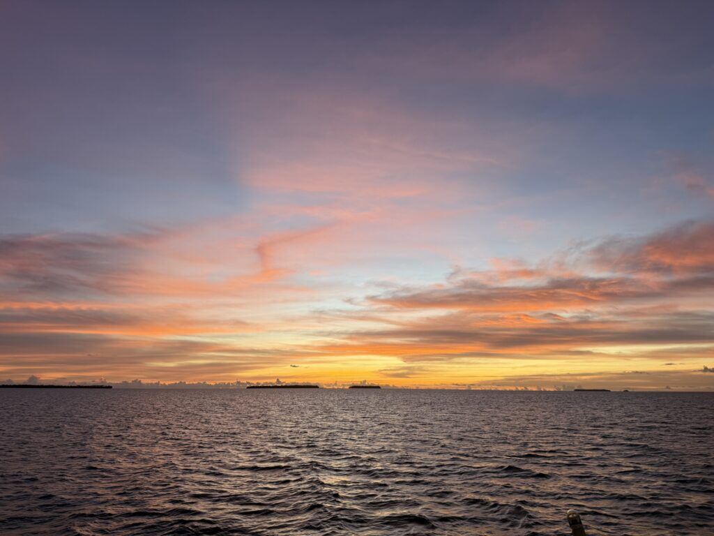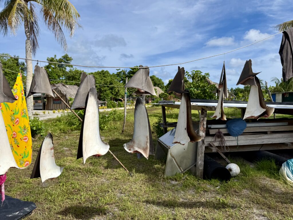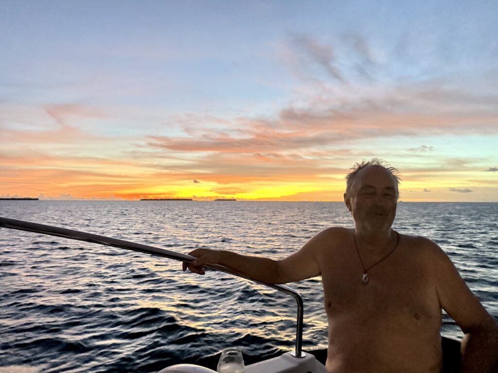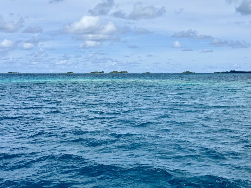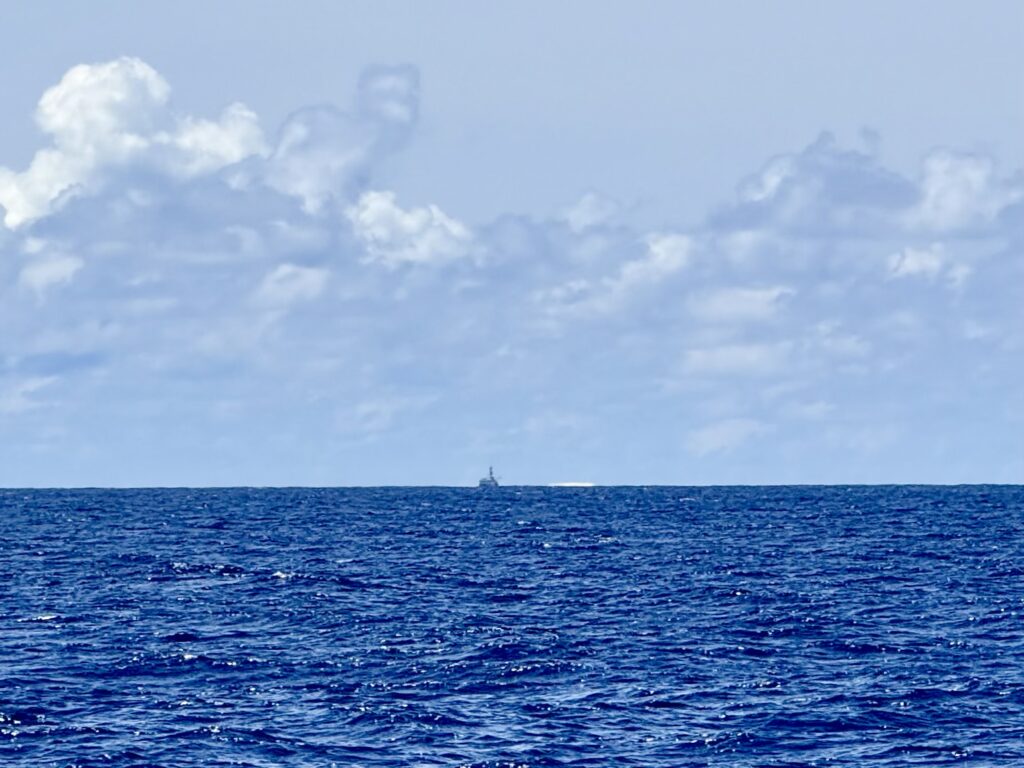 Rowan had managed to put 12:00pm on the alarm, so it was nearly 1am before we woke up. Exiting the pass in the dark is quite a mission but we had our track to follow that we came in on, we followed that faithfully. The only thing against us was wether we would still make slack tide, thankfully it went like clockwork and although there was turbulent water in the pass it was fine. Once out we got out into open waters we got Pinkz our Asymmetric spinnaker up. Thankfully in the dark it all went well and we were cruising along in low teen winds. We had a wonderful display of a couple of dramatic shooting stars. The sea had flattened out, and it was a really comfy sail the whole way to Nuguria Island, which is also an atoll, sadly it’s sinking into the sea with climate change. Rowan had discovered a tiny sandbank in the middle of the sea, not charted, which he has now marked on the charts to be avoided. When we got within a couple of miles we saw a huge fishing vessel near it, we discovered later in the village that it is shipwrecked there.