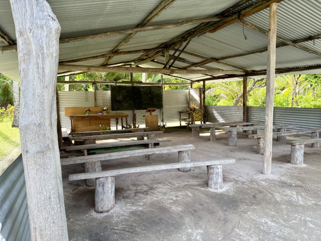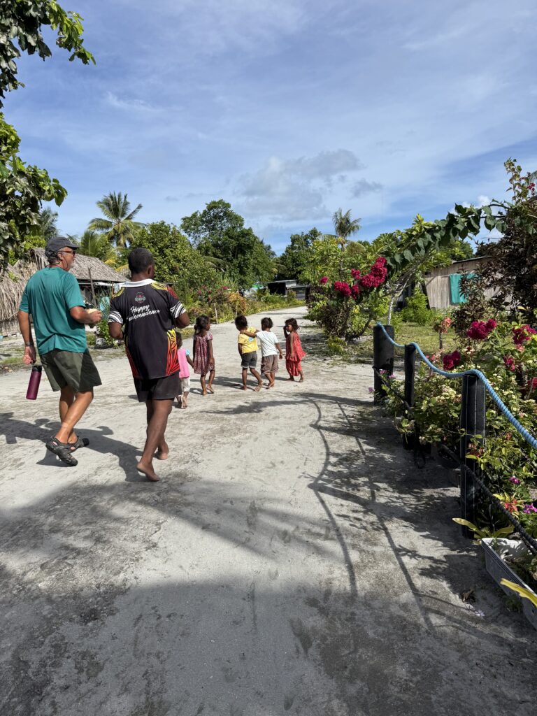 We got settled then headed to the village in the dinghy, laden with gifts. There was a little jetty to tie up to and we were greeted by two men, both chief elders and very friendly. The village has just over 200 residents, loads are young kids judging by the hordes who came to greet us, all very cute and jovial. Seats were produced for us and we had a long chat to the men. We said we had gifts and they told us we had to wait for Brian to arrive, he is the government chairman of the village. He was a much younger more quiet character, we laid out all the presents which they were very pleased with. Coconuts were produced for us to have a drink, and we handed out biscuits to the kids. The elders and Brian welcomed us effusively and assured us we were safe, and free to explore and snorkel everywhere in the atoll. They are really struggling with their island sinking, it appears a King tide a few years ago has done so much damage. Brian took us on a tour around the village. Sadly there are no big trees like in all the other islands we have visited, so the village was quite barren, but was immaculate with gorgeous gardens lining the main street through the village. They get a supply ship 4 times a year if they are lucky. They briefly had wifi on a government satellite installation but that hasn’t worked for most of the year. They have no idea when the boat will come. The nearest big town is Buka, a two day banana boat crossing with a stop over in Nissan Island. They have a tiny medical clinic which looked pretty closed. We visited the school and met the headmaster and his assistant, very jolly people. The thing that amazed us was the smart loos, all with modern composting bins at the back. Nowhere else have we seen such smart loos, they seem to be getting critical disaster aid from Australia. In the Solomon Islands we saw little loo cabins, but in Nissan Island we never saw any loos and wonder what they do. It certainly never smelled like they had a problem!
