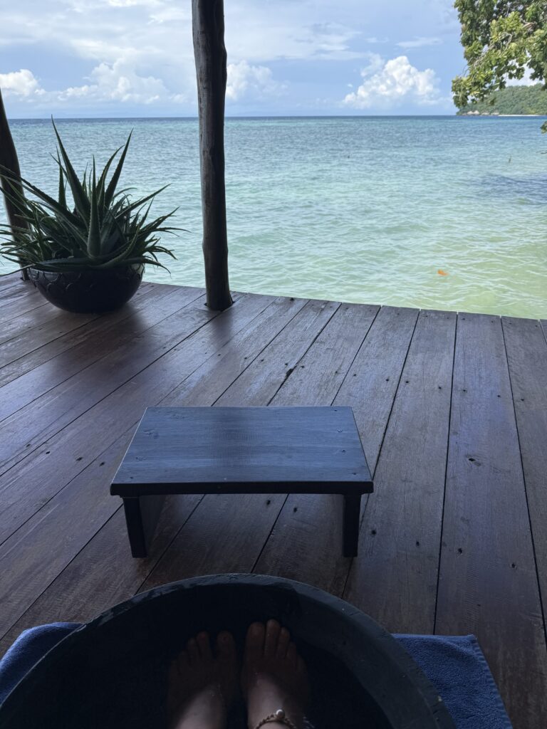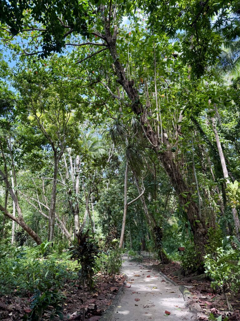 We went and did the snorkel around the little island that is next to the resort, it was rated on our NFL (No Foreign Land) App, but sadly besides the rubbish channelling through there it was a disappointing snorkel. So much of the coral was dead or on its way out and only small fish about. The little island has a huge abandoned Homestay on it. We can’t understand the amount of abandoned Homestays about, so sad, we think Covid must have knocked them. Thankfully they are all made with local wood and pandanus leaf roofs, so really they do not do too much damaged to the environment. Just sad to look at. We had booked in for lunch at the resort, they don’t do dinner, their house reef is rated as a good snorkel which we thought we would try after lunch. We dashed back to Polepole to get the saltwater off us before returning for lunch. The resort is full, run by a South African couple, sadly the lunch was underwhelming, serving European food rather than local Indonesian food. At least we know we won’t come back here. I had spotted their lovely Spa on the far end of the resort on a lovely beach and asked if I could get a pedicure, which they agreed to. What pampering, I left Rowan reading his book, he suffered a bit of a midday food coma as he couldn’t even bring himself to snorkel the house reef which had been the plan! I had a lovely time, the Spa was empty but for the local staff. My lady actually came from Bali, and has worked here for 5 years, she does 3 months on and then 3 weeks off, when she goes home to visit her husband and son. I asked why she doesn’t work in Bali as it is a huge tourist destination compared to here, she replied that she comes from a very remote place in Bali, it is easier to work here because the company pay her transport. I had a lovely foot massage looking over a stunning little beach in the cool sea breeze. It was a lovely walk through huge tall trees to the Spa, full of birds.