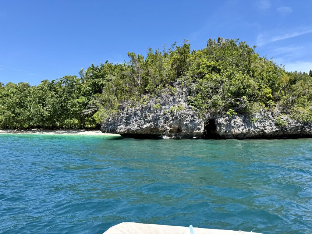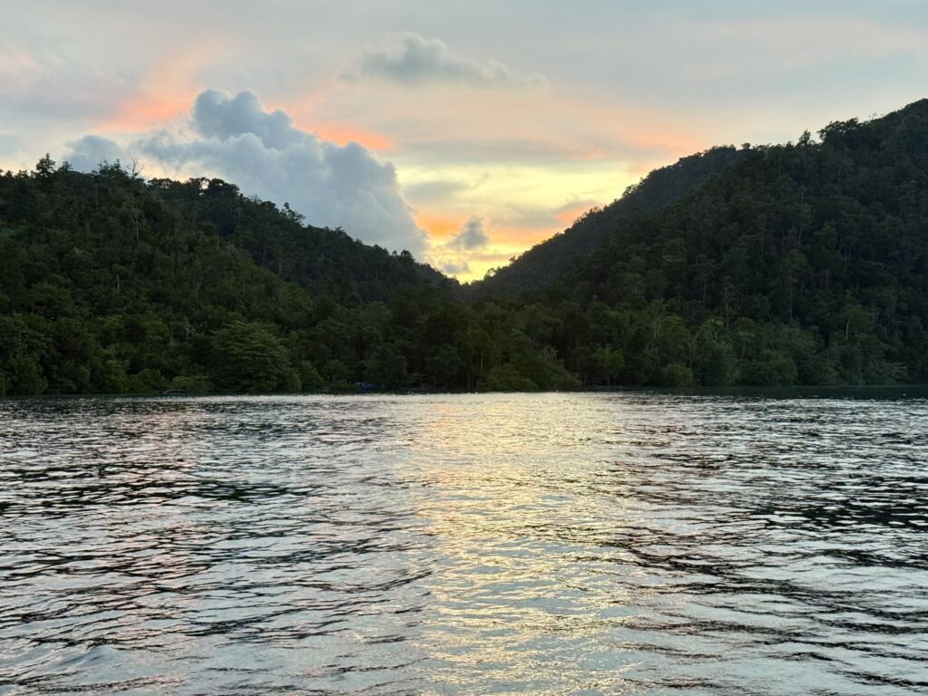 At midday we went out again in search of Mantas and this time we did see an enormous one glide beneath us. Rowan did see a couple of others but in the poor visibility I just could not make them out. We then had a very long snorkel around the islands. We came around one corner and found Chet and Jessy sitting on a gorgeous little beach have a bottle of bubbles. very decadent, they tried to persuade us to join them but we were on a snorkelling mission. The coral was absolutely stunning so much soft coral and very colourful. We did some serious work swimming against the current to get around the islands. I was always on the look out for crocs as there is a photo on the No Foreign Land App of a big croc right where we were swimming! The locals don’t seem bothered by them at all so we get a bit relaxed about it, but then we think of Kruno the Croatian who was attacked by a small one! The fish weren’t quite so abundant as in other places but the coral was spectacular. Sadly we have no photos to show you.