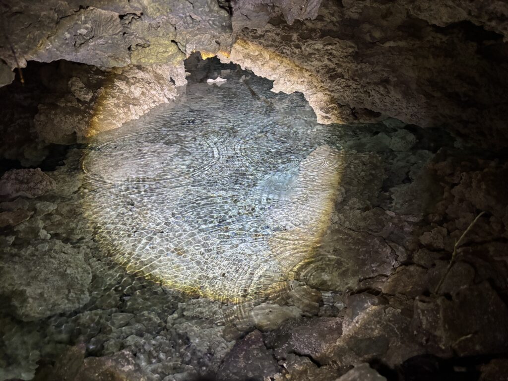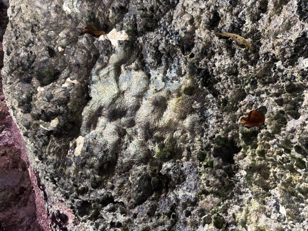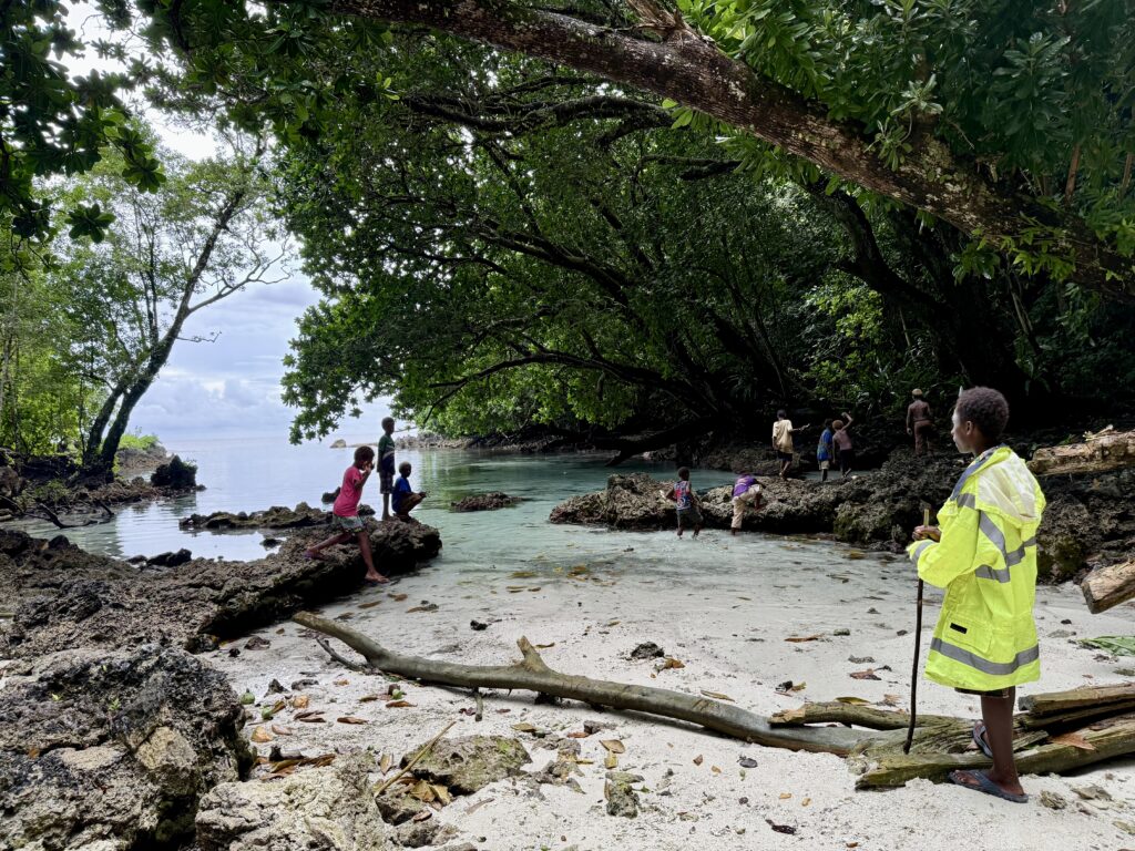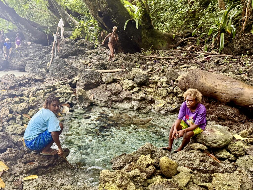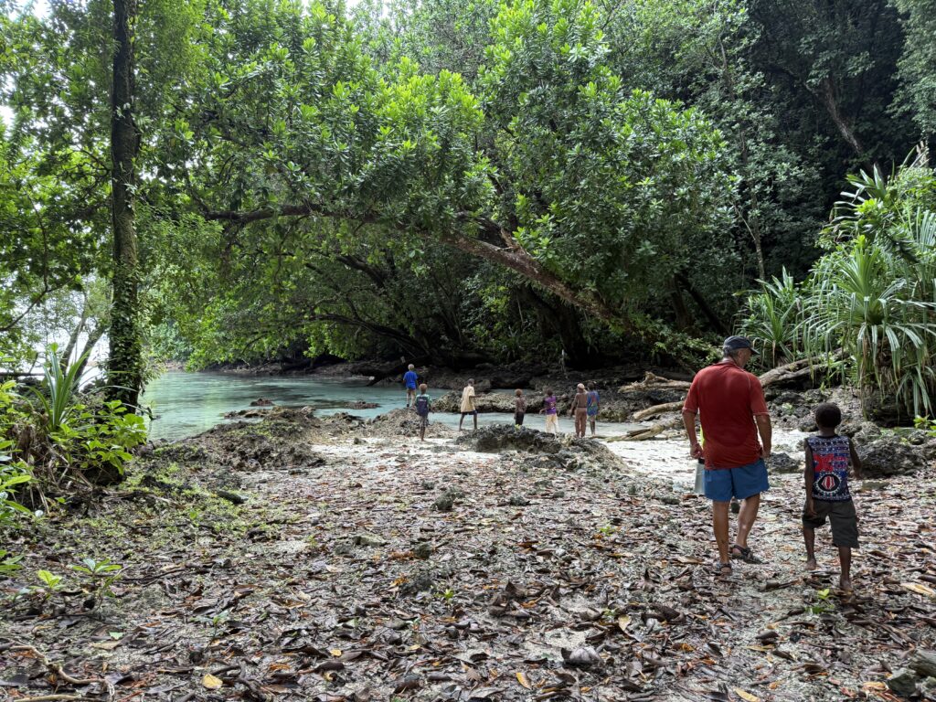 We asked to go for a walk and he appointed a young lad Tungsten his grandson, and two girls to accompany us to the freshwater cave, with a walk through the jungle. These three escorts were all teenagers, incredibly polite and thoughtful. We had a whole entourage of younger kids join us. It was all very jolly, a lovely walk through thick forest opening up to some homesteads, everywhere so neat and tidy. Interestingly here the pigs roam absolutely free, they are neither tethered or enclosed, and look in great condition, unlike so many of the other islands. The bird and insect noise was phenomenal, birds were mainly the very colourful red and green parrots. We finally got to the cave with the fresh water pouring in, it opened into a wonderful hidden little bay with amazing colour water. They wanted to show us a shark fossil that required walking over the spiky coral, which was absolutely perilous for us, but they were like klipspringers (an African buck that runs over rocks!), running all over it and barefoot. I had a girl either side helping me along. Finally we decided it was crazy, if one of us fell we would be in a real pickle with a nasty coral cut, Rowan finally swam around to the cave, Tungsten carried his phone over for him to take a photo. Rowan was not that impressed, he didn’t think it was a fossil but a local legend. I opted to swim back to the little beach rather than walk over the coral, the girls took my bag, in all my clothes I sank into blissfully cool water, the fresh water comes underground and is deliciously cool.