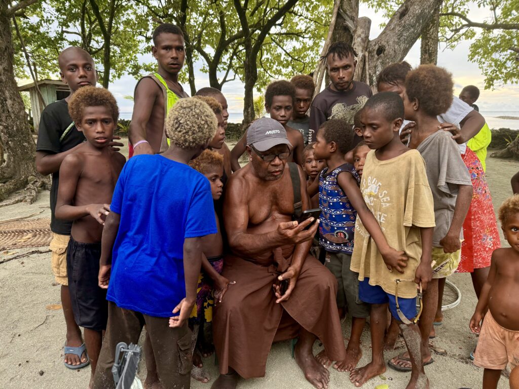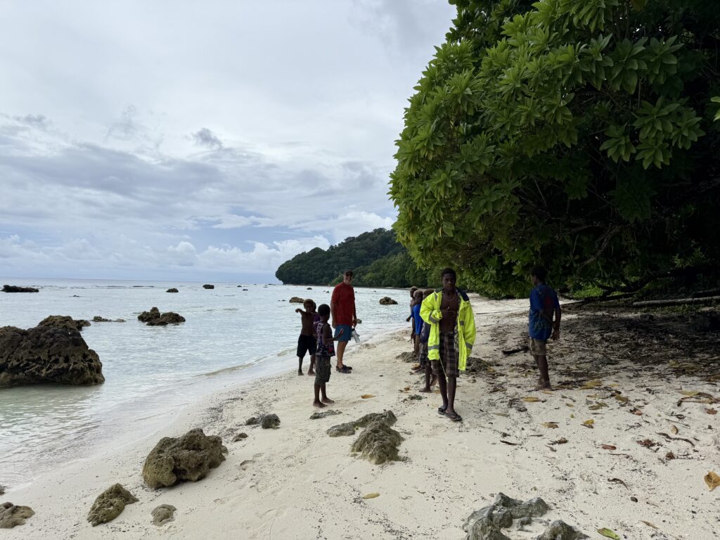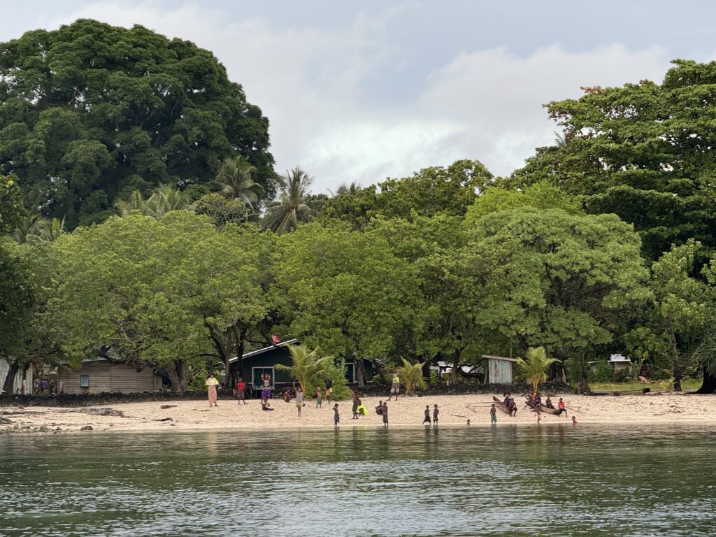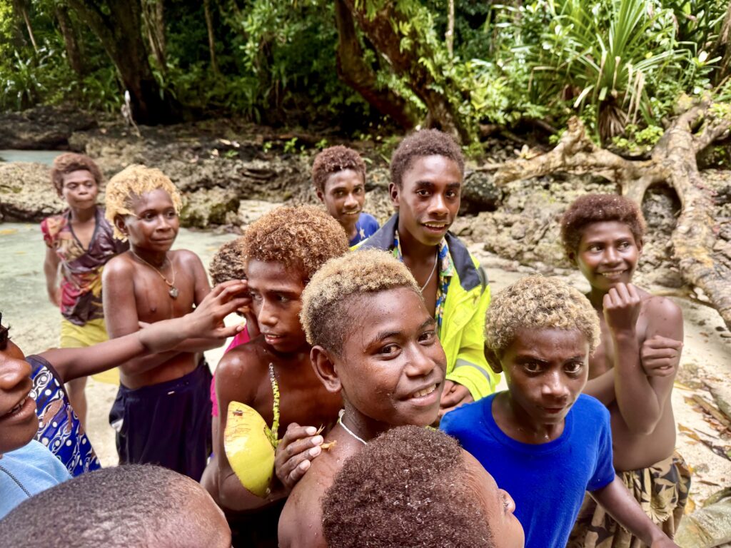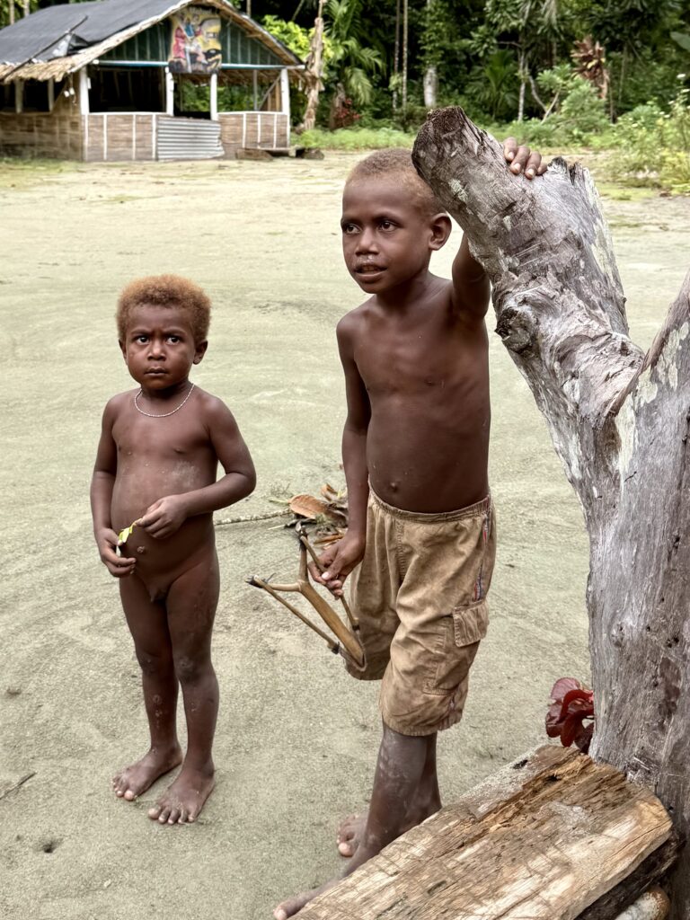 Humphrey the chief’s son came out to greet us, I still can’t get used to the sinister red mouths from the betel nut, the added scraggly teeth that go with it, is very sad. I’ve just asked ChatGPT about the health problems associated with it, and it is dire. Same addiction level as nicotine, a big cause of cancer and destroys the enamel on teeth, causing tooth loss. Ugh and to think we saw kids of about 3 years old chewing it! We headed in to see Chief Linus after breakfast. Plenty of kids in canoes to guide us through the reef to the beach in front of the village. The water colour is sensational.