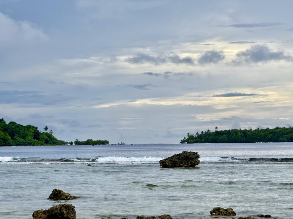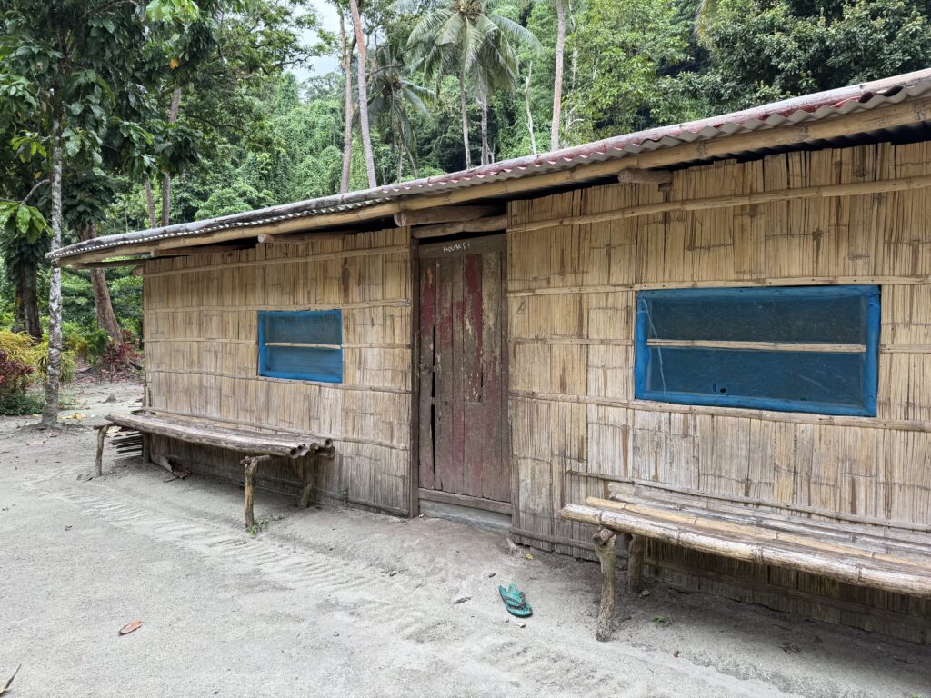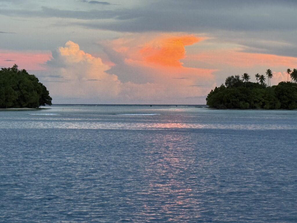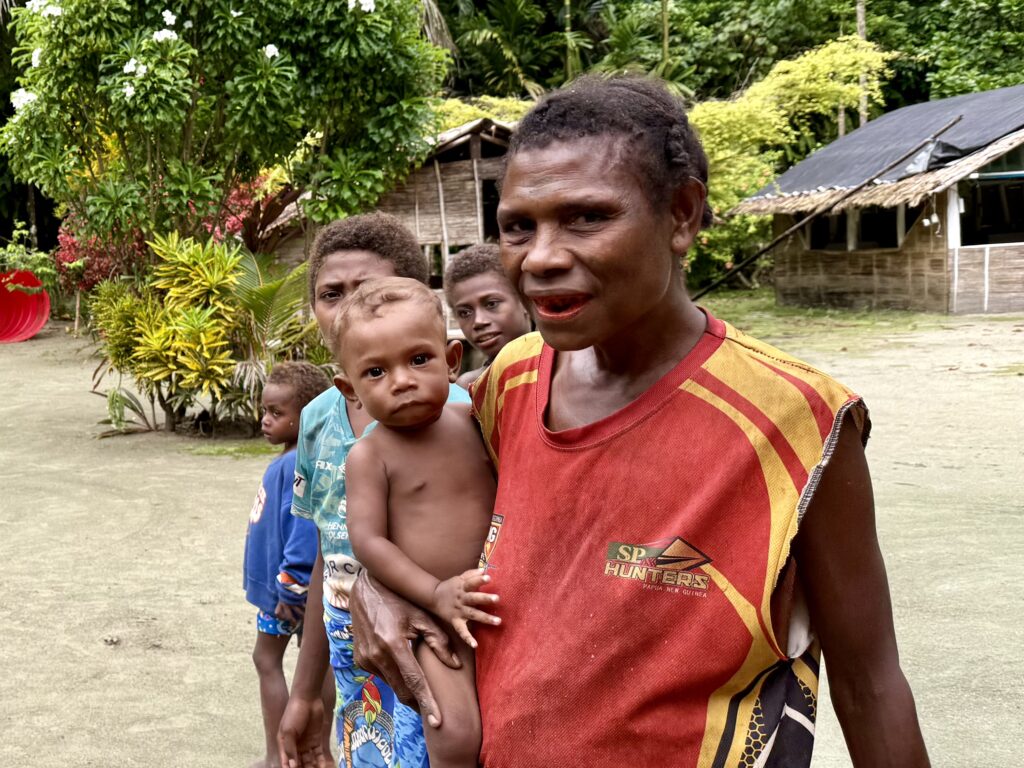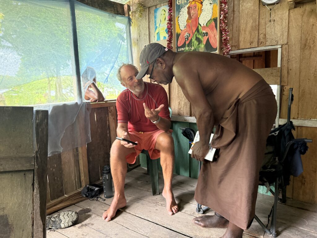 Humphrey the chief’s son came out to greet us, I still can’t get used to the sinister red mouths from the betel nut, the added scraggly teeth that go with it, is very sad. I’ve just asked ChatGPT about the health problems associated with it, and it is dire. Same addiction level as nicotine, a big cause of cancer and destroys the enamel on teeth, causing tooth loss. Ugh and to think we saw kids of about 3 years old chewing it! We headed in to see Chief Linus after breakfast. Plenty of kids in canoes to guide us through the reef to the beach in front of the village. The water colour is sensational.