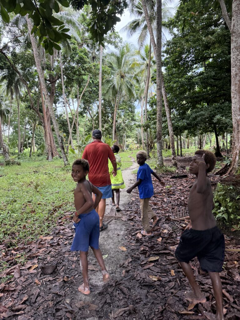 The kids were very chatty all the way. There is a gold mining island about 40 miles away, where Tungsten’s dad works, which means he doesn’t see a lot of him.  Us cruisers are told to avoid the islands with mines on them as they are not safe. I’m happy to avoid them, I hate to think what the conditions are like, but it is owned by Newmont mining which is American so should be respectable one would hope! Chief Linus greeted us on our return, very concerned we may have over exerted ourselves! It was the most exercise we have had in ages but we definitely did not over exert ourselves.