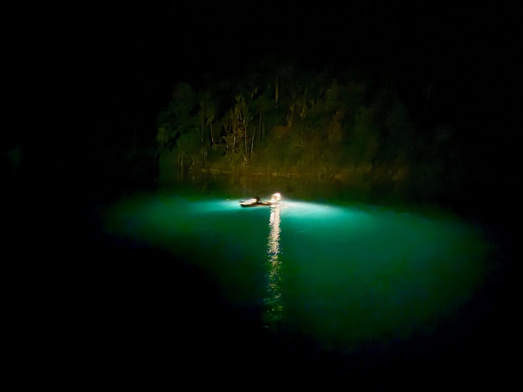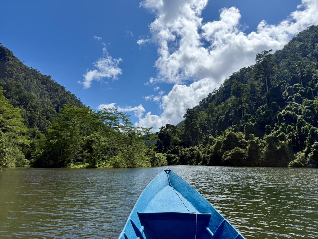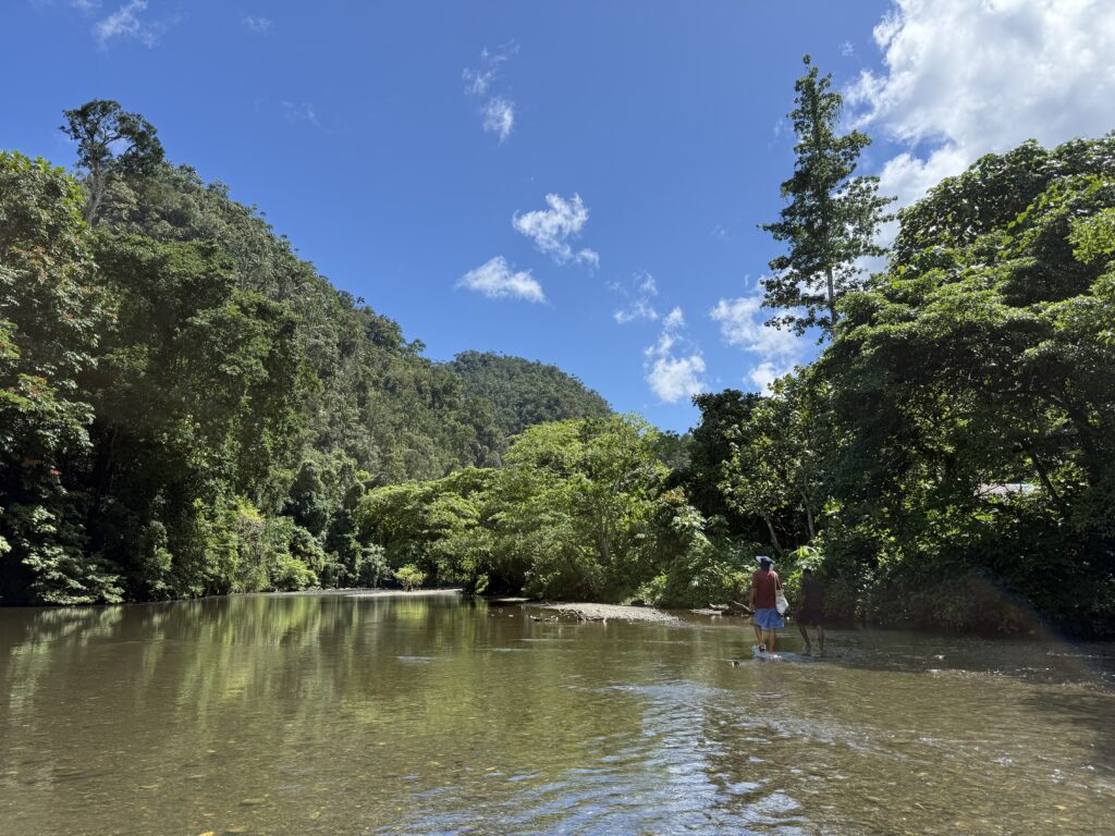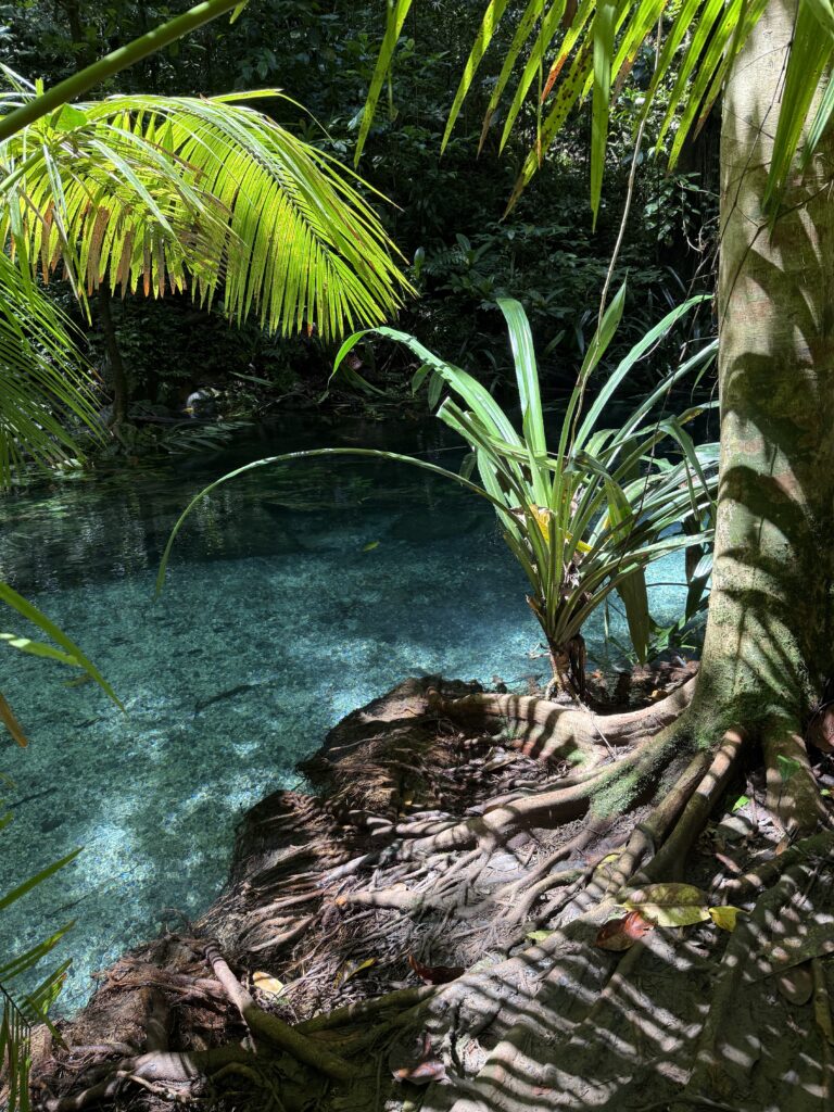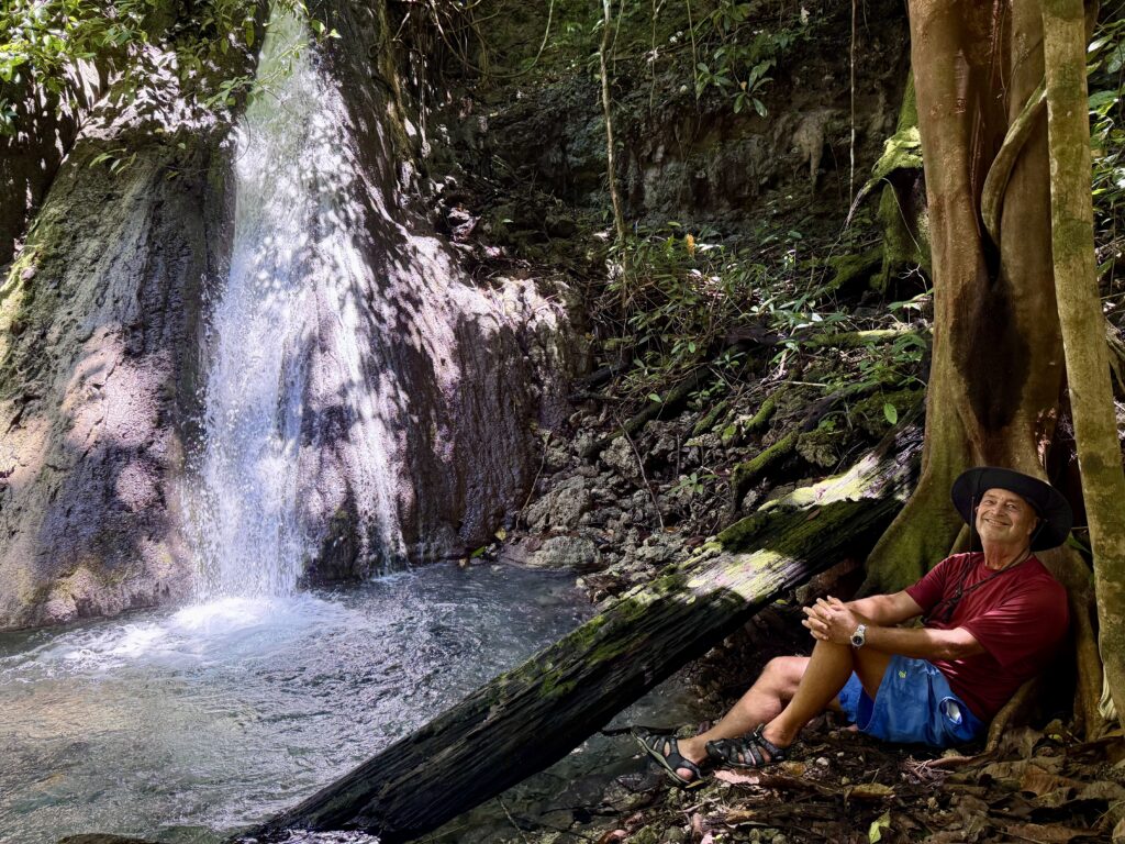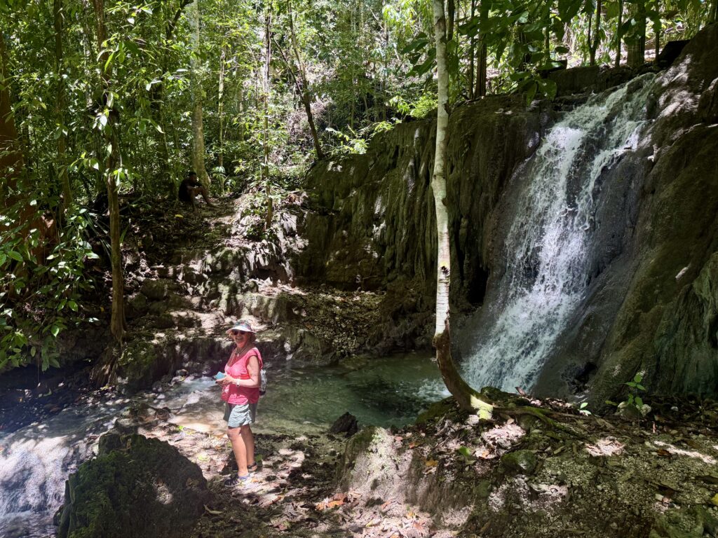 We headed back to the boat and Nathan took us to another site with a waterfall, tumbling down steps of limestone rocks. It was also cool but not nearly as enticing as the blue river, so we didn’t swim here. He took us back to the village for a very refreshing coconut and gave us an extra two to take with us, which was very welcome. We are enjoying a glass of coconut water every day. Especially good for us replacing all the minerals we are sweating out!