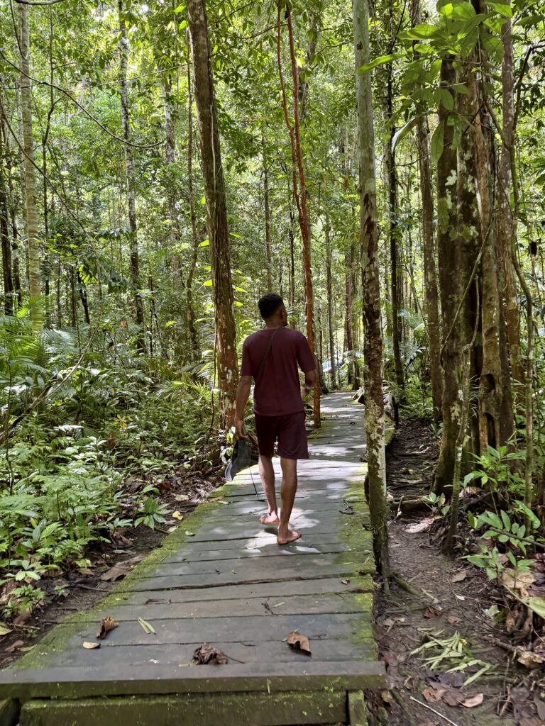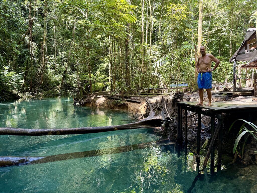 Nathan being so eager was a good half hour early to pick us up, we got going just before 10am. We headed up a river that was just around the corner from us, it was pretty shallow which is why we wanted to go in Nathan’s boat. We went a couple of kilometres up and then walked the rest of the way. The first part of the walk was in the river and then onto a walkway. It was another kilometre to the blue river which was impressively blue. We jumped into swim, the water was deliciously cool, and incredibly clear. It was virtually impossible for me to swim upstream as the torrent was so strong. Rowan headed a little bit further and was soon called back by Nathan. It is a spiritual place and forbidden to go further up the stream. There were two shelters, Nathan told us one belonged to the military and the other to the police. We had finished our swim when a group of tourists arrived, we were so pleased to have had the place to ourselves for our swim. It wasn’t long and there was another couple of tourists. They are all staying at local Homestays. The first big group was from France, turns out an Indonesian lady married one of the french guys, they live in France and have come out on a big French family outing. Her English was perfect and she had lots of stories to tell us. One was that this place used to be a test for the military, new candidates had to spend 12 hours in the cold water and if they survived they could go to war.