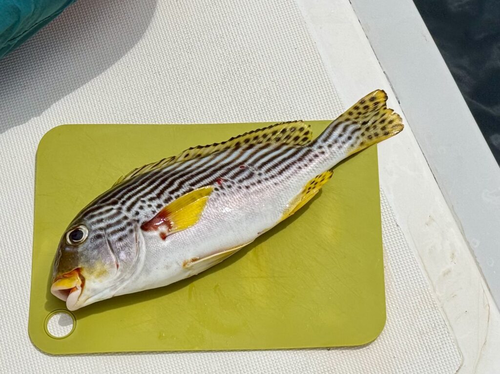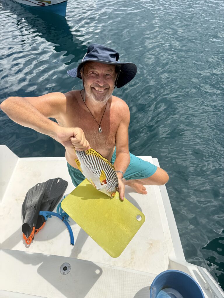 Rowan cooked up a storm for supper with all his ingredients from the market, plus he bought a Sweetlips fish off Dan, such a beautiful fish with the plumpest big juicy yellow lips. He made a delicious vegetable dish with the local spinach and pawpaw flowers, which he had to boil in tamarind to get the bitterness out of the flowers. Accompanied with the usual aubergines on the BBQ but this time with a delicious tomato chilly sauce. It was a great feast, only marred by the stormy rainy weather which brought out thousands of small flying ants, that forced us to turn out all the lights. It was carnage, we finally opted to go to bed, luckily we had closed the door and all the windows have mosquito nets on so it was a sanctuary. With our new aircon we were happily in bed early!